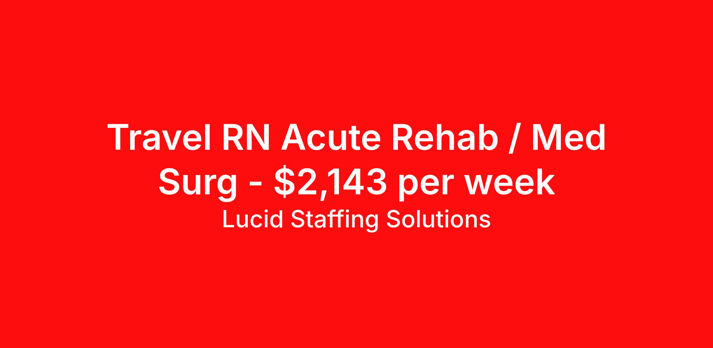 Lucid Staffing Solutions is seeking a travel nurse RN Rehabilitation Med Surg for a travel nursing job in Hazard, Kentucky. Job Description & Requirements Specialty: Rehabilitation Discipline: RN Duration: 13 weeks 36 hours per week Shift: 12 hours, days Employment Type: Travel Job Description Position: Travel Registered Nurse (RN) with experience in Rehab Location: Hazard, Kentucky Shift: hr Day Weekly Gross: $2143.48 Lucid Staffing Solutions was created by former healthcare workers who lived the short staffing, the chaotic workflows, and the nonstop pressure that comes with patient care. We built an agency powered by real clinical experience, kept simple and supportive, so you never have to guess whether the people guiding you actually know what they’re talking about. Minimum Requirements: Active license as a Registered Nurse (RN) Licensed in Kentucky (If applicable) or compact eligible Two years of recent Rehab experience Active BLS Why Lucid Works for Travelers Paid Weekly: Stipends pushed to GSA limits whenever possible $500 Travel Reimbursement: Paid at the start of each assignment Clinician-Led Team: Recruiters and Account Managers with real clinical experience In-House Compliance: fast updates, real communication, and none of the delays that come with outsourced vendors. Health Coverage Options: Multiple medical plans plus dental, vision, and workers compensation 401(k) Match: 4 percent match after 6 months License & Certification Reimbursement: We help cover the cost of staying compliant Liability Insurance: Included automatically Referral Bonuses: $500 per referral, $750 after five referrals Ready to start your journey? Apply today to connect with a Clinician-Recruiter! Lucid Staffing Solutions Job ID 36285. Pay package is based on 12 hour shifts and 36 hours per week (subject to confirmation) with tax-free stipend amount to be determined. Posted job title: Rehab About Lucid Staffing Solutions Clinician Owned & Operated At Lucid Staffing Solutions, we do things differently—because we’ve been in your shoes. Founded by actual healthcare professionals, Lucid was built to fix the issues we experienced as travelers. We know what makes a great assignment: competitive pay, seamless onboarding, honest recruiters, and most importantly—working with a team that truly sees and supports you. Our entire team is made up of former clinicians who understand the demands of the job and what travelers truly need to succeed. We offer some of the highest paying allied health and nursing contracts across the country, along with some amazing benefits & perks. Whether you're chasing freedom, flexible schedules, bigger paychecks, or your next adventure, Lucid helps you get there—with real support, real respect , and real healthcare experts. Benefits Dental benefits Medical benefits Vision benefits