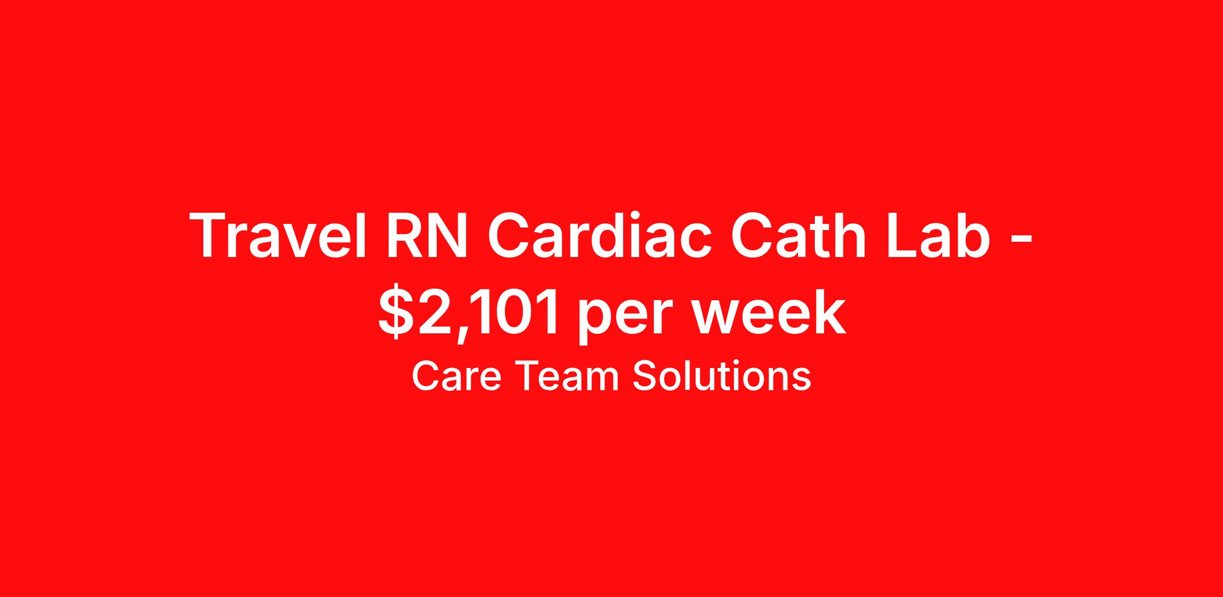 Care Team Solutions is seeking a travel nurse RN Cardiac Cath Lab for a travel nursing job in North Charleston, South Carolina. Job Description & Requirements Specialty: Cardiac Cath Lab Discipline: RN Start Date: 03/30/2026 Duration: 13 weeks 36 hours per week Shift: 12 hours Employment Type: Travel Registered Nurse must have 2 years of recent experience in particular specialty Details: Must Have 2 Years of recent Catheterization Laboratory experience. Specialty: Catheterization Laboratory Discipline: Registered Nurse Start Date: 2026-03-30 Duration: 13 Weeks Shift: 12 Hours Overnight shift. Hours Per Week: 36 Hours Employment Type: Contract Gross Weekly Pay: $2101.46 Six things that won’t happen if you apply to this job: You won’t have to guess what the downsides are. We’ll tell you up front. You won’t show up on day 1 and find out this is not what you signed up for. We won't leave your phone call ringing when it's inconvenient. Business hours for you are business hours for us. You won’t get shuffled to some customer service rep when a problem pops up. If we screw up something in securing your placement, we'll own it. That means it's on us to make it right. You won’t figure out your credentials alone. Our credentialing experts will walk you through it step by step. We've talked to thousands of travel nurses like you. We know you want good pay. You want to choose when you work. But the one thing nurse after nurse has said they want and don't have is someone in their corner. There's a lot in this business that’s messed up. We’re trying to be the people that fix it. You and every nurse with the guts to travel deserve it. We've worked hard for you to enjoy some one-of-a-kind benefits you'll not likely find anywhere else, because they benefit you more than they benefit us: Our early pay program Student loan reimbursement Free well-being tele-visits with a psychologist Care Team Solutions Job ID 585359. Pay package is based on 12 hour shifts and 36 hours per week (subject to confirmation) with tax-free stipend amount to be determined. Posted job title: Backfill - Travel - RN - Cath Lab (746) - Trident Regional MC / 7:00PM - 7:00AM About Care Team Solutions Two brothers who give an enormous damn. We're Justin and Kyle. Neither of us are nurses. It doesn’t take a nurse to see that the way travel nurses are treated sucks. Nursing is already hard enough. Travel nursing takes serious guts. You get the toughest assignments in places you’ve never been. Which can be fun, but it’s also stressful. You’re in your element but outside of your hometown. You can be a stranger on the team. If anyone deserves someone in their corner, it’s you. But that’s not how most agencies operate. Which is why travel nurses hate working with them. We got into this business because we saw bucket-loads of nurses moving through the "churn and burn" travel machinery. We absolutely hate that. You'll do your best work when you have the placements you want and feel fully supported in your work. We pay our people well because we want them to treat you well. Our recruiters are amazing (we picked each of them ourselves), but if you've got a problem too big for them, they can come straight to us. We work like ten feet away. The "Churners and Burners" promise you the same benefits. They might as well copy/paste them from each other. We have them too: 401k, holiday pay, healthcare, dental, travel reimbursement, etc But we've worked hard for you to enjoy some one-of-a-kind benefits you'll not likely find anywhere else, because they benefit you more than they benefit us: Our early pay program Student loan reimbursement Free well-being tele-visits with a psychologist Benefits Weekly pay Holiday Pay Guaranteed Hours 401k retirement plan Wellness and fitness programs Referral bonus Medical benefits Dental benefits Vision benefits School loan reimbursement