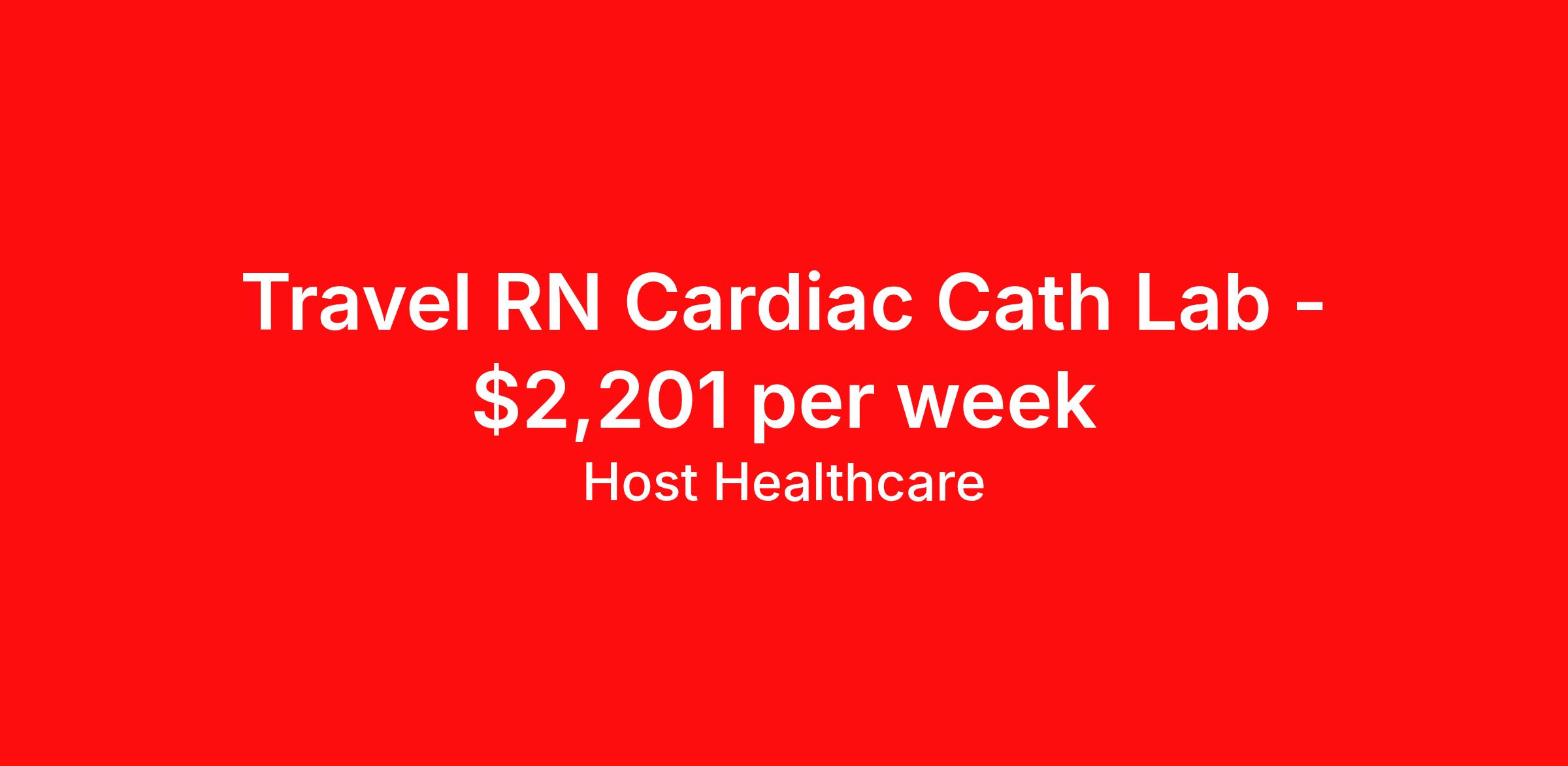 Host Healthcare is seeking a travel nurse RN Cardiac Cath Lab for a travel nursing job in Charleston, South Carolina. Job Description & Requirements Specialty: Cardiac Cath Lab Discipline: RN Start Date: 03/30/2026 Duration: 13 weeks 36 hours per week Shift: 10 hours, nights Employment Type: Travel Host Healthcare Job ID a1fVX000002tO3lYAE. Pay package is based on 10 hour shifts and 36 hours per week (subject to confirmation) with tax-free stipend amount to be determined. Posted job title: RN - Cardiac Cath Lab About Host Healthcare At Host Healthcare, we provide a truly comfortable experience as you explore your travel nursing, therapy, or allied career. We make your travel healthcare journey easy by taking care of all the details, so you don’t have to. We are on a mission to help others live better and we do this by helping the healers of the world be as comfortable as possible. With access to tens of thousands of travel nursing, therapy, and allied jobs in all 50 states, our responsive and friendly recruiters find your dream position based on what’s important to you. During your assignment, get access to premium benefits, including Day 1 medical that continues up to 30 days between assignments, 401K matching, travel reimbursements, dedicated housing support, and more. We also offer 24/7 support from our team and access to our on-staff clinicians so you can feel comfortable and confident throughout your entire assignment. Travel comfortably with Host Healthcare. Benefits Referral bonus School loan reimbursement Vision benefits Wellness and fitness programs Company provided housing options License and certification reimbursement Life insurance Medical benefits Mileage reimbursement Pet insurance Discount program Employee assistance programs Guaranteed Hours Health savings account Holiday Pay 401k retirement plan Continuing Education Dental benefits