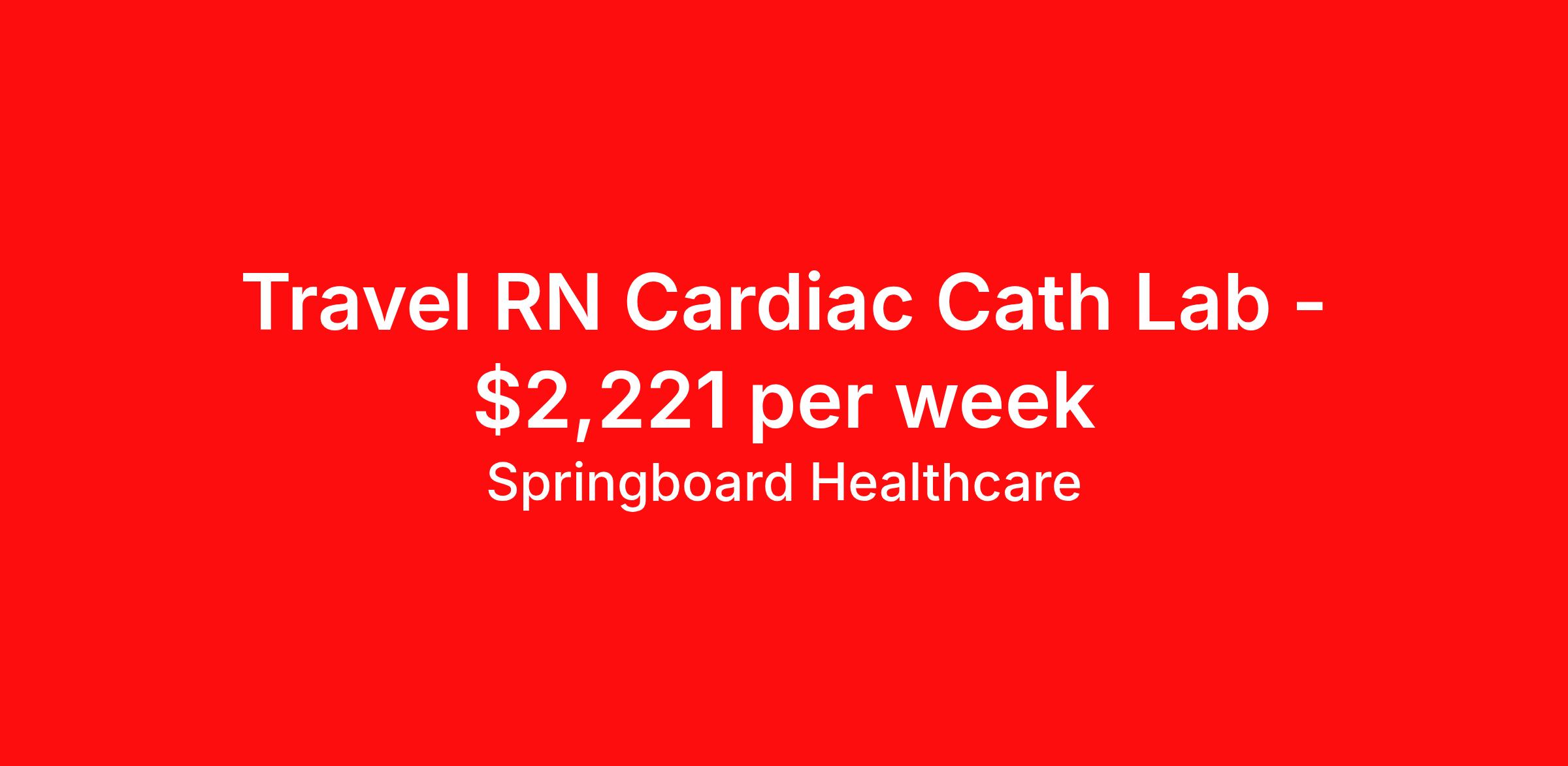 Springboard Healthcare is seeking a travel nurse RN Cardiac Cath Lab for a travel nursing job in Charleston, South Carolina. Job Description & Requirements Specialty: Cardiac Cath Lab Discipline: RN Start Date: 03/30/2026 Duration: 13 weeks 36 hours per week Shift: 12 hours Employment Type: Travel Springboard Healthcare Job ID 833453. Pay package is based on 12 hour shifts and 36 hours per week (subject to confirmation) with tax-free stipend amount to be determined. Posted job title: Cath Lab RN