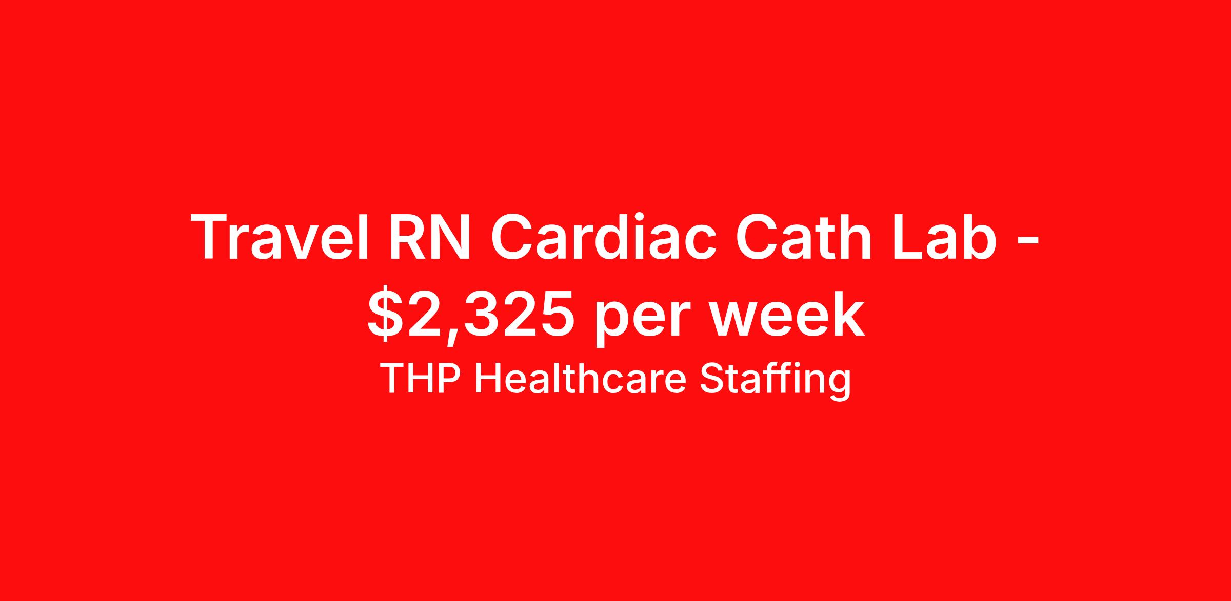 THP Healthcare Staffing is seeking a travel nurse RN Cardiac Cath Lab for a travel nursing job in Charleston, South Carolina. Job Description & Requirements Specialty: Cardiac Cath Lab Discipline: RN Start Date: 03/30/2026 Duration: 13 weeks 36 hours per week Shift: 12 hours, nights Employment Type: Travel Our Client is currently seeking RN - Cath Lab positions in Charleston, SC for a 3x12 Nights shift. You must have current State Licensure and at least 1 year of recent experience. Requirements Current Resume State Licensure Current BLS and/or ACLS and/or Specialty Certifications 2 Current Clinical References Physical (Within 12 Months) TB Skin Test (Within 12 Months) Titers - MMR/Hep B/Varicella Respiratory Fit Test (Within 12 Months) Current - Tdap/Flu Vaccinations Must be able to pass pre-employment, background and urine drug screening Compensation and Benefits Compettive Pay Packages Health Benefit Package Travel pay - 1st pay check Extending Contract Bonus Refer a friend and earn extra cash! At THP Healthcare Staffing, we take care of you - work with us, not for us! THP Healthcare Staffing Job ID 17942104. Pay package is based on 12 hour shifts and 36.0 hours per week (subject to confirmation) with tax-free stipend amount to be determined. Posted job title: RN:Cath Lab,19:00:00-07:00:00 About THP Healthcare Staffing At THP Staffing, we specialize in connecting healthcare facilities with highly skilled travel nurses and allied health professionals who bring exceptional care and expertise wherever they go. Our mission is to ensure that every healthcare provider has access to top nursing talent, regardless of location, to deliver superior patient outcomes. Benefits Weekly pay Life insurance Pet insurance License and certification reimbursement Medical benefits Employee assistance programs Referral bonus Vision benefits Holiday Pay Health savings account