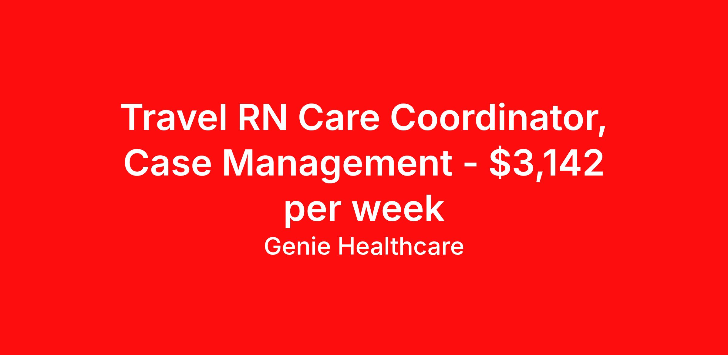 Genie Healthcare is seeking a travel nurse RN Case Management for a travel nursing job in Bakersfield, California. Job Description & Requirements Specialty: Case Management Discipline: RN Start Date: 03/30/2026 Duration: 13 weeks 40 hours per week Shift: 8 hours, days Employment Type: Travel Genie Healthcare is looking for a RN to work in Case Manager for a 13 weeks travel assignment located in Bakersfield, CA for the Shift (5x8 Days - Please verify shift details with recruiter, 07:00:00-15:00:00, 8.00-5). Pay and benefits packages are estimated based on client bill rate at time the job was posted. These rates are subject to change. Exact pay and benefits vary based on several things, including, but not limited to, guaranteed hours, client changes in bill rate, experience, etc. Benefits: Medical Insurance, Dental Insurance, Vision Insurance, 401(k) with company matching (50% up to 6% of what you contribute) Genie Healthcare Job ID 17952805. Pay package is based on 8 hour shifts and 40.0 hours per week (subject to confirmation) with tax-free stipend amount to be determined. Posted job title: RN:Case Manager,07:00:00-15:00:00 About Genie Healthcare Genie Healthcare is one of the fastest growing Nurse Travel Agencies in the USA. Genie serves hundreds of facilities and has over 4000 current travel RN contracts open at any given time. Genie provides travel RN’s flexibility, support, top pay scale, housing and the 1 rated, multi-state health insurance coverage. Genie Healthcare carries with it a commitment to providing a comprehensive level of service and quality care. Growing from a small team of eager recruiters to a company with satisfied clients in nearly every corner of the nation, delivering excellence in patient and customer care is the key to Genie’s success. The management team has 20 years of experience in workforce solutions and staffing in medical and non-medical fields, roles ranging from Clerical job to Cardiologist to software developer to CEO.