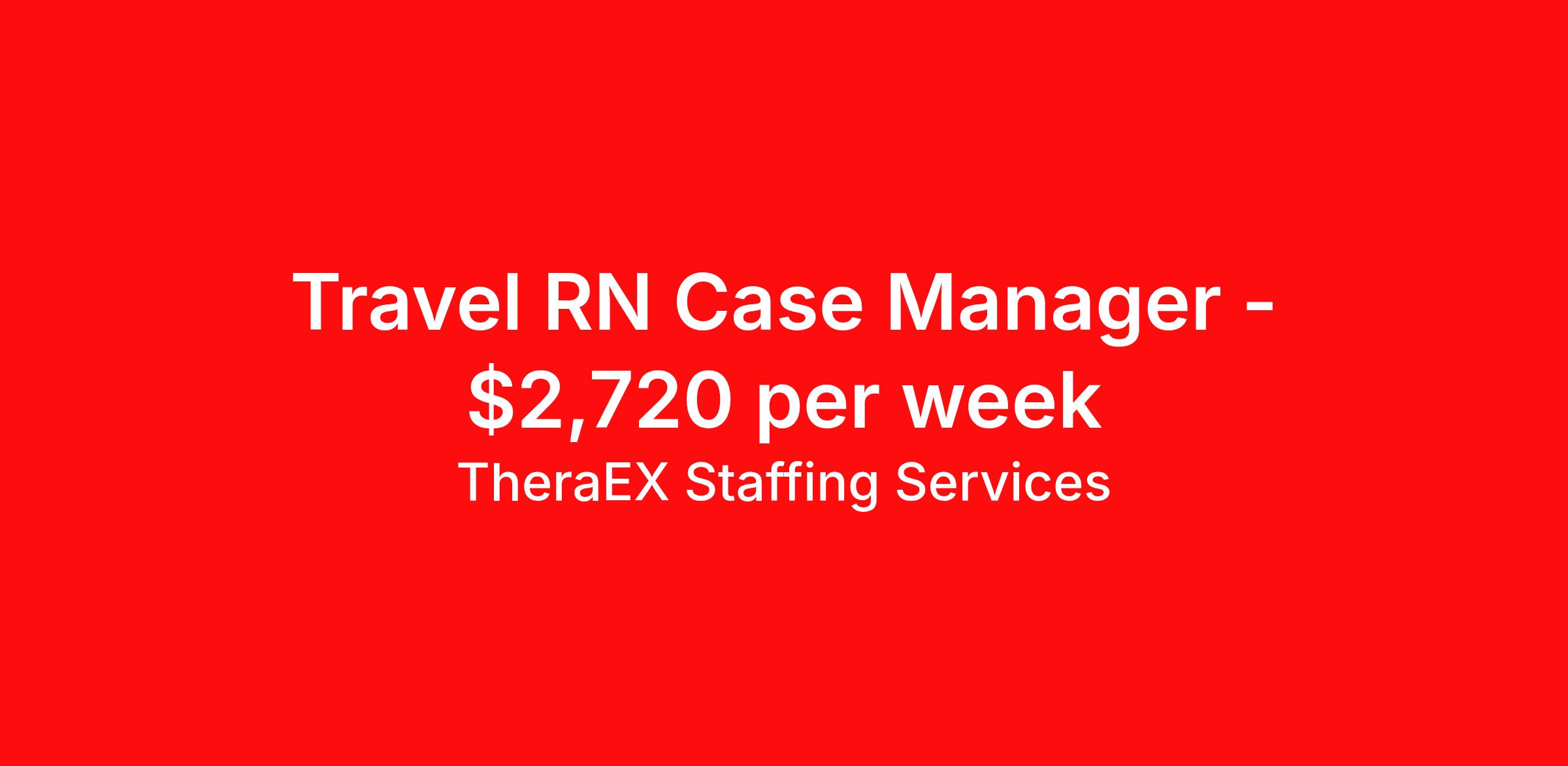 TheraEX Staffing Services is seeking a travel nurse RN Case Management for a travel nursing job in Everett, Washington. Job Description & Requirements Specialty: Case Management Discipline: RN Start Date: 03/30/2026 Duration: 13 weeks 40 hours per week Shift: 8 hours, days Employment Type: Travel RN Case Manager / Minimum 1 year acute care hospital case management experience required (discharge planning & care coordination) / Acute Care Hospital Setting / Responsible for discharge planning, care coordination, needs assessment, and interdisciplinary collaboration across hospital units / Must have active RN license and BLS; Epic experience required / Schedule: Days, 5×8-hour shifts (07:30–16:00); every other weekend required / Duration: 13 weeks / Start: 03/30/2026 / Location: Everett, WA / Facility: Providence Regional Medical Center Everett – Colby Campus / Pay: Bill rate ~$91.20/hr / Notes: Travelers must live 50 miles from facility; floating between Colby & Pacific campuses as needed TheraEX Staffing Services Job ID 3216798. Pay package is based on 8 hour shifts and 40 hours per week (subject to confirmation) with tax-free stipend amount to be determined. About TheraEX Staffing Services TheraEx Staffing Services is a leading name in healthcare staffing solutions. We enroll talented professionals to provide temporary staff to fill the needs of healthcare facilities across the nation. Benefits Dental benefits Vision benefits 401k retirement plan Health Care FSA Life insurance Sick pay Holiday Pay Medical benefits