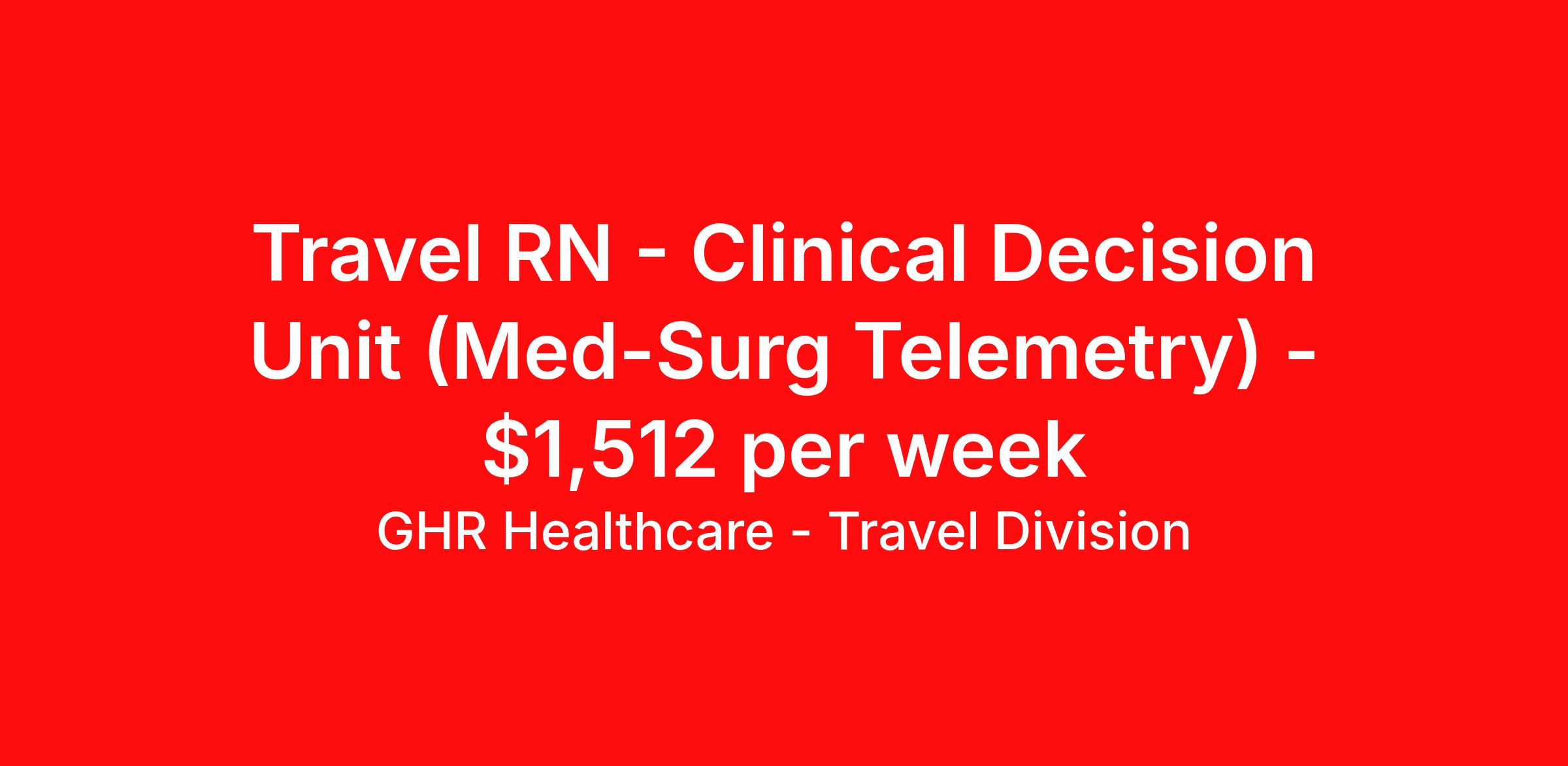 GHR Healthcare - Travel Division is seeking a travel nurse RN CDU - Clinical Decision Unit for a travel nursing job in Vero Beach, Florida. Job Description & Requirements Specialty: CDU - Clinical Decision Unit Discipline: RN Start Date: 04/21/2026 Duration: 26 weeks 36 hours per week Shift: 12 hours Employment Type: Travel GHR Healthcare - Travel Division Job ID 76364380. Pay package is based on 12 hour shifts and 36 hours per week (subject to confirmation) with tax-free stipend amount to be determined. About GHR Healthcare - Travel Division For over 30 years, GHR Healthcare has been the bridge between healthcare professionals and the facilities that need them nationwide. We're committed to uncovering your ideal fit, supported by GHR's dedication to competitive compensation, transparent communication, and a devoted team that genuinely cares about your career journey. You can trust us to stand by your side as your advocate, confidante, and partner in advancing your career. At GHR, care and consideration are at the heart of everything we do. Visit ghrhealthcare.com to learn more.