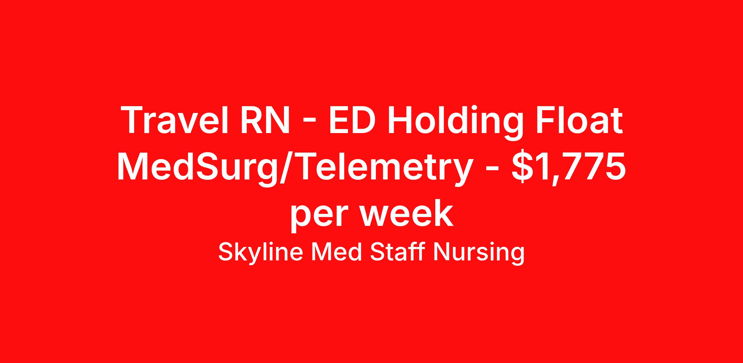 Skyline Med Staff Nursing is seeking a travel nurse RN Telemetry for a travel nursing job in Wilmington, North Carolina. Job Description & Requirements Specialty: Telemetry Discipline: RN Start Date: 04/20/2026 Duration: 13 weeks 36 hours per week Shift: 12 hours, nights Employment Type: Travel Weekly amount stated in job postings is an estimate based on estimated hourly wage and potential stipends available for the location of the assignment. Pay package is calculated on bill rate at the time job was posted, but can change or vary without notice. Exact pay packages might vary as this is an estimate. Our recruiter would be happy to build an exact pay package for you for each job. Skyline Med Staff Nursing Job ID 36176837. Pay package is based on 12 hour shifts and 36.0 hours per week (subject to confirmation) with tax-free stipend amount to be determined. Posted job title: RN:Tele,19:00:00-07:00:00 About Skyline Med Staff Nursing Join the Top- Rated Travel Healthcare Team! Skyline Med Staff was named as the 1 Best Travel Healthcare Company in 2025 by BluePipes, a recognition driven by glowing reviews from travel healthcare professionals. Our recruiters are consistently praised on Google for their responsiveness, dedication, accessibility, and industry knowledge. Ready to experience the difference? Apply for a job today and see why healthcare professionals choose Skyline! Certified Women Owned Business We believe that travel is good for the soul. We want to be on your journey with you and find the right job that fits you Skyline Med Staff is committed to one vision treating others the way that THEY want to be treated. The executive team at Skyline Med Staff focuses on a commitment to quality, consistency, and the highest level of service. Our team members continually strive to build long term relationships that center on you and helping you achieve your goals. Some of the Benefits you will receive with Skyline Med Staff: Over 30 years of combined experience in the staffing industry Higher Take-Home Pay Rates Dedicated Personal Recruiter We are available to you 24/7 Health Insurance Plan Options Tax Free Per Diems, Housing Stipends and Travel Reimbursements Joint Commission Certified Contracts in all 50 states Referral and Loyalty Bonuses Benefits Medical benefits Referral bonus