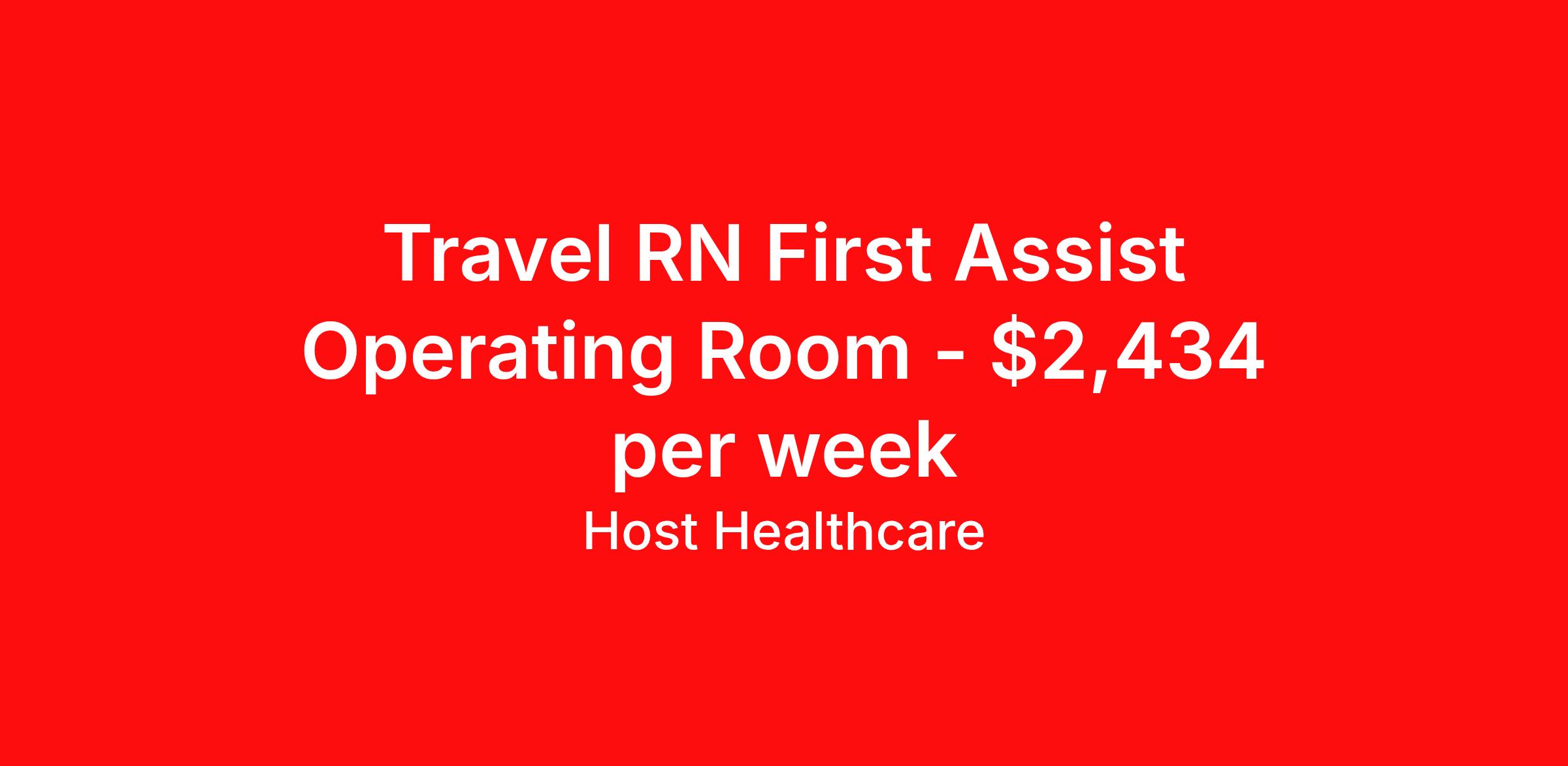Host Healthcare is seeking a travel nurse RN First Assist for a travel nursing job in Washington, Missouri. Job Description & Requirements Specialty: First Assist Discipline: RN Start Date: 04/06/2026 Duration: 13 weeks 36 hours per week Shift: 12 hours, days Employment Type: Travel Host Healthcare Job ID a1fVX000002lZyrYAE. Pay package is based on 12 hour shifts and 36 hours per week (subject to confirmation) with tax-free stipend amount to be determined. Posted job title: RN - OR-First Assist About Host Healthcare At Host Healthcare, we provide a truly comfortable experience as you explore your travel nursing, therapy, or allied career. We make your travel healthcare journey easy by taking care of all the details, so you don’t have to. We are on a mission to help others live better and we do this by helping the healers of the world be as comfortable as possible. With access to tens of thousands of travel nursing, therapy, and allied jobs in all 50 states, our responsive and friendly recruiters find your dream position based on what’s important to you. During your assignment, get access to premium benefits, including Day 1 medical that continues up to 30 days between assignments, 401K matching, travel reimbursements, dedicated housing support, and more. We also offer 24/7 support from our team and access to our on-staff clinicians so you can feel comfortable and confident throughout your entire assignment. Travel comfortably with Host Healthcare. Benefits Referral bonus School loan reimbursement Vision benefits Wellness and fitness programs Company provided housing options License and certification reimbursement Life insurance Medical benefits Mileage reimbursement Pet insurance Discount program Employee assistance programs Guaranteed Hours Health savings account Holiday Pay 401k retirement plan Continuing Education Dental benefits