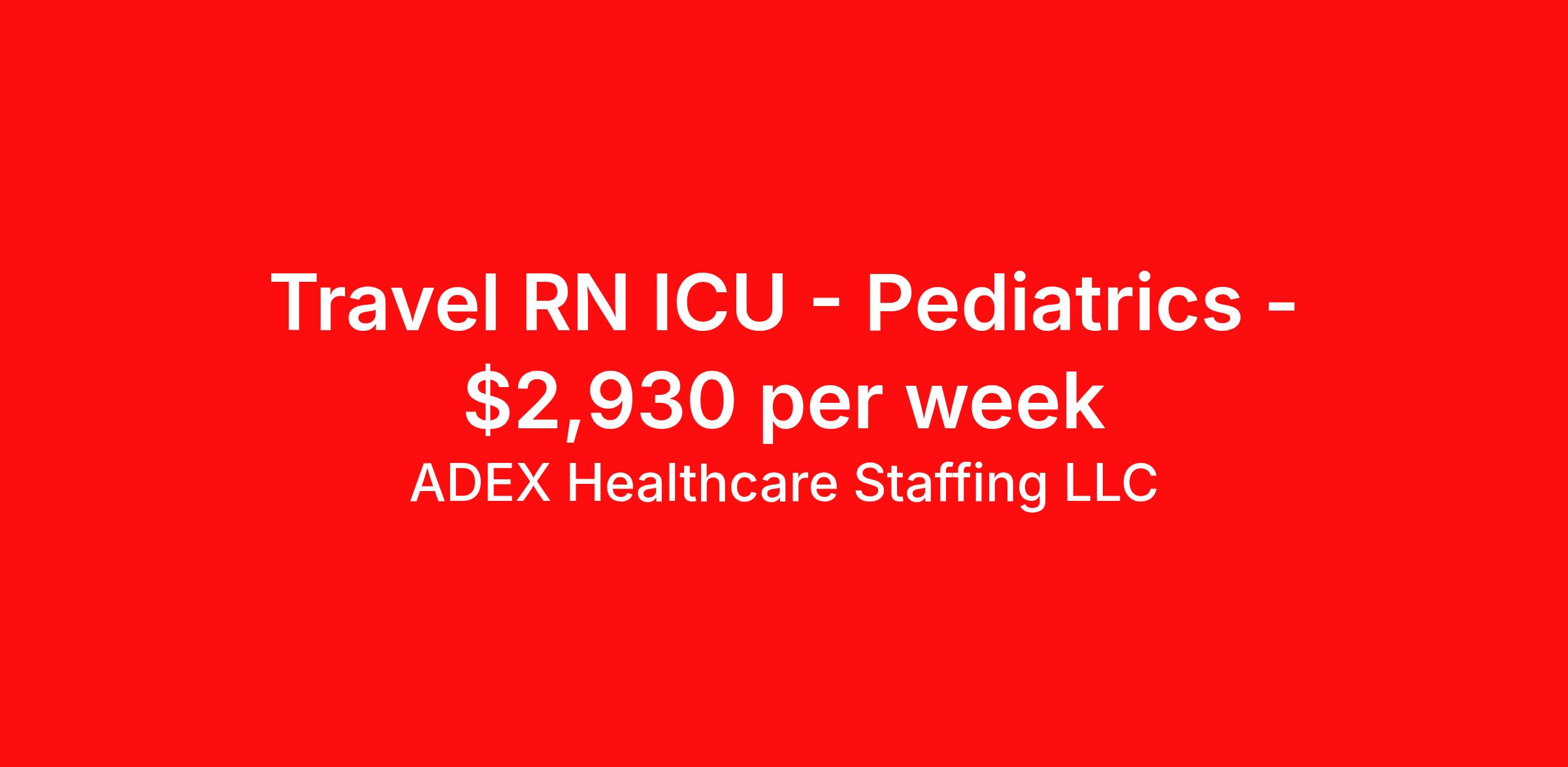 ADEX Healthcare Staffing LLC is seeking a travel nurse RN PICU - Pediatric Intensive Care for a travel nursing job in Oklahoma City, Oklahoma. Job Description & Requirements Specialty: PICU - Pediatric Intensive Care Discipline: RN Start Date: 03/30/2026 Duration: 13 weeks 36 hours per week Shift: 12 hours, days Employment Type: Travel RN Position Job Notes: Travel or Local Registered Nurse needed for ASAP start. A minimum of 2 years of recent hospital bedside experience is required. Candidates must be able to start within 5 weeks. Opportunity for extension upon successful completion of the initial assignment. $750 referral bonus available. Opportunity: RN - PICU Job Details: • Provide nursing care in pediatric intensive care unit setting under general supervision • Must have 1 year of nursing experience and level I trauma experience • ICU experience required • Assume responsibility for assigned group of patients with health problems ranging from simple to complex • Document patient responses to nursing interventions and prescribed medical treatments • Assist physicians in patient examination and performing minor diagnostic procedures • Obtain and monitor physiological data, observe patient manifestations and intervene when necessary • Administer medications as prescribed and manage intravenous infusions and blood products • Interact with families and patients regarding care plans during hospitalization and discharge • Make referrals regarding patient care needs and delegate tasks to support staff • Required certifications: Current Oklahoma RN License or multistate compact license, BLS (AHA), PALS (AHA) • Associate's Degree in Nursing required, Bachelor's preferred • Must demonstrate strong communication skills and ability to respond to cultural and language needs • Computer skills required Facility: This pediatric medical center specializes in comprehensive healthcare services for children, featuring advanced pediatric intensive care capabilities. The facility is equipped to handle complex pediatric cases and trauma situations, maintaining high standards for patient care and family-centered services. The organization is committed to providing specialized pediatric nursing care with state-of-the-art equipment and supportive clinical environment. Location: Oklahoma City, OK Oklahoma City offers a vibrant metropolitan environment with affordable living costs and a strong sense of community. The city provides excellent recreational opportunities, cultural attractions, and professional growth potential in a thriving healthcare market. Adex Job ID 37036432. Pay package is based on 12 hour shifts and 36 hours per week (subject to confirmation) with tax-free stipend amount to be determined. About ADEX Healthcare Staffing LLC ADEX has been placing healthcare professionals across the US since 2004. Originally founded in Atlanta, GA, the company's headquarters are now located in Tampa, FL. JCAHO certified since 2009. Benefits Referral bonus