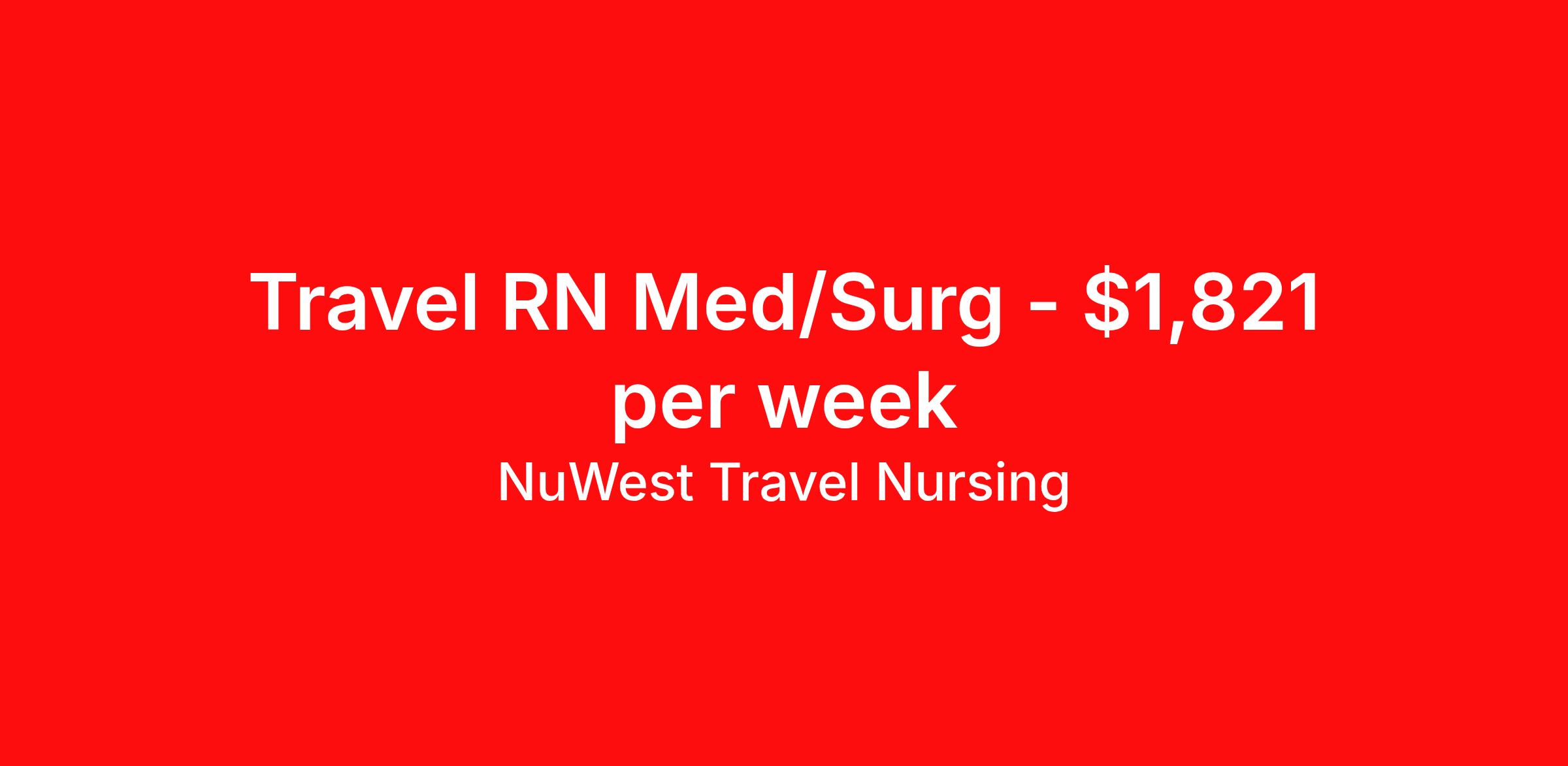 NuWest Travel Nursing is seeking a travel nurse RN Med Surg for a travel nursing job in Cleveland, Ohio. Job Description & Requirements Specialty: Med Surg Discipline: RN Duration: 13 weeks 36 hours per week Shift: 12 hours Employment Type: Travel We have a new assignment for RN - Med/Surg in Cleveland, OH and are interviewing ASAP. This is a travel assignment, 3x12 Nights position at a great facility. Pay Range: $1672.96 - $1968.19 Per Week Benefits include medical, dental, vision, 401K, weekly direct deposit, and more! NuWest Travel Nursing Job ID 268352. Pay package is based on 12 hour shifts and 36 hours per week (subject to confirmation) with tax-free stipend amount to be determined.