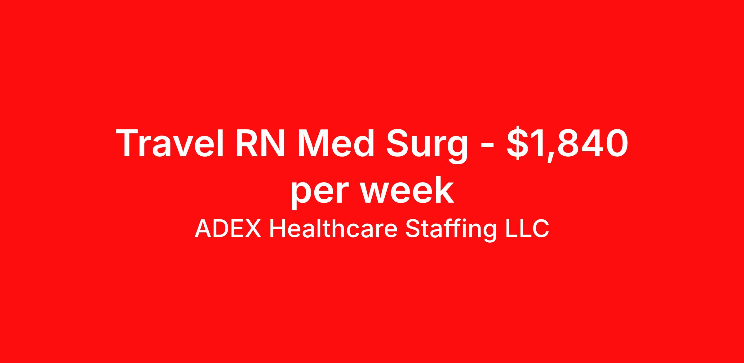 ADEX Healthcare Staffing LLC is seeking a travel nurse RN Med Surg for a travel nursing job in Odessa, Texas. Job Description & Requirements Specialty: Med Surg Discipline: RN Start Date: ASAP Duration: 13 weeks 36 hours per week Shift: 12 hours Employment Type: Travel RN Position Job Notes: Travel or Local Registered Nurse needed for ASAP start. A minimum of 2 years of recent hospital bedside experience is required. Candidates must be able to start within 5 weeks. Opportunity for extension upon successful completion of the initial assignment. $750 referral bonus available. Opportunity: RN - Med Surg Job Details: • Night shift position • Minimum 2 years of nursing experience required • Prior travel experience required • No local candidates accepted • Required certifications: BLS, ACLS, PALS, NIH Stroke • Navy scrubs required • 2 positions available • Position created due to vacant position Facility: This healthcare facility is a comprehensive medical center providing quality patient care and medical services to the community. The organization operates as a PWP (Pay When Paid) facility and maintains high standards for nursing staff with specific experience and certification requirements to ensure excellent patient outcomes. Location: Odessa, TX Odessa offers a vibrant West Texas community known for its rich oil industry heritage and growing economy. The area provides affordable living costs, warm weather year-round, and access to outdoor recreation activities, making it an attractive location for healthcare professionals seeking career opportunities in a dynamic region. Adex Job ID 984232. Pay package is based on 12 hour shifts and 36 hours per week (subject to confirmation) with tax-free stipend amount to be determined. About ADEX Healthcare Staffing LLC ADEX has been placing healthcare professionals across the US since 2004. Originally founded in Atlanta, GA, the company's headquarters are now located in Tampa, FL. JCAHO certified since 2009. Benefits Referral bonus