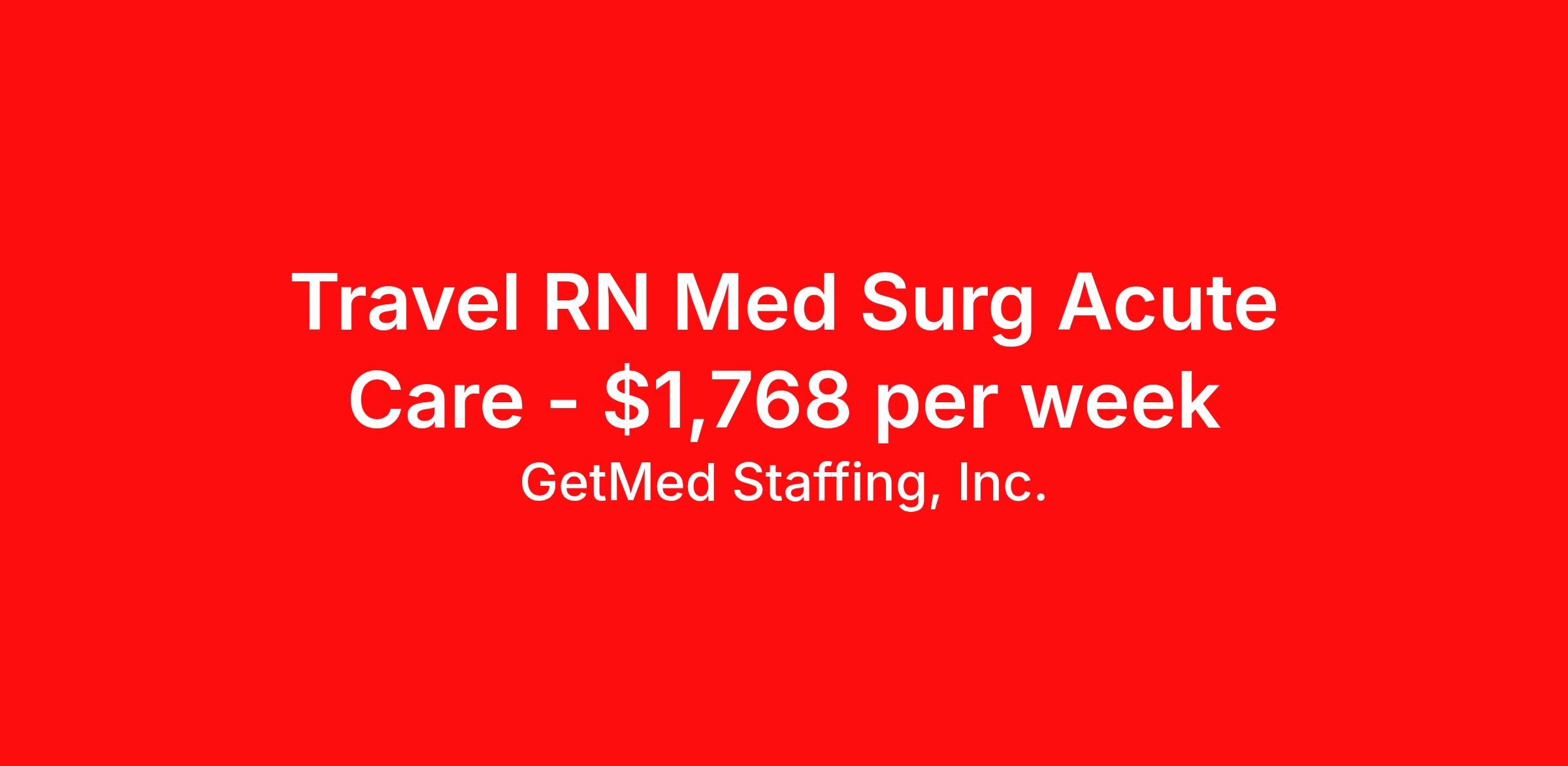 GetMed Staffing, Inc. is seeking a travel nurse RN Med Surg for a travel nursing job in Albany, Georgia. Job Description & Requirements Specialty: Med Surg Discipline: RN Start Date: 03/30/2026 Duration: 17 weeks 36 hours per week Shift: 12 hours, days Employment Type: Travel GetMed Staffing is searching for a strong MedSurg RN to assist our traveler-friendly client. A minimum of 1-2 years of experience is required. Traveling with GetMed Staffing offers the unique opportunity to gain diverse experiences, both personally and professionally. Gain experience that matters. GetMed Staffing, Inc. Job ID 35877437. Pay package is based on 12 hour shifts and 36.0 hours per week (subject to confirmation) with tax-free stipend amount to be determined. Posted job title: RN:MedSurg,07:00:00-19:00:00 About GetMed Staffing, Inc. We are a diversity owned company, specializing in healthcare recruiting services. We truly understand how important a healthcare travelers' relationship is with their recruiter, as well as our relationship is with our healthcare facilities. We recognize that the needs of our healthcare travelers can vary, and therefore we provide the personalized touch necessary to ensure a successful travel assignment each and every time. Our healthcare facilities and clients benefit from us putting our healthcare travelers first. GetMed Staffing is excited to be a leader within the industry by focusing on providing healthcare travelers with more choices and possibilities as they plan for their next healthcare travel assignment. Benefits Life insurance Medical benefits Dental benefits Vision benefits 401k retirement plan