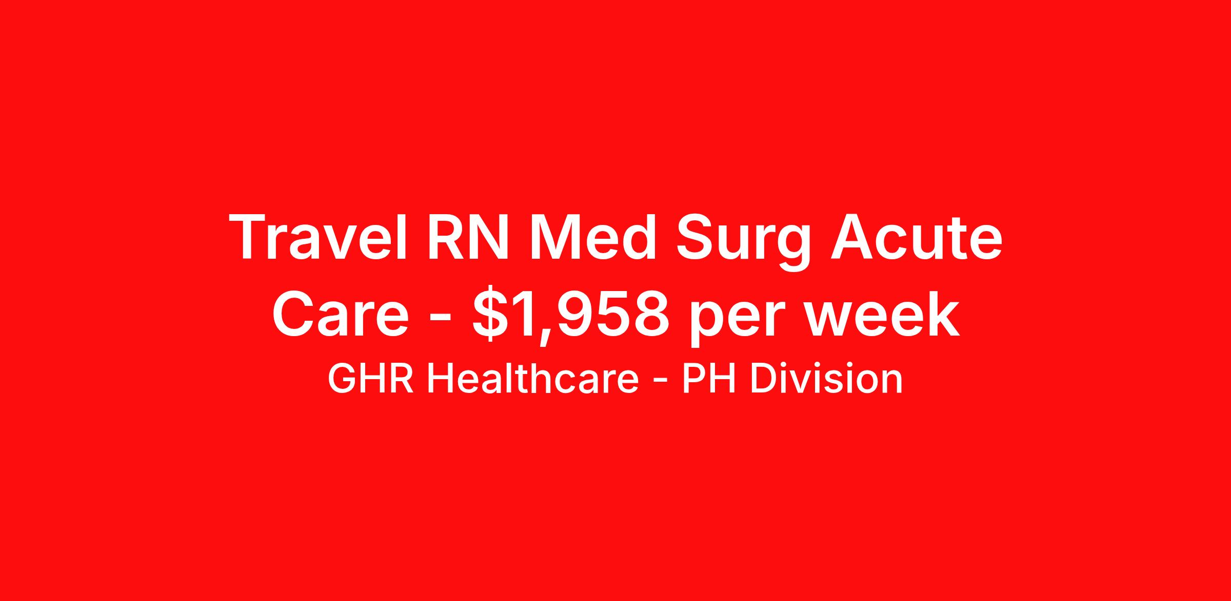 GHR Healthcare - PH Division is seeking a travel nurse RN Med Surg for a travel nursing job in Albany, Georgia. Job Description & Requirements Specialty: Med Surg Discipline: RN Start Date: 03/30/2026 Duration: 17 weeks 36 hours per week Shift: 12 hours Employment Type: Travel Planet Healthcare Job ID 75814405. Pay package is based on 12 hour shifts and 36 hours per week (subject to confirmation) with tax-free stipend amount to be determined. About GHR Healthcare - PH Division For over 30 years, GHR Healthcare has been the bridge between healthcare professionals and the facilities that need them nationwide. We're committed to uncovering your ideal fit, supported by GHR's dedication to competitive compensation, transparent communication, and a devoted team that genuinely cares about your career journey. You can trust us to stand by your side as your advocate, confidante, and partner in advancing your career. At GHR, care and consideration are at the heart of everything we do. Visit ghrhealthcare.com to learn more.
