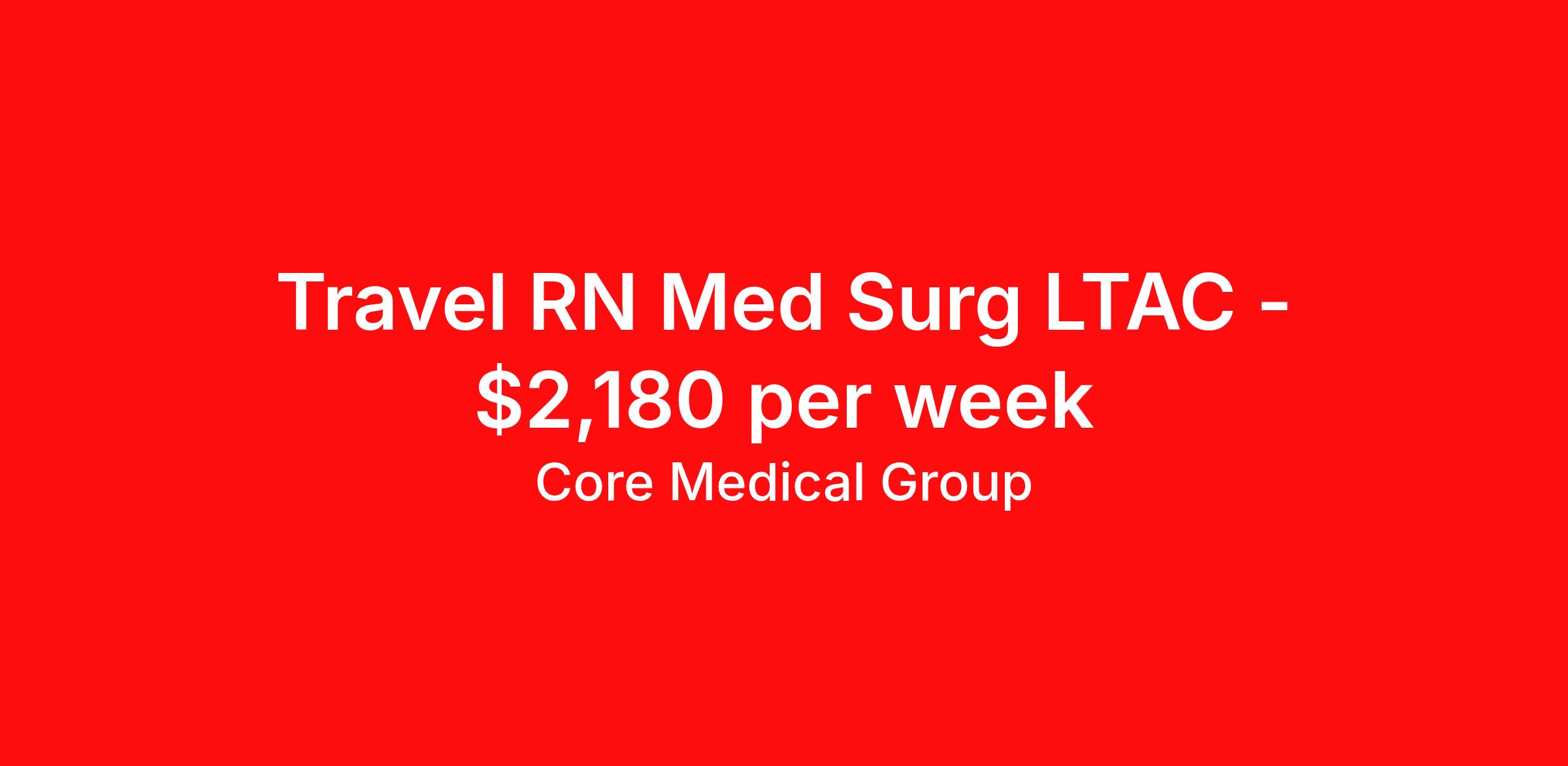 Core Medical Group is seeking a travel nurse RN Long Term Acute Care Med Surg for a travel nursing job in Peoria, Illinois. Job Description & Requirements Specialty: Long Term Acute Care Discipline: RN Start Date: 04/13/2026 Duration: 13 weeks 36 hours per week Shift: 12 hours Employment Type: Travel Client in IL seeking Registered Nurse: LTAC / Long-Term Acute Care for the following shift(s): Nights We are looking for a healthcare professional who is ready to provide exceptional patient care in this contract/travel role. Contract/travel assignments are typically 13 weeks, with potential to extend. Help us continue our mission to connect people, improve lives, and give back to the community by joining the CoreMedical Group team. When you work with CoreMedical Group, we put you first and treat you like family, supporting you every step of the way. CoreMedical Group is one of the largest healthcare staffing agencies in the country, with travel and contract positions located across the United States. Our recruiters will help you find the perfect job, whether it's across the country or across the street. In addition to dedicated, personalized support from your recruiter, when you work with CoreMedical Group you'll receive: Access to an extensive benefits package, including day 1 health, dental, and vision insurance, employer paid life insurance, a health reimbursement account, and more! Weekly paychecks with competitive pay packages Matching 401(k) benefits to help you save for retirement Licensure assistance and reimbursement to set you up for success on your contract Travel reimbursement and dedicated housing support while on assignment Referral cash bonuses when you connect us with other clinicians CoreMedical Group also offers you a free, all-inclusive vacation each year as our way of saying "thank you" for your hard work. Join other healthcare professionals on the annual Club CoreMed retreat and you'll see why our contract and travel professionals come back to us year after year! Your career is too valuable to tackle on your own. Let CoreMedical Group help you with your healthcare journey! *Estimate of weekly payments is intended for informational purposes and includes hourly wages, as well as reimbursements for meal & incidental expenses, and housing expenses incurred on behalf of the Company. Any benefits (medical/dental/vision) are in addition to the weekly pay. Please speak with your Recruiter for additional details. Estimated payments are subject to change until formal offer of assignment is made and accepted. Core Medical Group Job ID 1367314. Pay package is based on 12 hour shifts and 36 hours per week (subject to confirmation) with tax-free stipend amount to be determined. Posted job title: RN About Core Medical Group CoreMedical Group is one of the largest healthcare staffing agencies in the country. We have jobs nationwide in travel nursing, travel allied health, interim, locum tenens, and permanent placements! Join the staffing agency with Club CoreMed, the best perk in the industry - an all inclusive paid trip to a tropical resort! Benefits Weekly pay Holiday Pay Guaranteed Hours Continuing Education 401k retirement plan Pet insurance Company provided housing options Sick pay Wellness and fitness programs Mileage reimbursement Referral bonus Employee assistance programs Medical benefits Dental benefits Vision benefits Benefits start day 1 License and certification reimbursement Life insurance Discount program