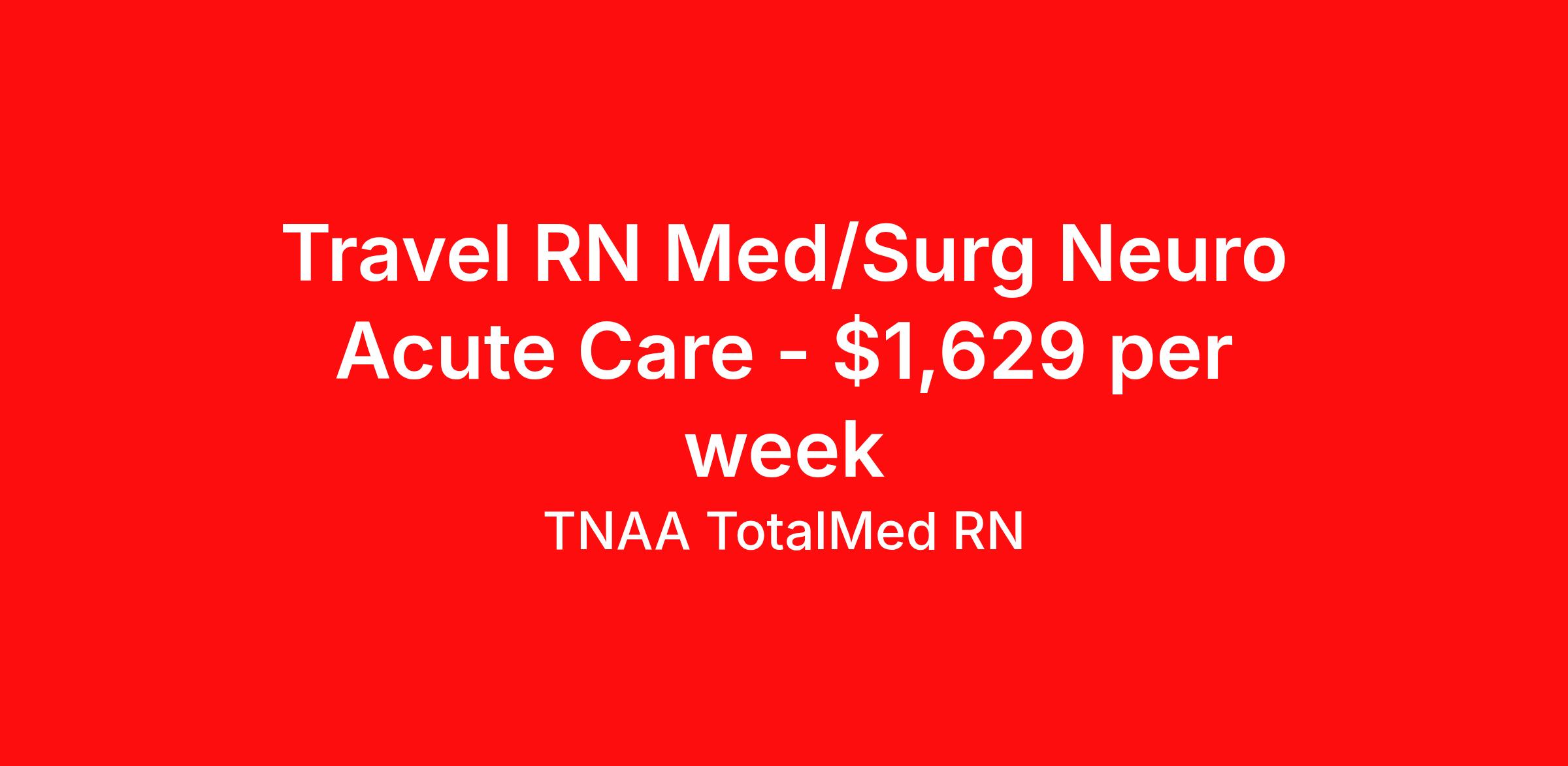 TNAA TotalMed RN is seeking a travel nurse RN Med Surg for a travel nursing job in Homewood, Alabama. Job Description & Requirements Specialty: Med Surg Discipline: RN Duration: 13 weeks 36 hours per week Shift: 12 hours, nights Employment Type: Travel We're looking for Medical Surgical RNs for an immediate travel nurse opening in Homewood, AL. The right RN should have 1-2 years recent acute care experience. Read below for more requirements. As a MedSurg RN, you will conduct patient assessments and prioritize data collection based on patients' immediate conditions or needs. MedSurg RNs perform ongoing assessments and appropriate treatments as ordered by a physician. Documenting patient findings and providing education and support to patients' families is essential to this travel nurse position. As a Medical Surgical Travel Nurse, you should be prepared to perform the following tasks: Provide bedside care for a variety of patients, including pre- and post-op patients. Prepare, administer and record prescribed medication, reporting any adverse reactions to treatment. Change dressings, insert catheters and start IVs. Prepares equipment and aids physician during examination and treatment of patient. Educates patients on surgical procedures. Participates in discharge planning and initiates patient education plan as prescribed by physician. Medical Surgical Travel Nurses should be able to stand and walk for long periods of time, as well as bend, lean and stoop without difficulty. RNs should be able to easily lift 20 pounds. Moving or lifting of patients may require lifting of up to 50 pounds at times. RNs will work in a fast-paced environment treating patients that may be confused, agitated, and/or uncooperative. Requirements*: BLS, 2 Years * Additional certifications may be required before beginning an assignment. TotalMed Travel Job ID 1386650. Pay package is based on 12 hour shifts and 36 hours per week (subject to confirmation) with tax-free stipend amount to be determined. Posted job title: Medical/Surgical - MedSurg RN - Travel Nurse About TNAA TotalMed RN TotalMed is a Top Ten, travel nursing and healthcare staffing agency with the mission of igniting purpose in healthcare. The organization staffs nurses, therapists, pharmacists, and other clinicians of all specialties in all 50 states. They offer local and travel jobs and match caregivers with the right organization to assist both facilities and patients. As an organization, they focus on putting highly-skilled staff into facilities to ensure adequate staffing for a better patient experience. TotalMed specializes in recruiting and placing healthcare professionals in travel, PRN, and permanent positions across the country in Nursing and Allied Health. Throughout 2020, the organization filled roles at even the most short-staffed facilities during the most challenging time in healthcare. By matching the right travel healthcare professional with the right organization, TotalMed continues to offer a lifeline to facilities and their patients. Benefits Weekly pay Guaranteed Hours Continuing Education 401k retirement plan Sick pay Wellness and fitness programs Referral bonus Employee assistance programs Medical benefits Dental benefits Vision benefits Benefits start day 1