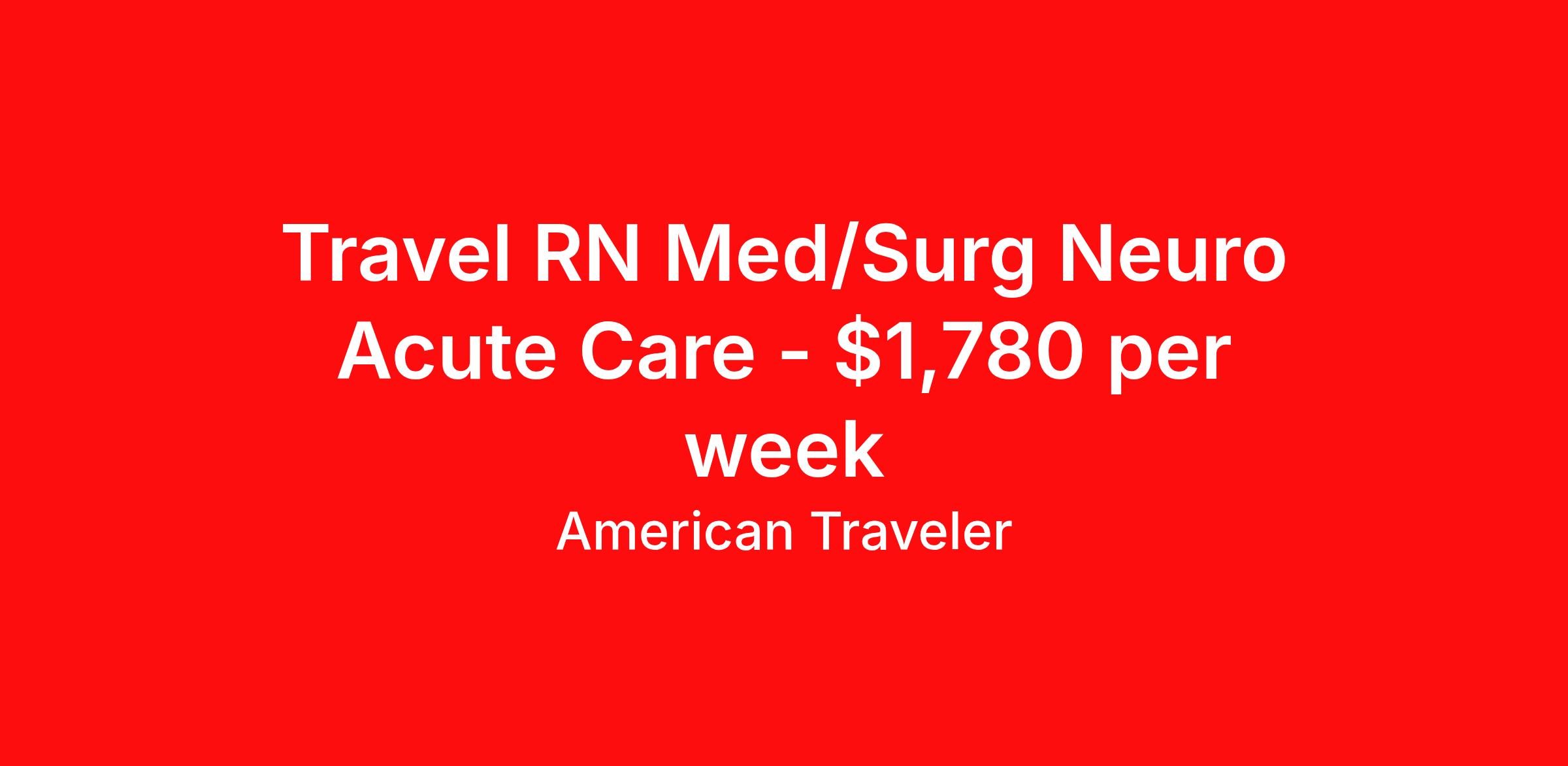 American Traveler is seeking a travel nurse RN Med Surg for a travel nursing job in Birmingham, Alabama. Job Description & Requirements Specialty: Med Surg Discipline: RN Start Date: ASAP Duration: 13 weeks 36 hours per week Shift: 12 hours, nights Employment Type: Travel Assignment Overview Shift: Nights, 3x12hrs Hours: 36 hrs/wk Start Date: Mar 9, 2026 Length: 13 weeks Openings: 1 Description American Traveler is hiring an experienced RN for a Med/Surg Neuro Acute Care position requiring an AL or compact RN license and at least 2 years of experience. Details Work on a Neuro Acute Care Med/Surg unit within a hospital setting Patient population includes neurological and medical-surgical cases Night shifts from 18:45 to 07:15 13-week travel assignment Requirements Active Alabama or compact RN license required Minimum of 2 years RN experience Additional Information Responsibilities include providing care to neuro and med/surg patients Candidates will work as part of a multidisciplinary healthcare team American Traveler Job ID P-671315. Pay package is based on 12 hour shifts and 36 hours per week (subject to confirmation) with tax-free stipend amount to be determined. Posted job title: Travel RN - Med/Surg About American Traveler With over 25 years of experience, American Traveler has established a reputation for outstanding customer service. Our team ensures a smooth, worry-free experience for those starting on or expanding their travel nursing and allied careers. With thousands of travel nursing and allied jobs nationwide, our attentive and approachable recruiters find positions that align perfectly with your career aspirations and personal requirements. American Traveler offers exceptional benefits, including premium medical, dental, vision and life insurance beginning day one of your assignment, generous 401(k) match, substantial housing stipends, and more. Additionally, with 24/7 support and access to our in-house clinicians, you are assured confidence and comfort throughout your assignment. With our team behind you, you can relax and enjoy a rewarding travel career.