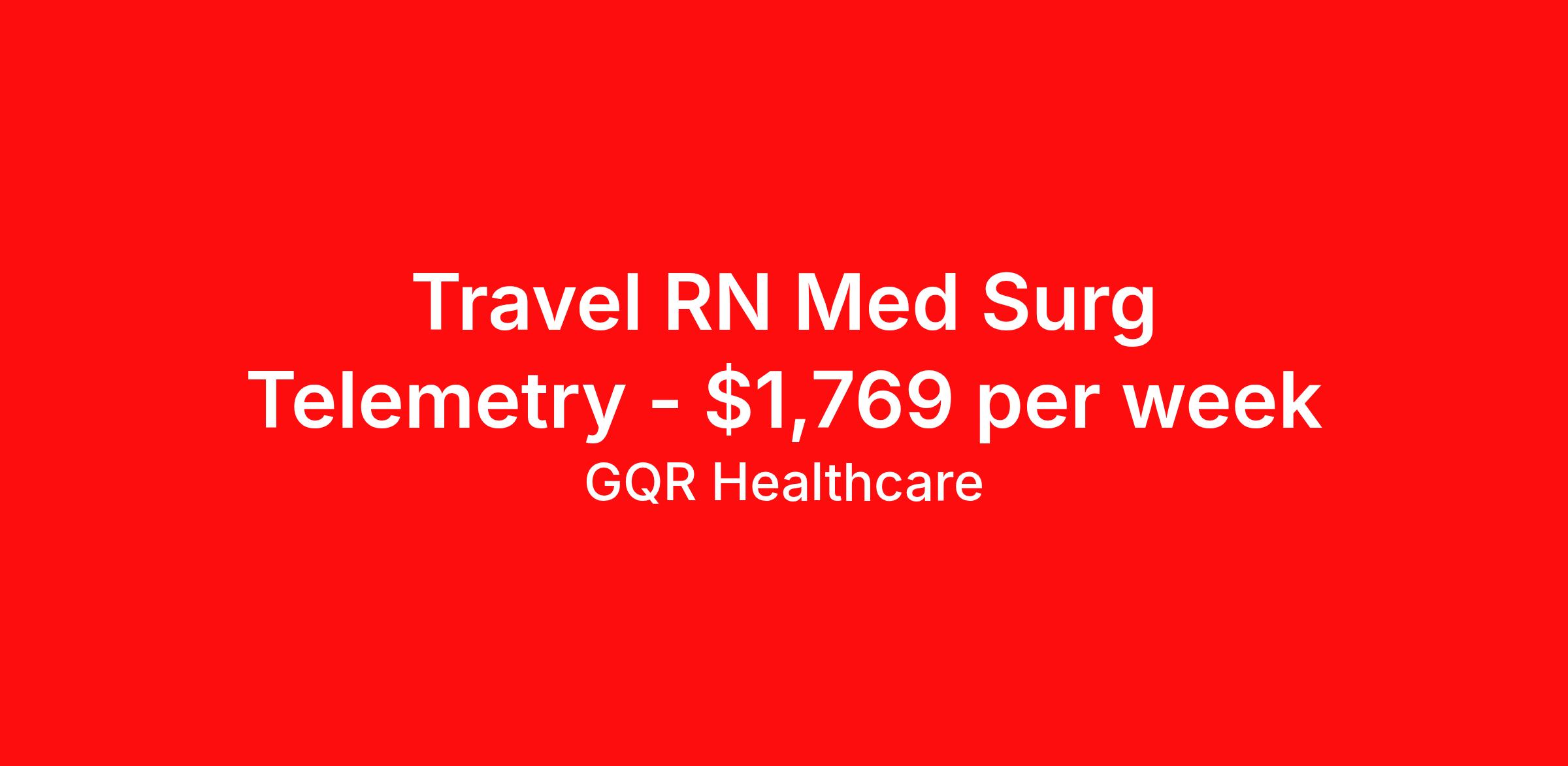 GQR Healthcare is seeking a travel nurse RN Med Surg / Telemetry for a travel nursing job in Tuscaloosa, Alabama. Job Description & Requirements Specialty: Med Surg / Telemetry Discipline: RN Start Date: 04/27/2026 Duration: 13 weeks 36 hours per week Shift: 12 hours, days Employment Type: Travel Contract - W2 Med/Surg | Telemetry Registered Nurse (RN) Job Location: Tuscaloosa, Alabama Start Date: April 27, 2026 Profession: Registered Nurse (RN) Facility: Estimated Pay: $1769.13 - $1864.13 Duration:13 weeks Specialty:Med/Surg | Telemetry Shift: Day Shift Details: null Day Job Type: Travel *Estimated weekly pay includes projected hourly wages and weekly meal and lodging per diems for eligible clinicians based on nationally published GSA rates. Actual weekly pay and per diems may differ from the amount shown and are subject to change during an assignment. Benefits: Day 1 Insurance Cigna medical, MetLife dental and vision insurance License reimbursement for new licenses needed for each assignment Discounts with hotels and rental cars A dedicated recruiter and support team that will help you every step of the way to sure you start on time and have an exceptional experience Referral bonus up to $700 About the Company: Finding the right role is about more than just matching skills to a job—it’s about aligning with your goals, values, and the way you want to work. As an award-winning talent partner, we support healthcare professionals through every step of that process, offering meaningful opportunities, clear guidance, and long-term partnership. From our first conversation to your first day on the job (and beyond!), we’re here to help you move forward with confidence. GQR Job ID 787888. Pay package is based on 12 hour shifts and 36 hours per week (subject to confirmation) with tax-free stipend amount to be determined. Posted job title: Registered Nurse (RN) About GQR Healthcare GQR’s Healthcare team specializes in connecting experts within the industry to highly skilled healthcare professionals across the US market. In the competitive healthcare market, we recognize that the industry’s common goals of improved quality of care and patient outcomes are wholly reliant upon the professionals directly supporting these initiatives. Leveraging our extensive candidate network, we deliver continuity of care for the communities our partners serve to ensure the patient experience is of the highest quality. Through deep market specialization and a unique approach to talent acquisition, GQR Healthcare provides an unparalleled and personalized experience across all medical specialties in nursing and within diverse healthcare platforms across the industry.