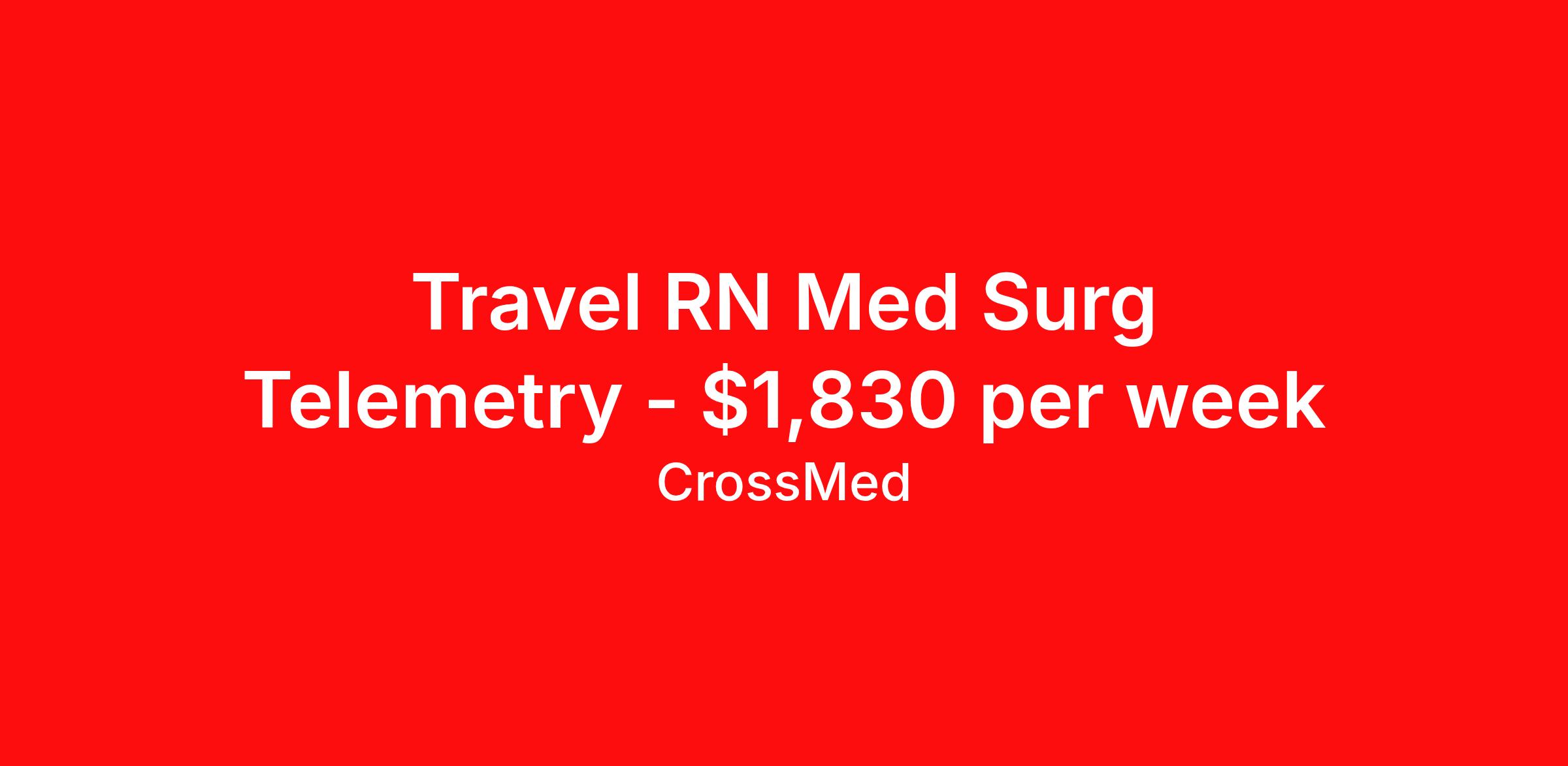 CrossMed is seeking a travel nurse RN Med Surg / Telemetry for a travel nursing job in Tuscaloosa, Alabama. Job Description & Requirements Specialty: Med Surg / Telemetry Discipline: RN Start Date: 03/30/2026 Duration: 13 weeks 36 hours per week Shift: 12 hours Employment Type: Travel Job Details Gross Weekly Pay: $1741.68 - $1830.24 Starts: 2026-03-30 Assignment Length: 13 Weeks Shift: Overnight shift. Hours Per Week: 36 Job Quantity: 2 Type: Travel City: Tuscaloosa State: AL At CrossMed Healthcare Staffing, we aim to create lasting impressions wherever we go. Embark on your healthcare traveler journey with us and discover the CrossMed advantage. We offer competitive pay packages, comprehensive benefits, an in-house clinical team, and dedicated recruiters committed to your success. Our goal is to become the preferred staffing provider by delivering top-notch customer service. Join us and experience the difference firsthand! Benefits: Competitive weekly pay Insurance (Health, Dental, Vision) Life Insurance 401(k) Referral Bonus Reimbursement for Licensure & CEU’s Refer-a-Friend Bonus Program EAP Program Qualifications: At minimum 1 - 2 years’ experience preferred Graduate from an accredited school Certifications may be required based on facility requirements Physical abilities – remain in a stationary position, move and lift equipment (50-100 lbs), pushing, bending and pulling Communication and collaborates with physicians and other health team members Provides and coordinates patient care with other health team members Monitors patients’ responses to interventions and reports outcomes Administers medications as ordered with appropriate documentation Monitor and evaluates patients before, during, and post procedure depending on unit Shares on-call responsibilities with a 30-minute response time if required Maintains cleanliness of rooms and adequate stock of supplies Transports patients as needed Performs other duties as assigned Required Skills: Interpersonal Skills – ability to work with diverse personnel (professional and support staff) while maintaining a positive demeanor and professional appearance. Technical Skills - the ability to grasp, push/pull, and move while assisting with procedures or operating departmental equipment. Cognitive Demands - capable of managing frequent interactions with the public and customers and meeting deadlines under pressure. Comfortable working under occasional close supervision or independently. Sensory Skills - keen visual understanding and practical communication abilities. CrossMed Job ID 674019. Pay package is based on 12 hour shifts and 36 hours per week (subject to confirmation) with tax-free stipend amount to be determined. Posted job title: Med Tele RN | Registered Nurse About CrossMed At CrossMed Healthcare Staffing, we aim to create lasting impressions wherever we go. Embark on your healthcare traveler journey with us and discover the CrossMed advantage. We offer competitive pay packages, comprehensive benefits, an in-house clinical team, and dedicated recruiters committed to your success. Our goal is to become the preferred staffing provider by delivering top-notch customer service. Join us and experience the difference firsthand! Benefits Weekly pay Holiday Pay Guaranteed Hours Continuing Education Company provided housing options Mileage reimbursement Referral bonus Medical benefits Dental benefits Vision benefits License and certification reimbursement Life insurance