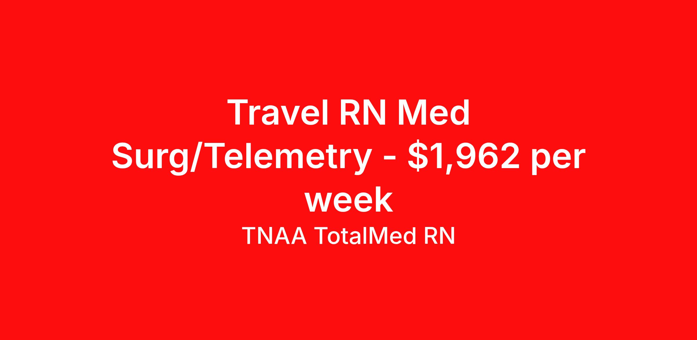 TNAA TotalMed RN is seeking a travel nurse RN Med Surg / Telemetry for a travel nursing job in Elko, Nevada. Job Description & Requirements Specialty: Med Surg / Telemetry Discipline: RN Duration: 13 weeks 36 hours per week Shift: 12 hours, nights Employment Type: Travel We're looking for Medical Surgical RNs for an immediate travel nurse opening in Elko, NV. The right RN should have 1-2 years recent acute care experience. Read below for more requirements. As a MedSurg RN, you will conduct patient assessments and prioritize data collection based on patients' immediate conditions or needs. MedSurg RNs perform ongoing assessments and appropriate treatments as ordered by a physician. Documenting patient findings and providing education and support to patients' families is essential to this travel nurse position. As a Medical Surgical Travel Nurse, you should be prepared to perform the following tasks: Provide bedside care for a variety of patients, including pre- and post-op patients. Prepare, administer and record prescribed medication, reporting any adverse reactions to treatment. Change dressings, insert catheters and start IVs. Prepares equipment and aids physician during examination and treatment of patient. Educates patients on surgical procedures. Participates in discharge planning and initiates patient education plan as prescribed by physician. Medical Surgical Travel Nurses should be able to stand and walk for long periods of time, as well as bend, lean and stoop without difficulty. RNs should be able to easily lift 20 pounds. Moving or lifting of patients may require lifting of up to 50 pounds at times. RNs will work in a fast-paced environment treating patients that may be confused, agitated, and/or uncooperative. Requirements*: BLS, ACLS, PALS, 1.5 Years * Additional certifications may be required before beginning an assignment. TotalMed Travel Job ID 1395770. Pay package is based on 12 hour shifts and 36 hours per week (subject to confirmation) with tax-free stipend amount to be determined. Posted job title: Medical/Surgical - MedSurg RN - Travel Nurse About TNAA TotalMed RN TotalMed is a Top Ten, travel nursing and healthcare staffing agency with the mission of igniting purpose in healthcare. The organization staffs nurses, therapists, pharmacists, and other clinicians of all specialties in all 50 states. They offer local and travel jobs and match caregivers with the right organization to assist both facilities and patients. As an organization, they focus on putting highly-skilled staff into facilities to ensure adequate staffing for a better patient experience. TotalMed specializes in recruiting and placing healthcare professionals in travel, PRN, and permanent positions across the country in Nursing and Allied Health. Throughout 2020, the organization filled roles at even the most short-staffed facilities during the most challenging time in healthcare. By matching the right travel healthcare professional with the right organization, TotalMed continues to offer a lifeline to facilities and their patients. Benefits Weekly pay Guaranteed Hours Continuing Education 401k retirement plan Sick pay Wellness and fitness programs Referral bonus Employee assistance programs Medical benefits Dental benefits Vision benefits Benefits start day 1