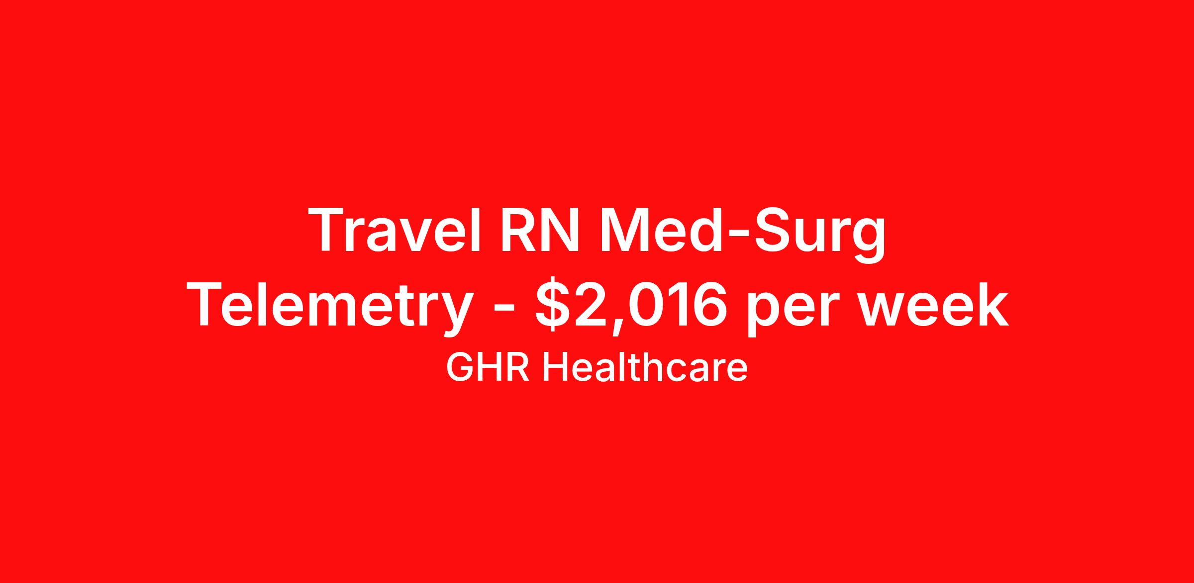 GHR Healthcare is seeking a travel nurse RN Med Surg / Telemetry for a travel nursing job in Jacksonville, North Carolina. Job Description & Requirements Specialty: Med Surg / Telemetry Discipline: RN Start Date: 04/13/2026 Duration: 13 weeks 36 hours per week Shift: 12 hours Employment Type: Travel GHR Healthcare Job ID 76409403. Pay package is based on 12 hour shifts and 36 hours per week (subject to confirmation) with tax-free stipend amount to be determined. About GHR Healthcare For over 30 years, GHR Healthcare has been the bridge between healthcare professionals and the facilities that need them nationwide. We're committed to uncovering your ideal fit, supported by GHR's dedication to competitive compensation, transparent communication, and a devoted team that genuinely cares about your career journey. You can trust us to stand by your side as your advocate, confidante, and partner in advancing your career. At GHR, care and consideration are at the heart of everything we do. Visit ghrhealthcare.com to learn more.