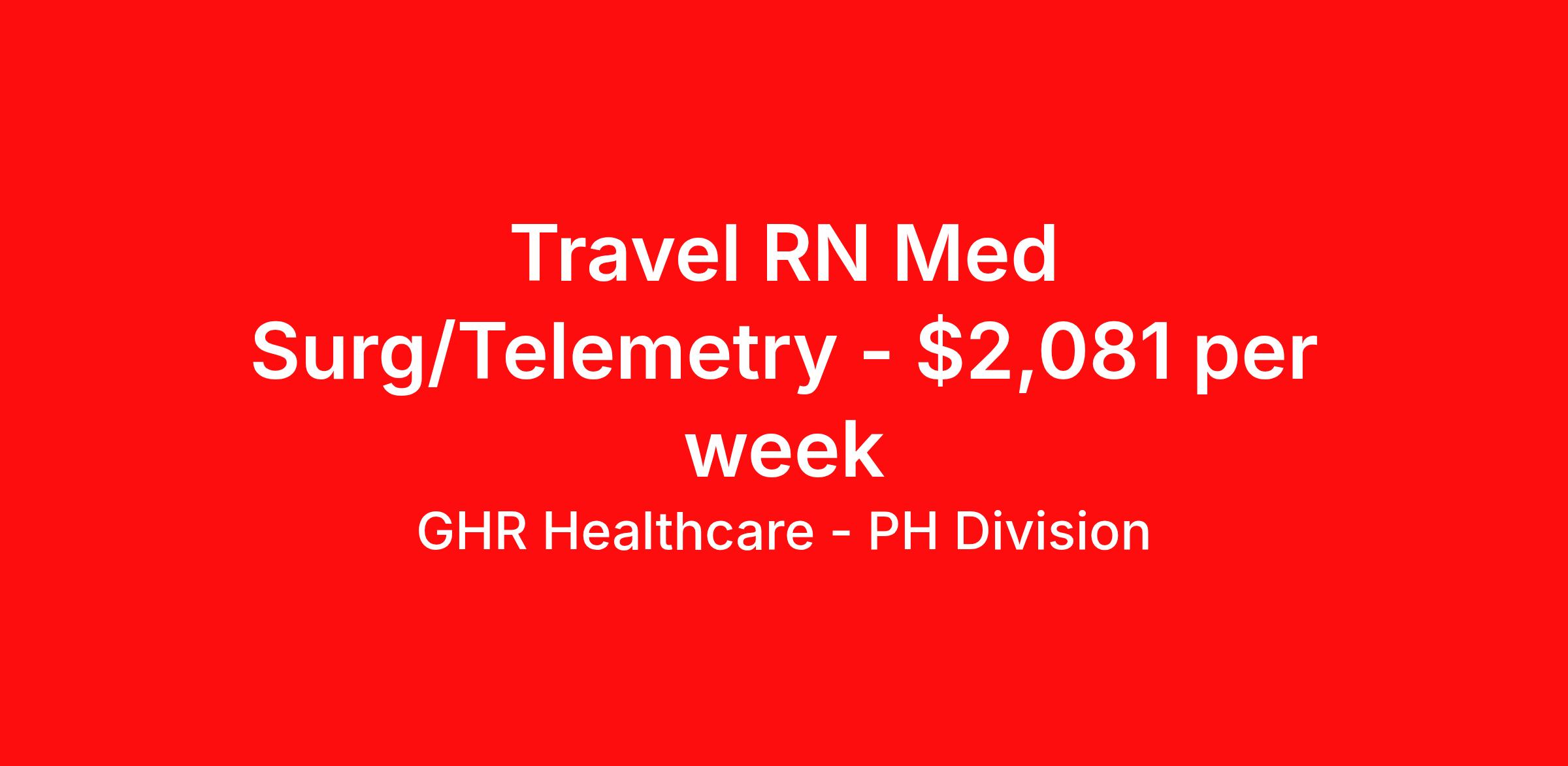 GHR Healthcare - PH Division is seeking a travel nurse RN Med Surg / Telemetry for a travel nursing job in Salina, Kansas. Job Description & Requirements Specialty: Med Surg / Telemetry Discipline: RN Start Date: 06/01/2026 Duration: 13 weeks 36 hours per week Shift: 12 hours Employment Type: Travel Planet Healthcare Job ID 76270347. Pay package is based on 12 hour shifts and 36 hours per week (subject to confirmation) with tax-free stipend amount to be determined. About GHR Healthcare - PH Division For over 30 years, GHR Healthcare has been the bridge between healthcare professionals and the facilities that need them nationwide. We're committed to uncovering your ideal fit, supported by GHR's dedication to competitive compensation, transparent communication, and a devoted team that genuinely cares about your career journey. You can trust us to stand by your side as your advocate, confidante, and partner in advancing your career. At GHR, care and consideration are at the heart of everything we do. Visit ghrhealthcare.com to learn more.
