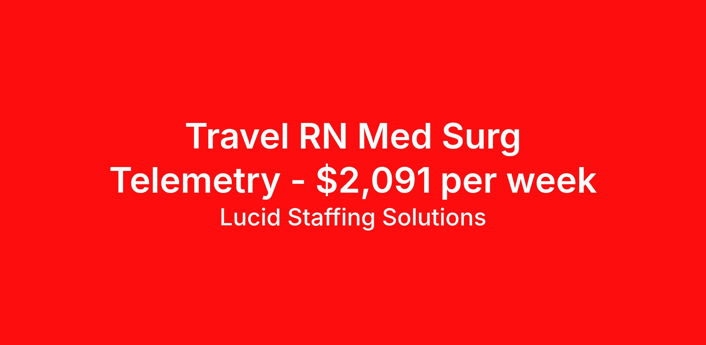 Lucid Staffing Solutions is seeking a travel nurse RN Med Surg / Telemetry for a travel nursing job in Ottumwa, Iowa. Job Description & Requirements Specialty: Med Surg / Telemetry Discipline: RN Duration: 13 weeks 36 hours per week Shift: 12 hours, nights Employment Type: Travel Job Description Position: Travel Registered Nurse (RN) with experience in MS-Tele Location: Ottumwa, Iowa Shift: 12hr Day Weekly Gross: $2090.56 Lucid Staffing Solutions was created by former healthcare workers who lived the short staffing, the chaotic workflows, and the nonstop pressure that comes with patient care. We built an agency powered by real clinical experience, kept simple and supportive, so you never have to guess whether the people guiding you actually know what they’re talking about. Minimum Requirements: Active license as a Registered Nurse (RN) Licensed in Iowa (If applicable) or compact eligible Two years of recent MS-Tele experience Active BLS Why Lucid Works for Travelers Paid Weekly: Stipends pushed to GSA limits whenever possible $500 Travel Reimbursement: Paid at the start of each assignment Clinician-Led Team: Recruiters and Account Managers with real clinical experience In-House Compliance: fast updates, real communication, and none of the delays that come with outsourced vendors. Health Coverage Options: Multiple medical plans plus dental, vision, and workers compensation 401(k) Match: 4 percent match after 6 months License & Certification Reimbursement: We help cover the cost of staying compliant Liability Insurance: Included automatically Referral Bonuses: $500 per referral, $750 after five referrals Ready to start your journey? Apply today to connect with a Clinician-Recruiter! Lucid Staffing Solutions Job ID 37051. Pay package is based on 12 hour shifts and 36 hours per week (subject to confirmation) with tax-free stipend amount to be determined. Posted job title: MS-Tele About Lucid Staffing Solutions Clinician Owned & Operated At Lucid Staffing Solutions, we do things differently—because we’ve been in your shoes. Founded by actual healthcare professionals, Lucid was built to fix the issues we experienced as travelers. We know what makes a great assignment: competitive pay, seamless onboarding, honest recruiters, and most importantly—working with a team that truly sees and supports you. Our entire team is made up of former clinicians who understand the demands of the job and what travelers truly need to succeed. We offer some of the highest paying allied health and nursing contracts across the country, along with some amazing benefits & perks. Whether you're chasing freedom, flexible schedules, bigger paychecks, or your next adventure, Lucid helps you get there—with real support, real respect , and real healthcare experts. Benefits Dental benefits Medical benefits Vision benefits