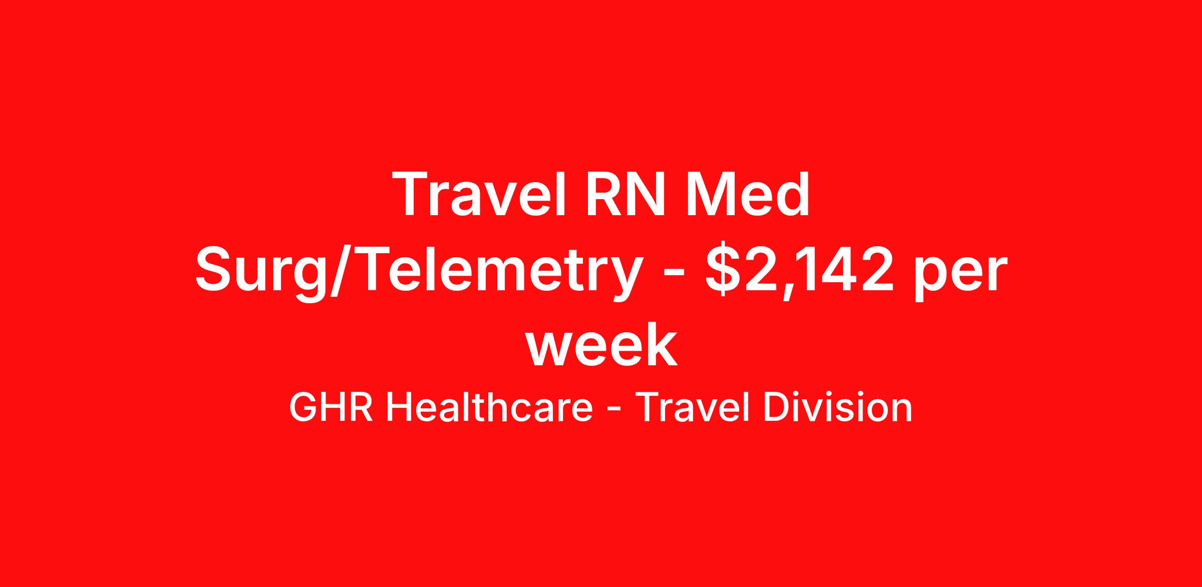GHR Healthcare - Travel Division is seeking a travel nurse RN Med Surg / Telemetry for a travel nursing job in Salina, Kansas. Job Description & Requirements Specialty: Med Surg / Telemetry Discipline: RN Start Date: 06/01/2026 Duration: 13 weeks 36 hours per week Shift: 12 hours Employment Type: Travel GHR Healthcare - Travel Division Job ID 76270347. Pay package is based on 12 hour shifts and 36 hours per week (subject to confirmation) with tax-free stipend amount to be determined. About GHR Healthcare - Travel Division For over 30 years, GHR Healthcare has been the bridge between healthcare professionals and the facilities that need them nationwide. We're committed to uncovering your ideal fit, supported by GHR's dedication to competitive compensation, transparent communication, and a devoted team that genuinely cares about your career journey. You can trust us to stand by your side as your advocate, confidante, and partner in advancing your career. At GHR, care and consideration are at the heart of everything we do. Visit ghrhealthcare.com to learn more.