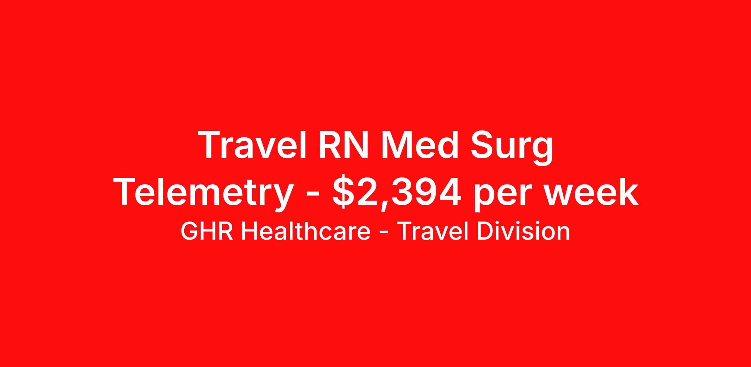GHR Healthcare - Travel Division is seeking a travel nurse RN Med Surg / Telemetry for a travel nursing job in Albany, New York. Job Description & Requirements Specialty: Med Surg / Telemetry Discipline: RN Start Date: ASAP Duration: 13 weeks 36 hours per week Shift: 12 hours Employment Type: Travel GHR Healthcare - Travel Division Job ID 75474059. Pay package is based on 12 hour shifts and 36 hours per week (subject to confirmation) with tax-free stipend amount to be determined. About GHR Healthcare - Travel Division For over 30 years, GHR Healthcare has been the bridge between healthcare professionals and the facilities that need them nationwide. We're committed to uncovering your ideal fit, supported by GHR's dedication to competitive compensation, transparent communication, and a devoted team that genuinely cares about your career journey. You can trust us to stand by your side as your advocate, confidante, and partner in advancing your career. At GHR, care and consideration are at the heart of everything we do. Visit ghrhealthcare.com to learn more.