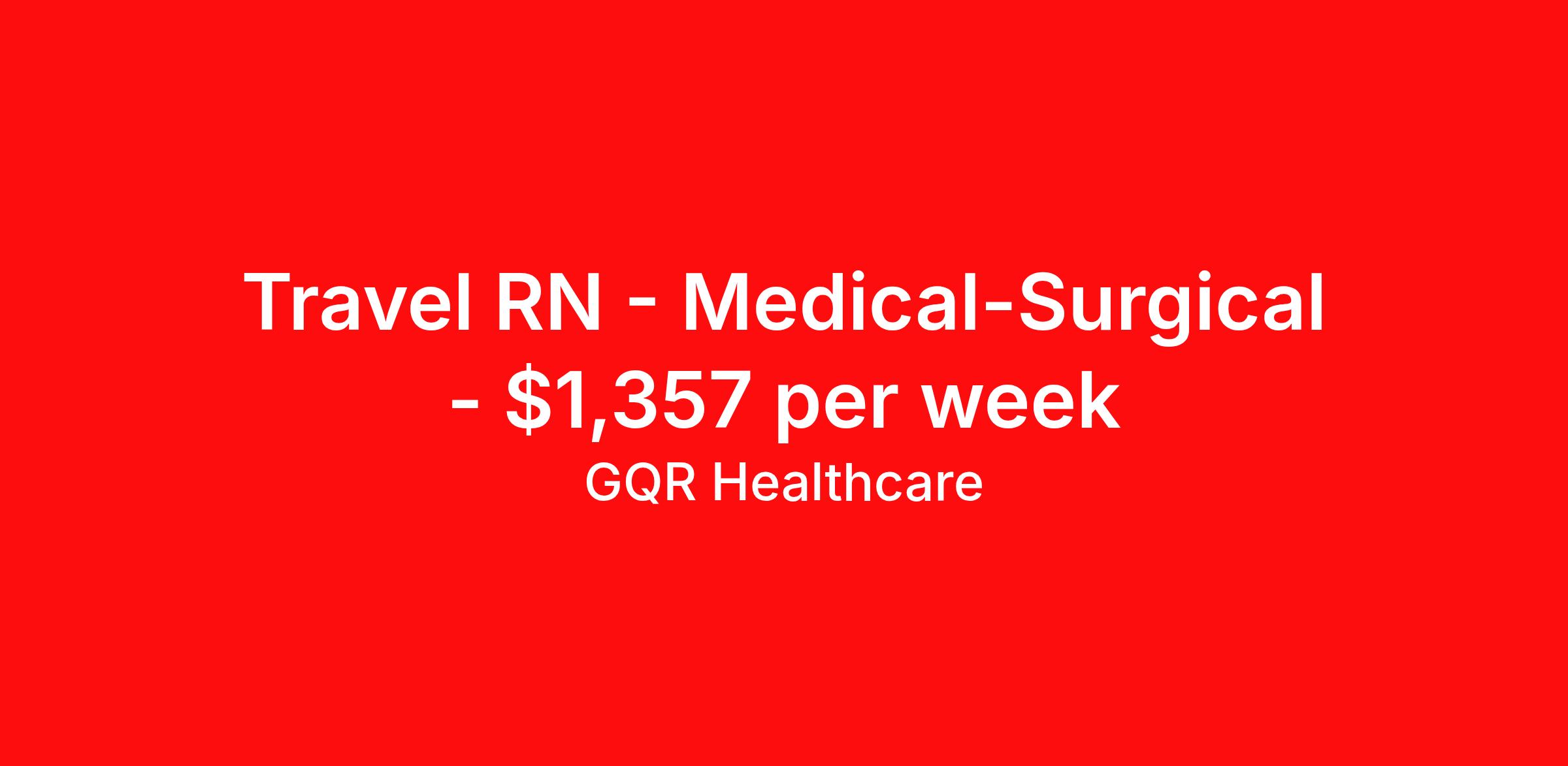 GQR Healthcare is seeking a travel nurse RN Med Surg for a travel nursing job in Granbury, Texas. Job Description & Requirements Specialty: Med Surg Discipline: RN Start Date: ASAP Duration: 13 weeks 36 hours per week Shift: 12 hours, nights Employment Type: Travel Medical-Surgical RN Job Location: Granbury, TX Profession: Registered Nurse Estimated Pay: $1357.20 Duration (weeks): 13 Specialty: Medical-Surgical Shift Details: Night *Estimated weekly pay includes projected hourly wages and weekly meal and lodging per diems for eligible clinicians based on nationally published GSA rates. Actual weekly pay and per diems may differ from the amount shown and are subject to change during an assignment. Benefits: Day 1 Insurance Cigna medical, MetLife dental and vision insurance License reimbursement for new licenses needed for each assignment Discounts with hotels and rental cars A dedicated recruiter and support team that will help you every step of the way to sure you start on time and have an exceptional experience Referral bonus up to $700 About the Company: Finding the right role is about more than just matching skills to a job—it’s about aligning with your goals, values, and the way you want to work. As an award-winning talent partner, we support healthcare professionals through every step of that process, offering meaningful opportunities, clear guidance, and long-term partnership. From our first conversation to your first day on the job (and beyond!), we’re here to help you move forward with confidence. GQR Job ID 769258. Pay package is based on 12 hour shifts and 36 hours per week (subject to confirmation) with tax-free stipend amount to be determined. Posted job title: Registered Nurse (RN) About GQR Healthcare GQR’s Healthcare team specializes in connecting experts within the industry to highly skilled healthcare professionals across the US market. In the competitive healthcare market, we recognize that the industry’s common goals of improved quality of care and patient outcomes are wholly reliant upon the professionals directly supporting these initiatives. Leveraging our extensive candidate network, we deliver continuity of care for the communities our partners serve to ensure the patient experience is of the highest quality. Through deep market specialization and a unique approach to talent acquisition, GQR Healthcare provides an unparalleled and personalized experience across all medical specialties in nursing and within diverse healthcare platforms across the industry.