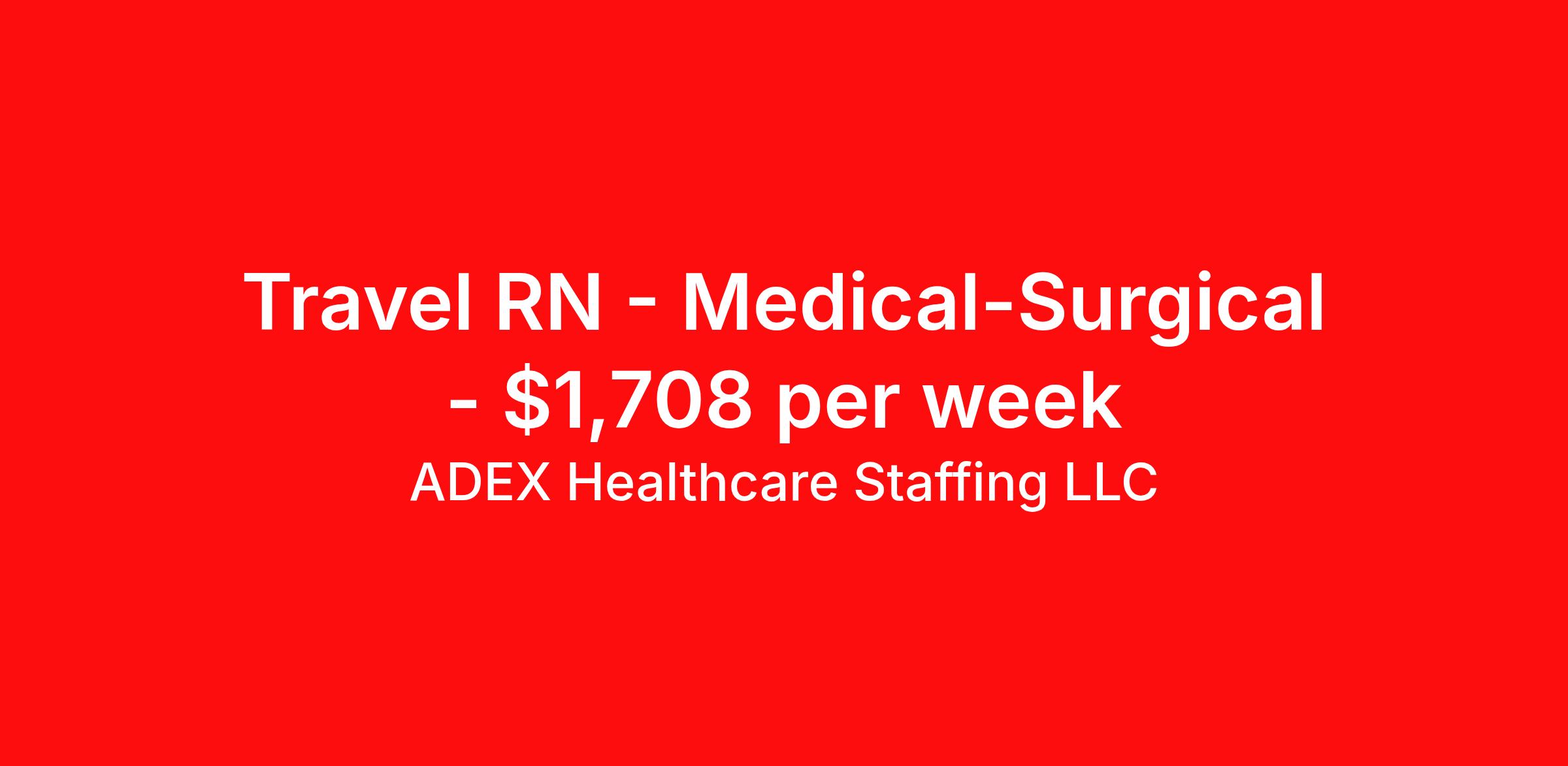ADEX Healthcare Staffing LLC is seeking a travel nurse RN Med Surg for a travel nursing job in Granbury, Texas. Job Description & Requirements Specialty: Med Surg Discipline: RN Start Date: ASAP Duration: 13 weeks 36 hours per week Shift: 12 hours, nights Employment Type: Travel RN Position Job Notes: Travel or Local Registered Nurse needed for ASAP start. A minimum of 2 years of recent hospital bedside experience is required. Candidates must be able to start within 5 weeks. Opportunity for extension upon successful completion of the initial assignment. $750 referral bonus available. Opportunity: RN - Med Surg Job Details: • Work night shifts from 6:45 PM to 7:15 AM • No call responsibilities • 40-bed unit with 6:1 patient ratio • May float to other medical surgical units • Required to wear royal blue scrubs • EMR system: MEDHOST • Required certifications: RN license, BLS (AHA or ARC), ACLS (AHA or ARC) • Must have 2 years of nursing experience • Medical surgical experience required • Travel experience preferred • Titers must be available at time of submission • Must be greater than 50 miles from facility • RTO available with advance request (maximum 3 days during blackout periods) • No 48-hour scheduling Facility: This medical center is a comprehensive healthcare facility providing quality patient care services to the community. The facility features a 40-bed medical surgical unit and utilizes MEDHOST electronic medical records system. The organization maintains high standards for patient care and provides a supportive environment for healthcare professionals to deliver exceptional medical services. Location: Granbury, TX Granbury offers a charming small-town atmosphere with beautiful lakefront living on Granbury City Beach and Lake Granbury. The area provides an excellent quality of life with historic downtown attractions, outdoor recreation opportunities, and a welcoming community atmosphere perfect for healthcare professionals seeking work-life balance. Adex Job ID 978111. Pay package is based on 12 hour shifts and 36 hours per week (subject to confirmation) with tax-free stipend amount to be determined. About ADEX Healthcare Staffing LLC ADEX has been placing healthcare professionals across the US since 2004. Originally founded in Atlanta, GA, the company's headquarters are now located in Tampa, FL. JCAHO certified since 2009. Benefits Referral bonus
