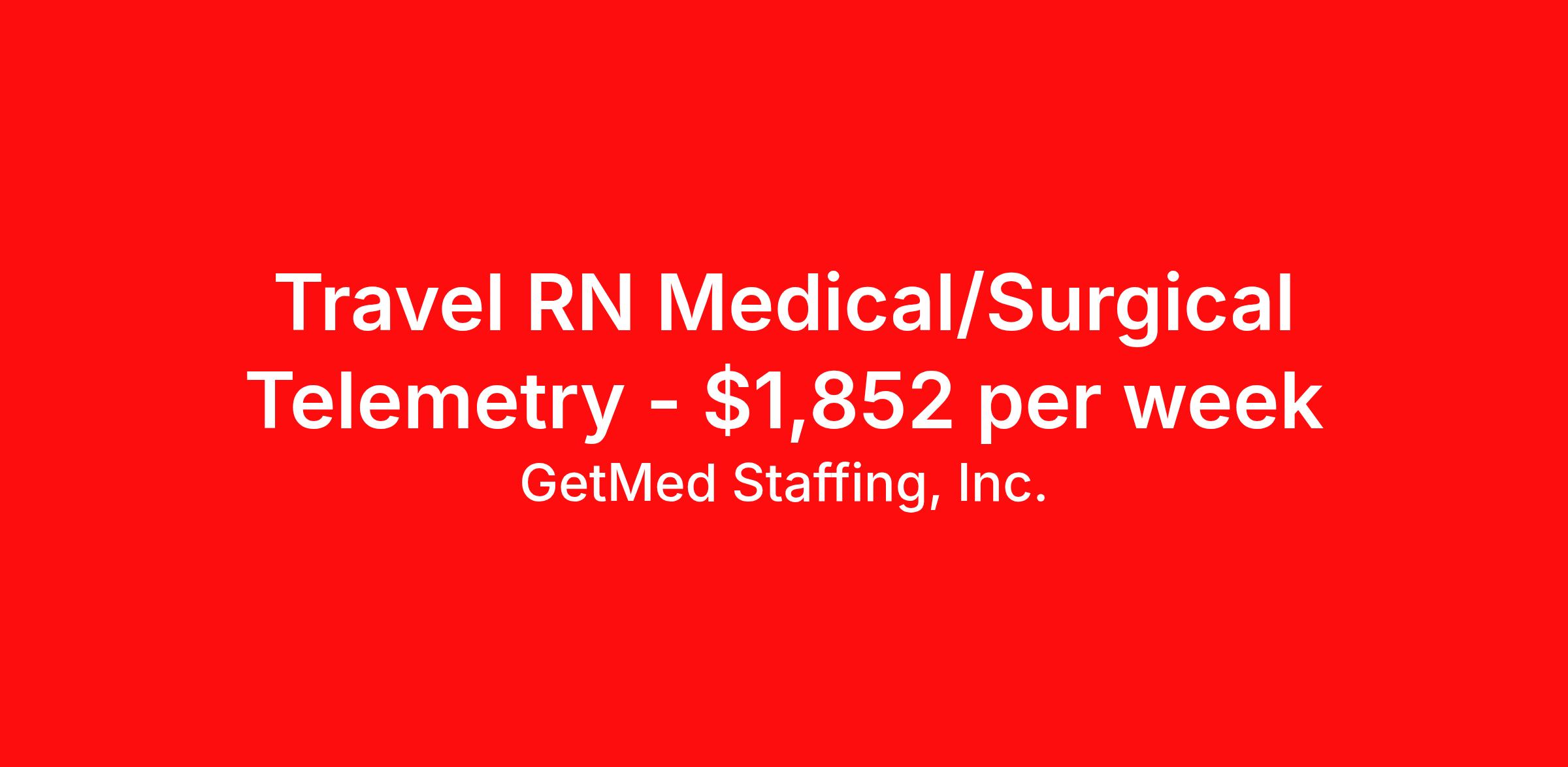 GetMed Staffing, Inc. is seeking a travel nurse RN Telemetry for a travel nursing job in Des Moines, Iowa. Job Description & Requirements Specialty: Telemetry Discipline: RN Start Date: ASAP Duration: 13 weeks 36 hours per week Shift: 12 hours, nights Employment Type: Travel GetMed Staffing is searching for a strong Telemetry RN to assist our traveler-friendly client. A minimum of 1-2 years of experience is required. Traveling with GetMed Staffing offers the unique opportunity to gain diverse experiences, both personally and professionally. Gain experience that matters. GetMed Staffing, Inc. Job ID 36004258. Pay package is based on 12 hour shifts and 36.0 hours per week (subject to confirmation) with tax-free stipend amount to be determined. Posted job title: RN:Telemetry,19:00:00-07:00:00 About GetMed Staffing, Inc. We are a diversity owned company, specializing in healthcare recruiting services. We truly understand how important a healthcare travelers' relationship is with their recruiter, as well as our relationship is with our healthcare facilities. We recognize that the needs of our healthcare travelers can vary, and therefore we provide the personalized touch necessary to ensure a successful travel assignment each and every time. Our healthcare facilities and clients benefit from us putting our healthcare travelers first. GetMed Staffing is excited to be a leader within the industry by focusing on providing healthcare travelers with more choices and possibilities as they plan for their next healthcare travel assignment. Benefits Life insurance Medical benefits Dental benefits Vision benefits 401k retirement plan
