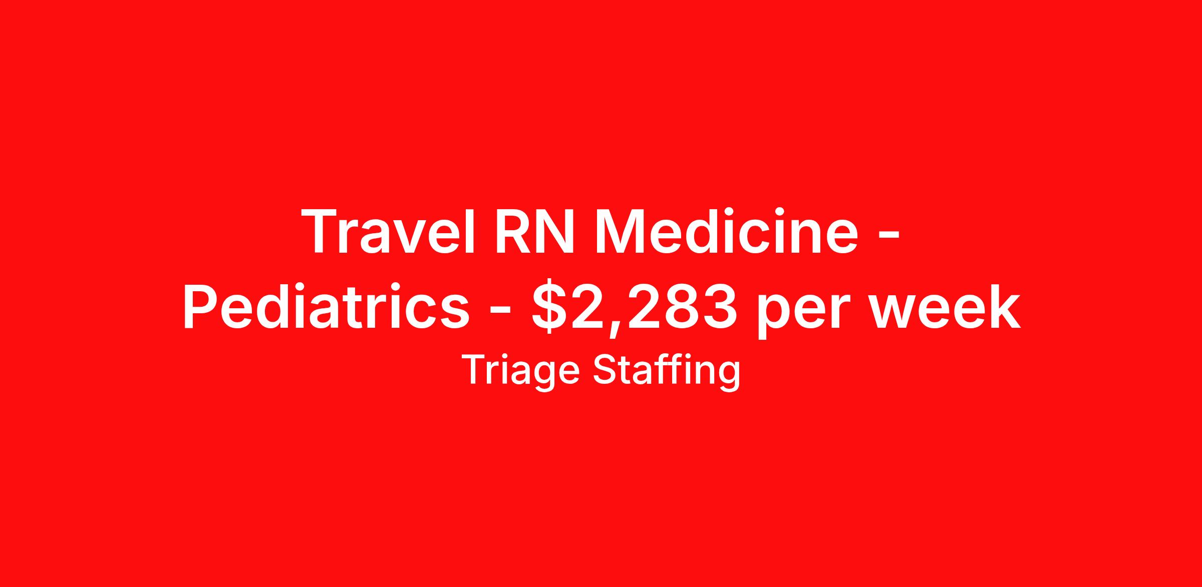Triage Staffing is seeking a travel nurse RN Pediatric Med Surg for a travel nursing job in Oklahoma City, Oklahoma. Job Description & Requirements Specialty: Pediatric Med Surg Discipline: RN Start Date: ASAP Duration: 13 weeks 36 hours per week Shift: 12 hours, days Employment Type: Travel Travel Nursing: Pediatrics Oklahoma City Location: Oklahoma City Start Date: 2/23/2026 Shift Details: 12H Days 36 hours per week Length: 13 WEEKS Apply for specific facility details.PEDS RN Triage Staffing Job ID D6WCFWAF. Posted job title: Nursing: Pediatrics About Triage Staffing At Triage, we prefer to be real . Real about expectations—both ours and yours. Real about how a decision you make today could affect your tomorrows. Real about how compensation actually works. Real about how great—or grating—your next supervisor may be. Being real allows everyone at Triage to be ready . Ready to serve you with real honesty. So if that gig near the ocean is really no day at the beach, or that third shift comes with a second-class rate, we tell you. So you can be ready, too. We staff all five major divisions of acute care—nursing, lab, radiology, cardiopulmonary and rehab therapy, offering: - Competitive, custom pay packages - One point of contact for both travelers and facilities (per division) - A reliable recruiter who's got your back throughout your entire assignment - In-house compliance and accounting specialists - A clinical liaison team available 24/7 to offer medical and professional support and career development - A mentoring program that is run and managed by actual clinicians—yeah, you read that right - And more (because of course there’s more) Are we the biggest? No. Are we the best? That’s rather subjective, but we’re trying to be. Will we work like hell to get you as close to your idea of heaven as possible? Yes. Yes, we will. Benefits: Day One comprehensive, nationwide insurance plans for health, vision and dental and life—including a HSA option Day One 401(k) program with employer-matching contributions once eligible Facility cancelling protection—your time is money on and off-the-clock Guaranteed hours Weekly paychecks via direct deposit Earned vacation bonuses for time worked Paid holidays Employee assistance program (EAP)—your mental health is important, too Continuing education, certification and licensing reimbursement Workers comp—because accidents happen Top-rated professional liability insurance Company provided housing options Referral bonus—$750 in your pocket after they’ve completed a 13-week assignment