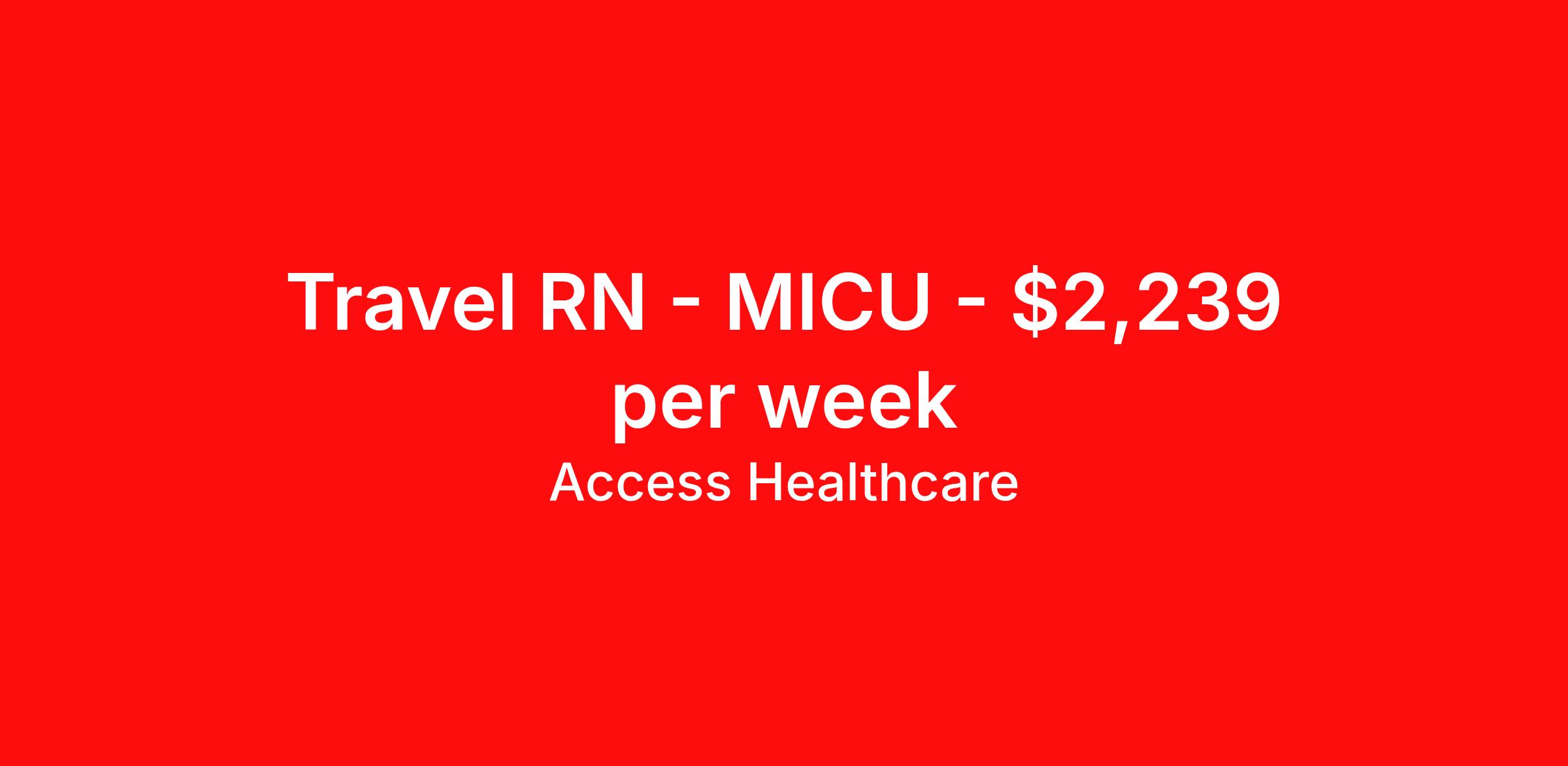 Access Healthcare is seeking a travel nurse RN MICU - Medical Intensive Care Unit for a travel nursing job in Columbus, Ohio. Job Description & Requirements Specialty: MICU - Medical Intensive Care Unit Discipline: RN Start Date: 04/20/2026 Duration: 13 weeks 36 hours per week Shift: 12 hours, nights Employment Type: Travel Access Healthcare Job ID 76335205. Pay package is based on 12 hour shifts and 36 hours per week (subject to confirmation) with tax-free stipend amount to be determined. About Access Healthcare Access Healthcare aims to provide superior service to our nursing family by providing around the clock support, competitive pay packages and an unmatched benefits package! Unlike other agencies, we offer a true family feel and work with you to find the placement that is right for you. We offer one of the top leading pay packages in the industry and we are ready to get you the money you deserve! Access Healthcare was founded by two travel nurses, Danielle and Diego, who had a dream and a shared vision of creating an agency which all nurses would want to work with. Our passion has led us to where we are today as one of the top 10 agencies in our home state of New Jersey, with access to contracts in all 50 states! We encourage you to join our team and we cannot wait to get to know you!