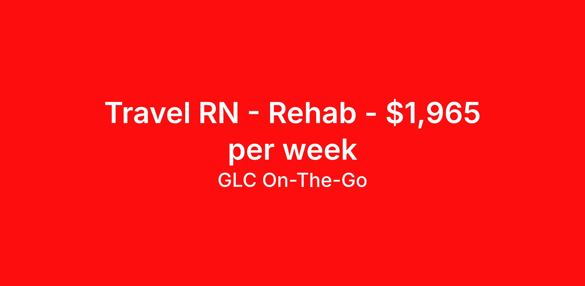 GLC On-The-Go is seeking a travel nurse RN Rehabilitation for a travel nursing job in Tuscaloosa, Alabama. Job Description & Requirements Specialty: Rehabilitation Discipline: RN Start Date: 04/13/2026 Duration: 13 weeks 36 hours per week Shift: 12 hours Employment Type: Travel GLC is hiring: RN Rehabilitation - Tuscaloosa, AL - 13-week contract GLC – Named Best Nurse Agency 2024–2025 We connect nurses, nursing professionals, and allied health professionals like you to contracts that align with your skills, schedule, and career goals. About this Assignment Join the care team in Rehabilitation where you’ll provide patient-centered care in a collaborative environment. Typical responsibilities include direct patient care, timely documentation, and coordination with the care team. Specific duties will be confirmed during your interview with a recruiter. Assignment Details Location: Tuscaloosa, AL Assignment Length: 13 weeks Start Date: 04/13/2026 End Date: 07/12/2026 Pay Range: $1,769 - $1,965 Minimum Requirements Active license in Rehabilitation 1 year full-time RN, Rehabilitation experience within the last 2 years What you can expect from GLC Weekly on-time pay with direct deposit Transparent communication, clear assignment details, and recruiter support from start to finish - or extension Referral bonus up to $500 Health, dental, and vision insurance 401(k) plan Completion and signing bonuses may also be available Ready to move forward? Apply now and start your rewarding journey with GLC - a recruiter will connect quickly to review pay , start date , and assignment details so you can make the best decision for your next contract. GLC On-The-Go Job ID 504433. Pay package is based on 12 hour shifts and 36 hours per week (subject to confirmation) with tax-free stipend amount to be determined. Posted job title: DCH - RN - Rehab - DAYS About GLC On-The-Go GLC is more than just a staffing agency – we’re your trusted partner in finding travel, local, and PRN contracts that align with your career aspirations and lifestyle. We specialize in connecting travel nurses and allied healthcare professionals like you with opportunities in acute care, long-term care, behavioral health, and allied fields across the U.S. Our attentive and friendly recruiters are always just a call or text away, ready to guide you at every step, ensuring you feel valued and heard. We understand the unique needs of travel healthcare professionals, which is why we offer comprehensive benefits and 24/7 support. Join GLC, where our 20 years of experience mean we know how to help you find the assignments that turn your career goals into reality. With us, it's not just a placement – it's your dream career made possible