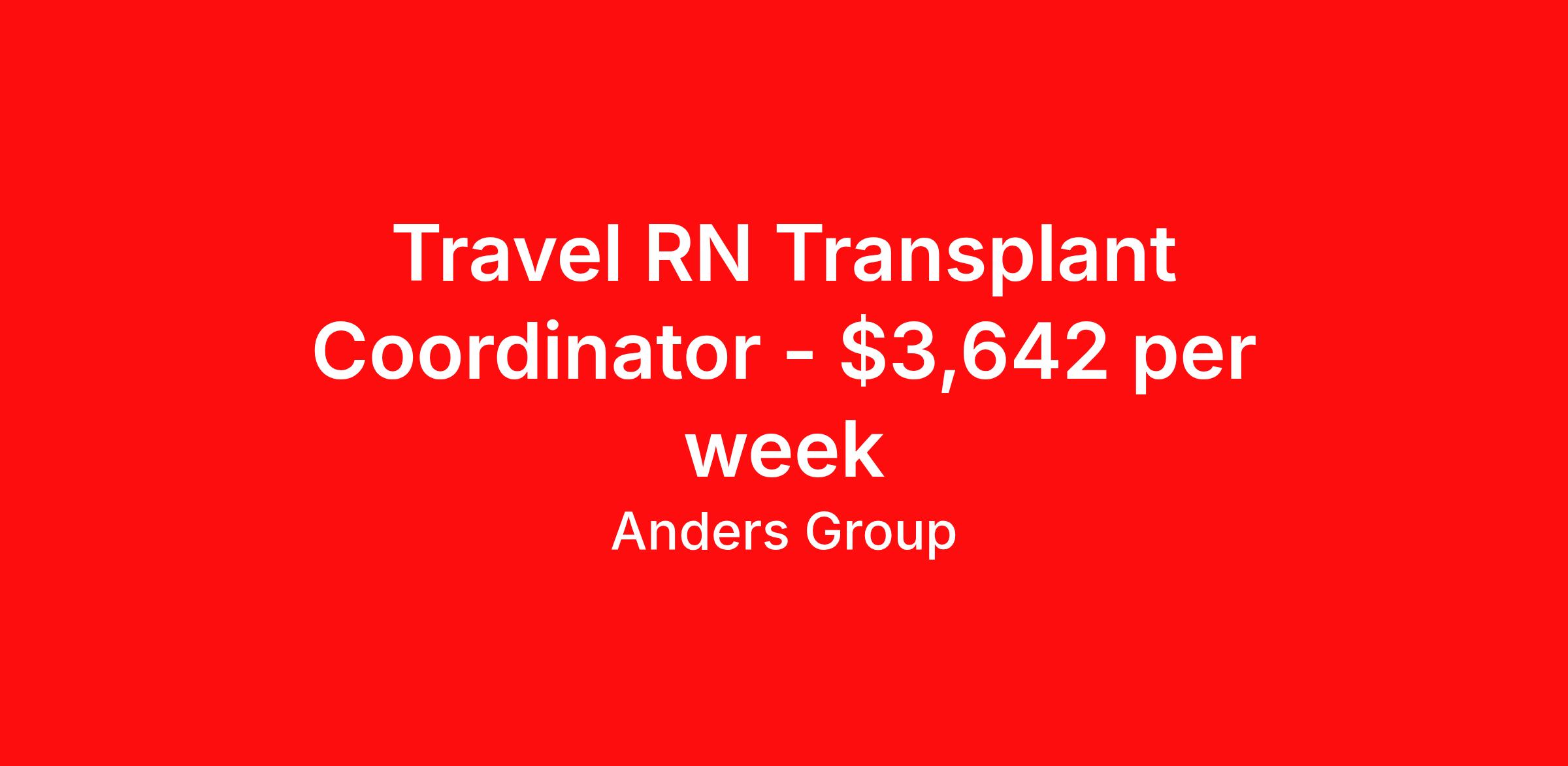 Anders Group is seeking a travel nurse RN Transplant for a travel nursing job in Los Angeles, California. Job Description & Requirements Specialty: Transplant Discipline: RN Start Date: 04/13/2026 Duration: 13 weeks 40 hours per week Shift: 8 hours, days Employment Type: Travel Anders Group Job ID 993754. Pay package is based on 8 hour shifts and 40 hours per week (subject to confirmation) with tax-free stipend amount to be determined. Posted job title: Registered Nurse - Transplant Coordinator @ UCLA Health International About Anders Group WHY ANDERS? Anders Group is a Joint Commission accredited staffing agency and stands out from other agencies by our commitment to making sure our travelers are given the best customer service. Our team works hard to find the best jobs with the most aggressive rates! Anders Group offers rewarding assignments and competitive compensation packages, nationwide! We offer the following benefits from day one: Health Insurance, Including a Buy-up Option Dental Insurance Vision Insurance Life Insurance 401(k) Licensure Reimbursement Premium Pay Packages CEU Reimbursements Daily Per Diems Travel Reimbursements Rental Car Allowances Continuing Education Resources Referral Bonus And Many More! THE ANDERS DIFFERENCE You're committed to providing exceptional healthcare. We're committed to you. Anders Group was founded by a team of healthcare recruiters who had built strong relationships with healthcare facilities and professionals nationwide. As staffing firms shifted their focus to numbers and margins, these recruiters saw a need for a company to take a different approach to staffing. Anders Group was founded in 2010 to do just that. We focus on individual and facility goals to make quality placements. Great people working with great facilities make for the best placements. Through our focus on providing the best experience to Allied and Nursing health care professionals, Anders Group has grown to be a top staffing firm in Healthcare. We look forward to working with you! Benefits Medical benefits Dental benefits Vision benefits Life insurance 401k retirement plan License and certification reimbursement Continuing Education Referral bonus
