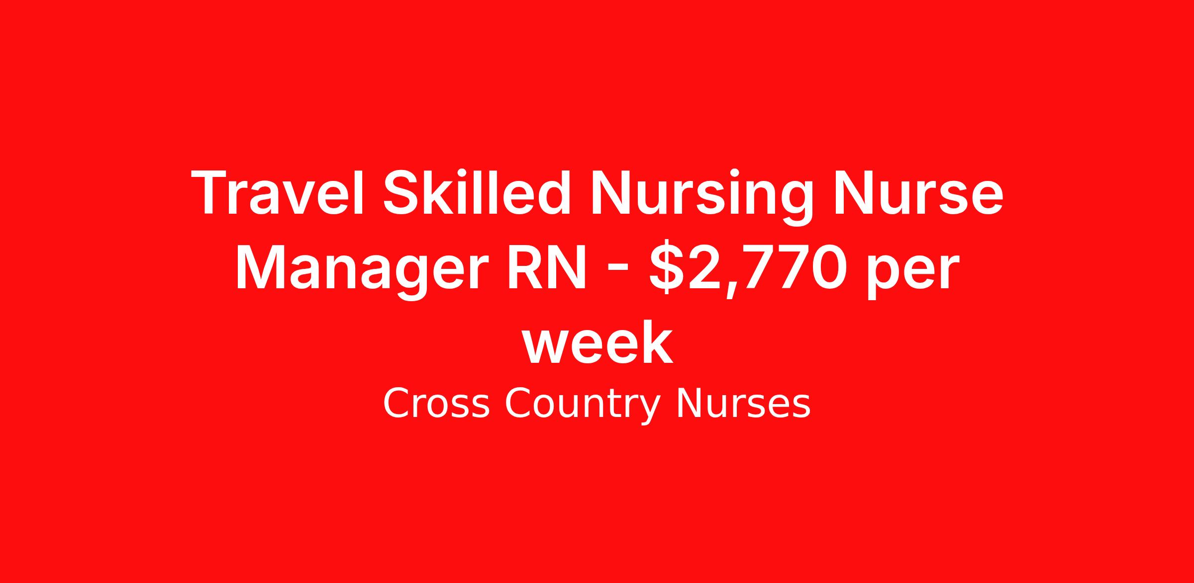 Cross Country Nurses is seeking a travel nurse RN Skilled Nursing Facility (SNF) Manager, Skilled Nursing for a travel nursing job in Roundup, Montana. Job Description & Requirements Specialty: Skilled Nursing Discipline: RN Start Date: 04/06/2026 Duration: 13 weeks 40 hours per week Shift: 8 hours, days Employment Type: Travel Job Description As a registered nurse - nurse manager skilled nursing (RN), you will supervise staff and oversee patient care at a skilled nursing facility. You'll encourage best practices, conduct training and evaluations, and focus on creating a positive patient and staff experience. Your duties will require strengths in leadership, communication, technology, organization and collaboration. You'll play an essential role in ensuring staff has the tools and resources they need to deliver safe, high-quality care within the skilled nursing facility. Minimum Requirements At least 1 year of recent acute care experience in specialty Active RN license Benefits The benefits of taking a travel nursing job with Cross Country include: Private housing or generous housing allowance Comprehensive health insurance with prescription coverage Dependent health insurance with prescription coverage Competitive salaries Referral bonuses Travel reimbursement 401(k) retirement plan Direct deposit/free checking Unlimited free CE credits Cross Country Job ID 1229519. Pay package is based on 8 hour shifts and 40 hours per week (subject to confirmation) with tax-free stipend amount to be determined. Posted job title: Registered Nurse / Nurse Manager Skilled Nursing About Cross Country Nurses You care for others — we’re here to care for you. At Cross Country, we know travel nursing is about more than just the job. It’s about building a career that supports your lifestyle, your values, and your impact. We offer competitive pay, full benefits, and 24/7 support from a team that truly understands what it means to be on the front lines. Wherever your journey takes you, we’re with you every step of the way. Let’s build your best life — one assignment at a time. Benefits 401k retirement plan Referral bonus