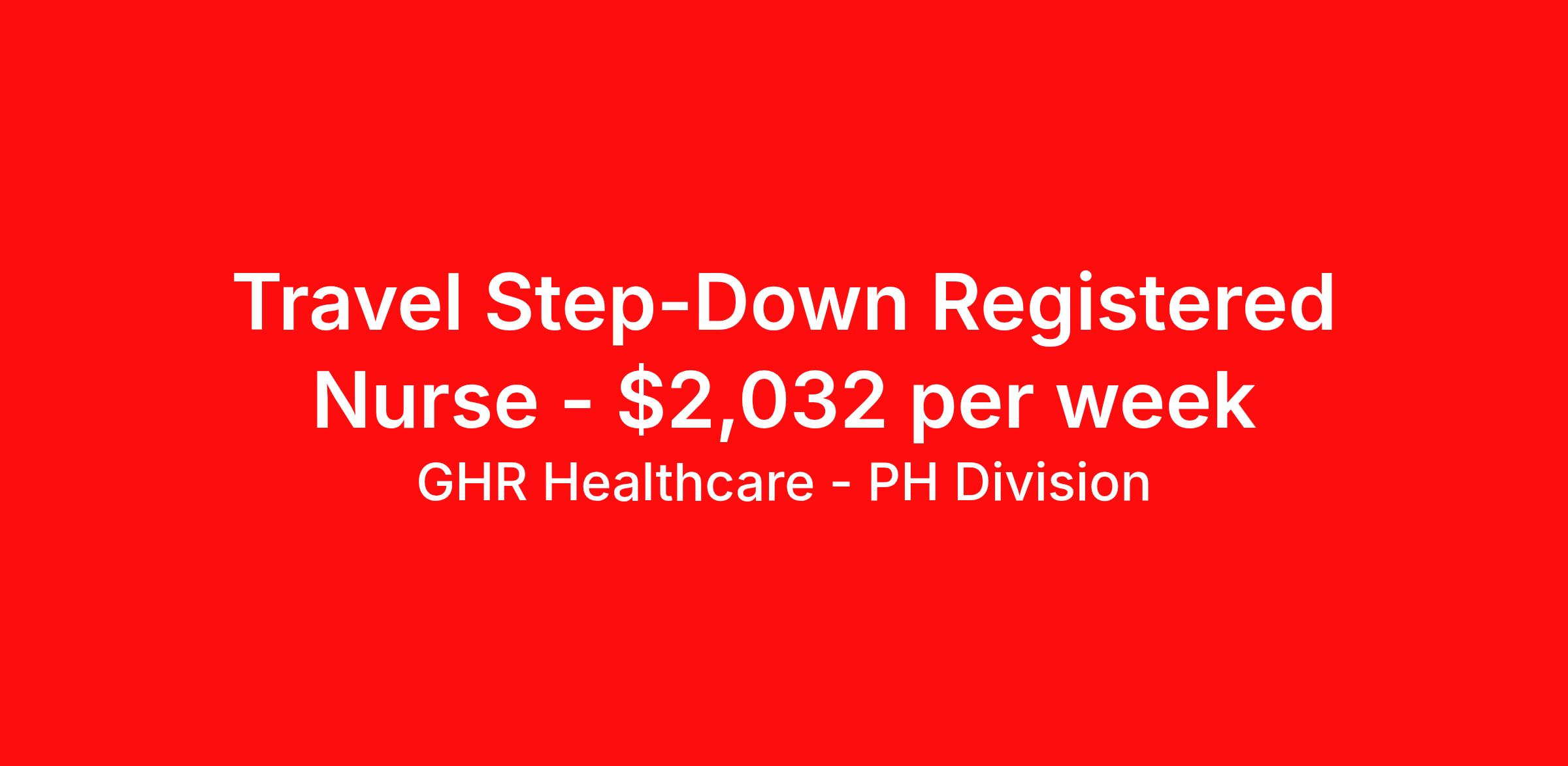 GHR Healthcare - PH Division is seeking a travel nurse RN Stepdown for a travel nursing job in Dayton, Ohio. Job Description & Requirements Specialty: Stepdown Discipline: RN Start Date: 04/13/2026 Duration: 13 weeks 36 hours per week Shift: 12 hours Employment Type: Travel Planet Healthcare Job ID 76427384. Pay package is based on 12 hour shifts and 36 hours per week (subject to confirmation) with tax-free stipend amount to be determined. About GHR Healthcare - PH Division For over 30 years, GHR Healthcare has been the bridge between healthcare professionals and the facilities that need them nationwide. We're committed to uncovering your ideal fit, supported by GHR's dedication to competitive compensation, transparent communication, and a devoted team that genuinely cares about your career journey. You can trust us to stand by your side as your advocate, confidante, and partner in advancing your career. At GHR, care and consideration are at the heart of everything we do. Visit ghrhealthcare.com to learn more.