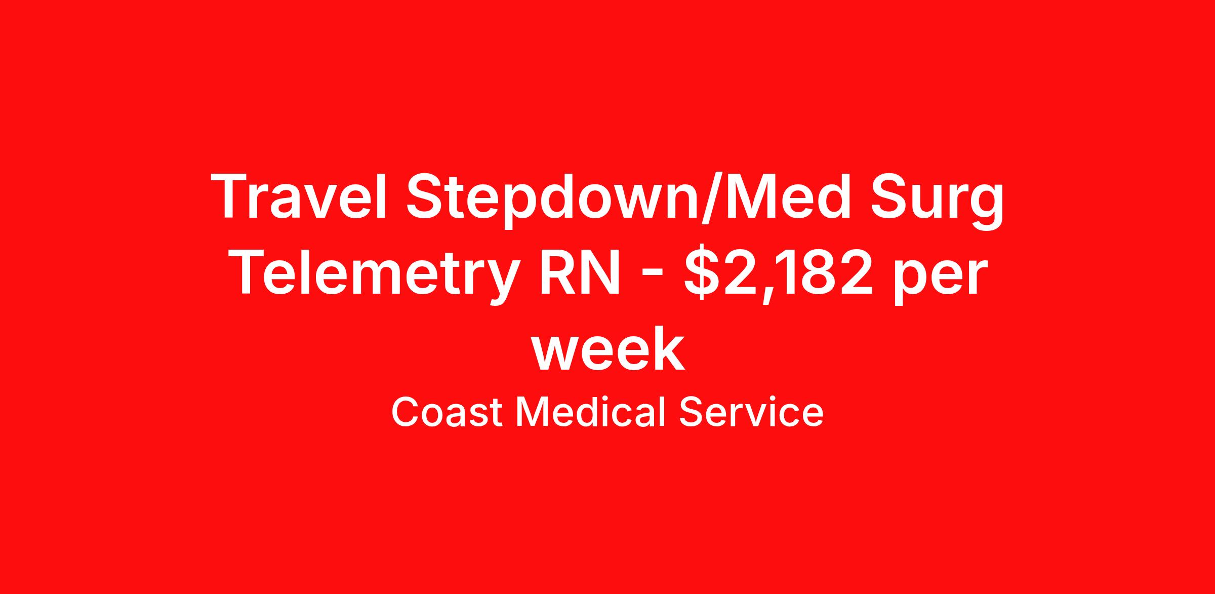 Coast Medical Service is seeking a travel nurse RN Med Surg / Telemetry for a travel nursing job in Muscatine, Iowa. Job Description & Requirements Specialty: Med Surg / Telemetry Discipline: RN Start Date: 04/06/2026 Duration: 13 weeks 36 hours per week Shift: 12 hours, nights Employment Type: Travel Coast Medical Service is a nationwide travel nursing & allied healthcare staffing agency dedicated to providing an elite traveler experience for the experienced or first-time traveler. Coast is featured on Blue Pipes' 2023 Best Travel Agencies and named a 2022 Top Rated Healthcare Staffing Firm & 2023 First Half Top Rated Healthcare Staffing Firm by Great Recruiters. Please note that pay rate may differ for locally based candidates. Please apply here or contact a recruiter directly to learn more about this position & the facility, and/or explore others that may be of interest to you. We look forward to speaking with you! Coast Medical Services Job ID 36157571. Pay package is based on 12 hour shifts and 36.0 hours per week (subject to confirmation) with tax-free stipend amount to be determined. Posted job title: RN:MS/Tele,19:00:00-07:30:00