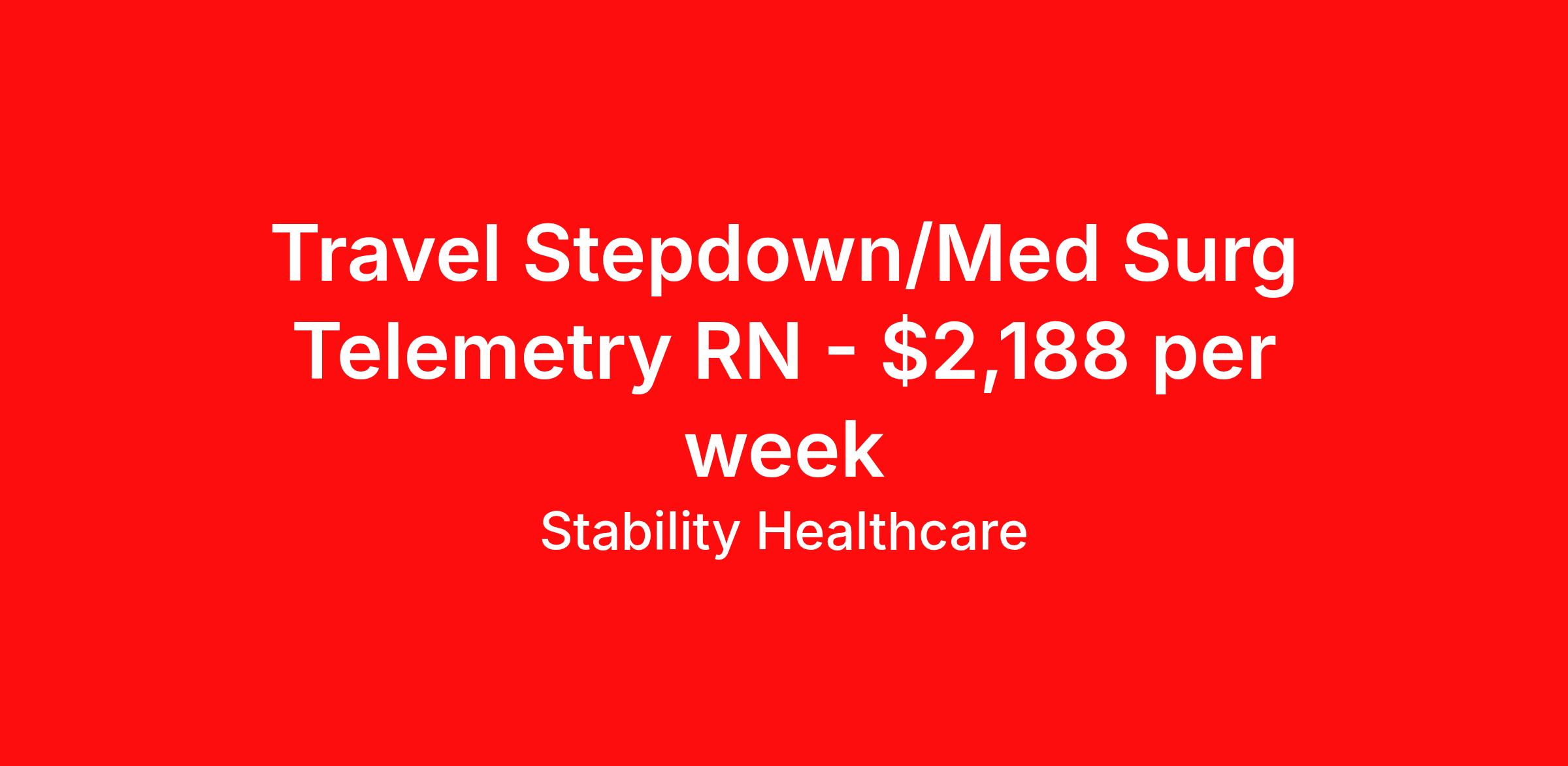 Stability Healthcare is seeking a travel nurse RN Med Surg / Telemetry for a travel nursing job in Muscatine, Iowa. Job Description & Requirements Specialty: Med Surg / Telemetry Discipline: RN Duration: 13 weeks 36 hours per week Shift: 12 hours, nights Employment Type: Travel Stability Healthcare is looking for a Tele Med-Surg RN contract position in Muscatine, IA. The Medical Surgical Telemetry Registered Nurse (RN) provides direct nursing care in accordance with established policies, procedures and protocols of the healthcare organization often specializing in Neuro, Ortho or Cardiac patients. *$600 travel bonus *Day 1 health insurance with United Healthcare *PTO plan start accruing on day 1, use during contract or cash out at the end! *Guaranteed stipend if facility calls you off *Extra hour bonus earn an additional hourly bonus for working over your weekly contracted hours Stability Job ID 827238. Pay package is based on 12 hour shifts and 36 hours per week (subject to confirmation) with tax-free stipend amount to be determined. Posted job title: Tele Med-Surg About Stability Healthcare Stability Healthcare was founded in 2009, with the mission of becoming the best Travel Nursing Agency in California. We have been rated one of the top travel nursing agencies and offer our nurses the highest paying travel nursing jobs available. We have access to the best travel assignments from 1000’s of facilities. You can start the year off in sunny California, spend the Spring in the Colorado Rockies, enjoy the Summer in the Mid-West, experience the change of seasons in Boston and New York, and hit the beaches of Florida in the winter. Our Nurses work in the best hospitals and health systems in the country. Benefits Guaranteed Hours Benefits start day 1