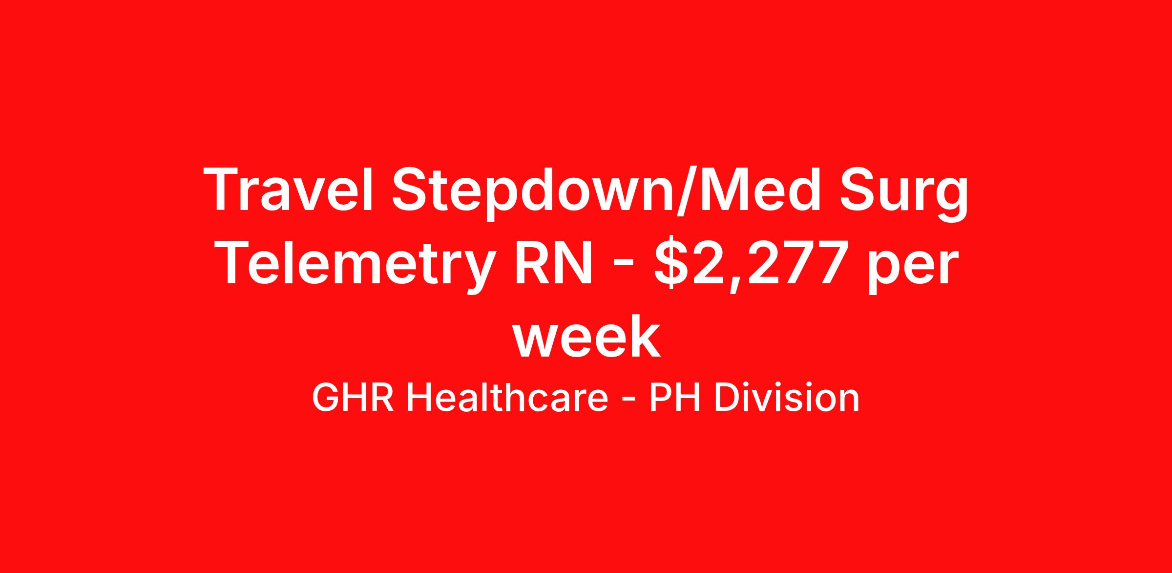 GHR Healthcare - PH Division is seeking a travel nurse RN Med Surg / Telemetry for a travel nursing job in Muscatine, Iowa. Job Description & Requirements Specialty: Med Surg / Telemetry Discipline: RN Start Date: 04/06/2026 Duration: 13 weeks 36 hours per week Shift: 12 hours Employment Type: Travel Planet Healthcare Job ID 76337990. Pay package is based on 12 hour shifts and 36 hours per week (subject to confirmation) with tax-free stipend amount to be determined. About GHR Healthcare - PH Division For over 30 years, GHR Healthcare has been the bridge between healthcare professionals and the facilities that need them nationwide. We're committed to uncovering your ideal fit, supported by GHR's dedication to competitive compensation, transparent communication, and a devoted team that genuinely cares about your career journey. You can trust us to stand by your side as your advocate, confidante, and partner in advancing your career. At GHR, care and consideration are at the heart of everything we do. Visit ghrhealthcare.com to learn more.