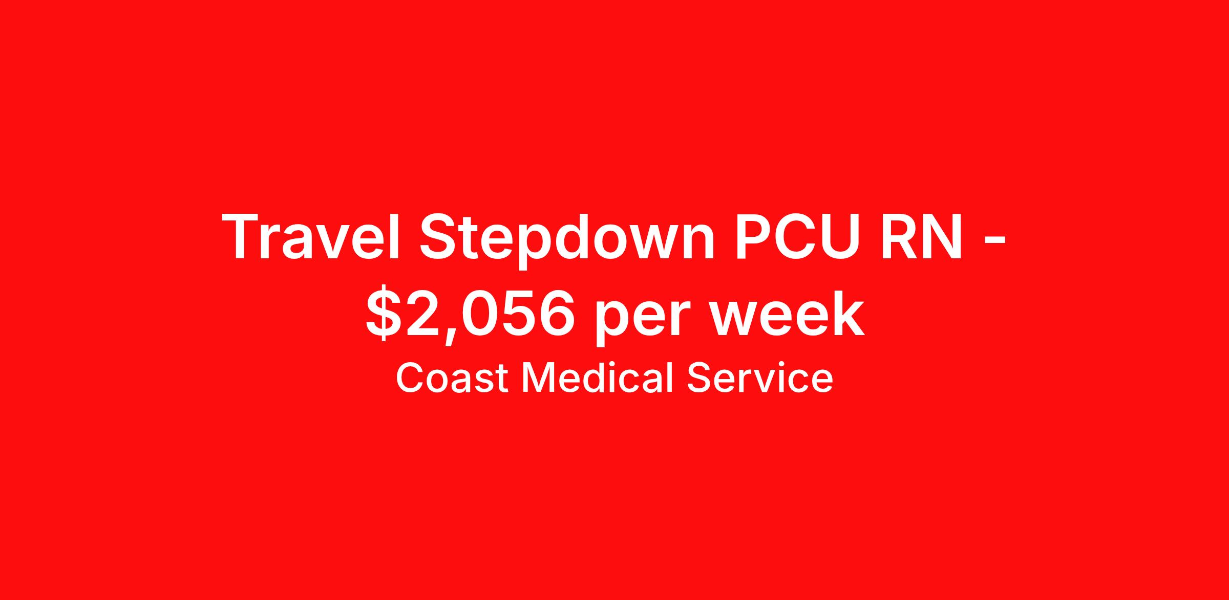 Coast Medical Service is seeking a travel nurse RN PCU - Progressive Care Unit for a travel nursing job in Plattsburgh, New York. Job Description & Requirements Specialty: PCU - Progressive Care Unit Discipline: RN Start Date: 03/26/2026 Duration: 4 weeks 36 hours per week Shift: 12 hours, nights Employment Type: Travel Coast Medical Service is a nationwide travel nursing & allied healthcare staffing agency dedicated to providing an elite traveler experience for the experienced or first-time traveler. Coast is featured on Blue Pipes' 2023 Best Travel Agencies and named a 2022 Top Rated Healthcare Staffing Firm & 2023 First Half Top Rated Healthcare Staffing Firm by Great Recruiters. Please note that pay rate may differ for locally based candidates. Please apply here or contact a recruiter directly to learn more about this position & the facility, and/or explore others that may be of interest to you. We look forward to speaking with you! Coast Medical Services Job ID 36060435. Pay package is based on 12 hour shifts and 36.0 hours per week (subject to confirmation) with tax-free stipend amount to be determined. Posted job title: RN:Stepdown (PCU),19:00:00-07:30:00