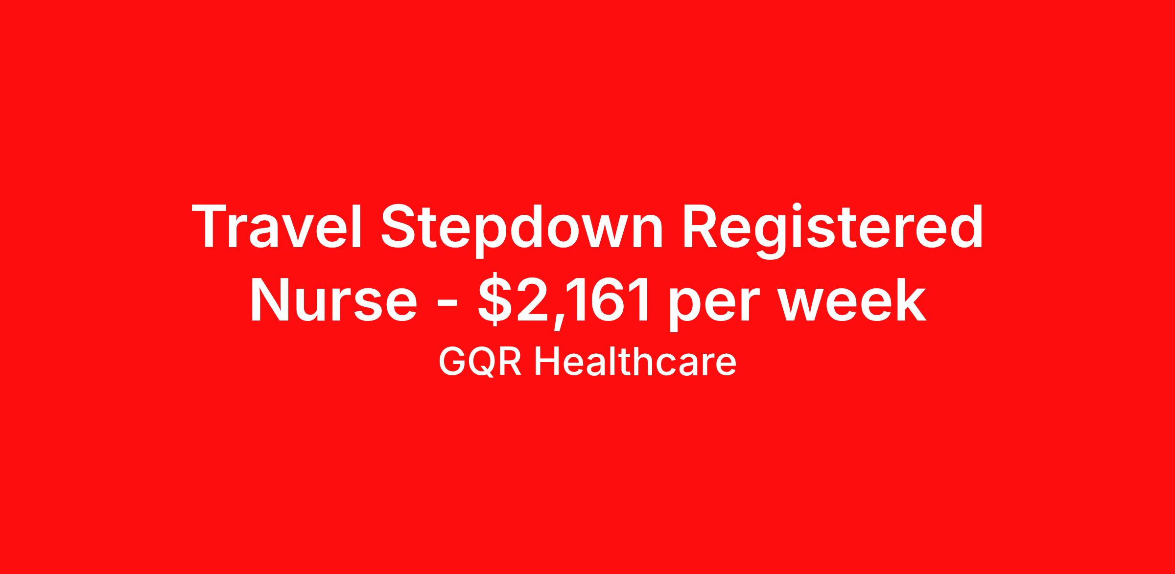 GQR Healthcare is seeking a travel nurse RN Stepdown for a travel nursing job in Cleveland, Ohio. Job Description & Requirements Specialty: Stepdown Discipline: RN Start Date: 04/17/2026 Duration: 13 weeks 36 hours per week Shift: 12 hours Employment Type: Travel Contract - W2 Cardiac Stepdown (PCU/IMC) Registered Nurse (RN) Job Location: Cleveland, Ohio Start Date: April 17, 2026 Profession: Registered Nurse (RN) Facility: Estimated Pay: $2161.11 - $2256.11 Duration:13 weeks Specialty:Cardiac Stepdown (PCU/IMC) Shift: Shift Details: null null Job Type: Travel *Estimated weekly pay includes projected hourly wages and weekly meal and lodging per diems for eligible clinicians based on nationally published GSA rates. Actual weekly pay and per diems may differ from the amount shown and are subject to change during an assignment. Benefits: Day 1 Insurance Cigna medical, MetLife dental and vision insurance License reimbursement for new licenses needed for each assignment Discounts with hotels and rental cars A dedicated recruiter and support team that will help you every step of the way to sure you start on time and have an exceptional experience Referral bonus up to $700 About the Company: Finding the right role is about more than just matching skills to a job—it’s about aligning with your goals, values, and the way you want to work. As an award-winning talent partner, we support healthcare professionals through every step of that process, offering meaningful opportunities, clear guidance, and long-term partnership. From our first conversation to your first day on the job (and beyond!), we’re here to help you move forward with confidence. GQR Job ID 787653. Pay package is based on 12 hour shifts and 36 hours per week (subject to confirmation) with tax-free stipend amount to be determined. Posted job title: Registered Nurse (RN) About GQR Healthcare GQR’s Healthcare team specializes in connecting experts within the industry to highly skilled healthcare professionals across the US market. In the competitive healthcare market, we recognize that the industry’s common goals of improved quality of care and patient outcomes are wholly reliant upon the professionals directly supporting these initiatives. Leveraging our extensive candidate network, we deliver continuity of care for the communities our partners serve to ensure the patient experience is of the highest quality. Through deep market specialization and a unique approach to talent acquisition, GQR Healthcare provides an unparalleled and personalized experience across all medical specialties in nursing and within diverse healthcare platforms across the industry.
