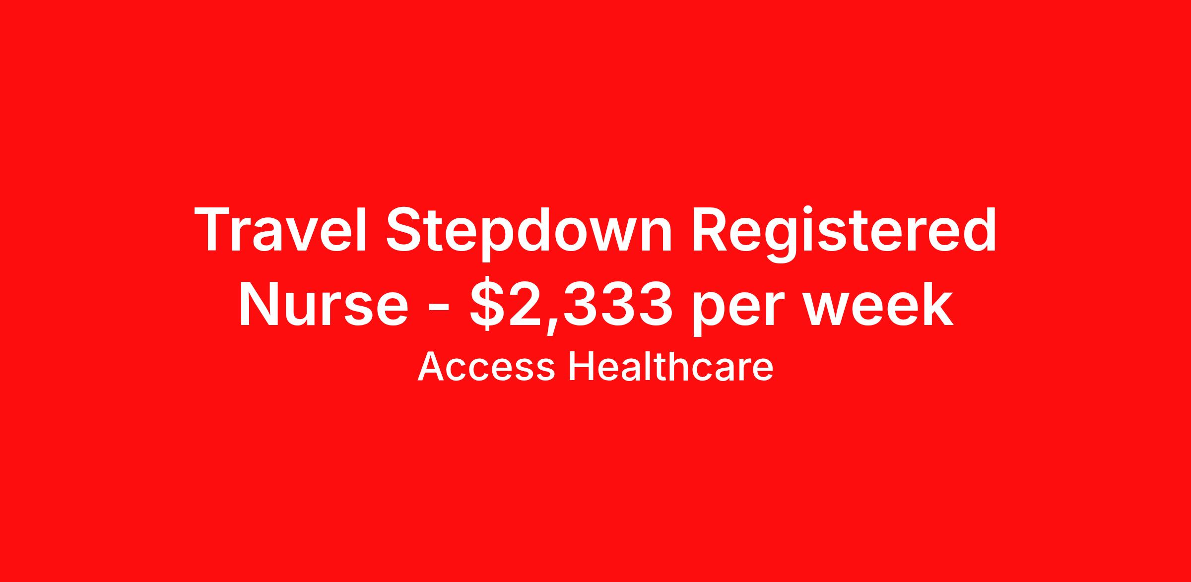 Access Healthcare is seeking a travel nurse RN Stepdown for a travel nursing job in Saint Joseph, Missouri. Job Description & Requirements Specialty: Stepdown Discipline: RN Start Date: 04/07/2026 Duration: 13 weeks 36 hours per week Shift: 12 hours, days Employment Type: Travel Access Healthcare Job ID 76330330. Pay package is based on 12 hour shifts and 36 hours per week (subject to confirmation) with tax-free stipend amount to be determined. About Access Healthcare Access Healthcare aims to provide superior service to our nursing family by providing around the clock support, competitive pay packages and an unmatched benefits package! Unlike other agencies, we offer a true family feel and work with you to find the placement that is right for you. We offer one of the top leading pay packages in the industry and we are ready to get you the money you deserve! Access Healthcare was founded by two travel nurses, Danielle and Diego, who had a dream and a shared vision of creating an agency which all nurses would want to work with. Our passion has led us to where we are today as one of the top 10 agencies in our home state of New Jersey, with access to contracts in all 50 states! We encourage you to join our team and we cannot wait to get to know you!