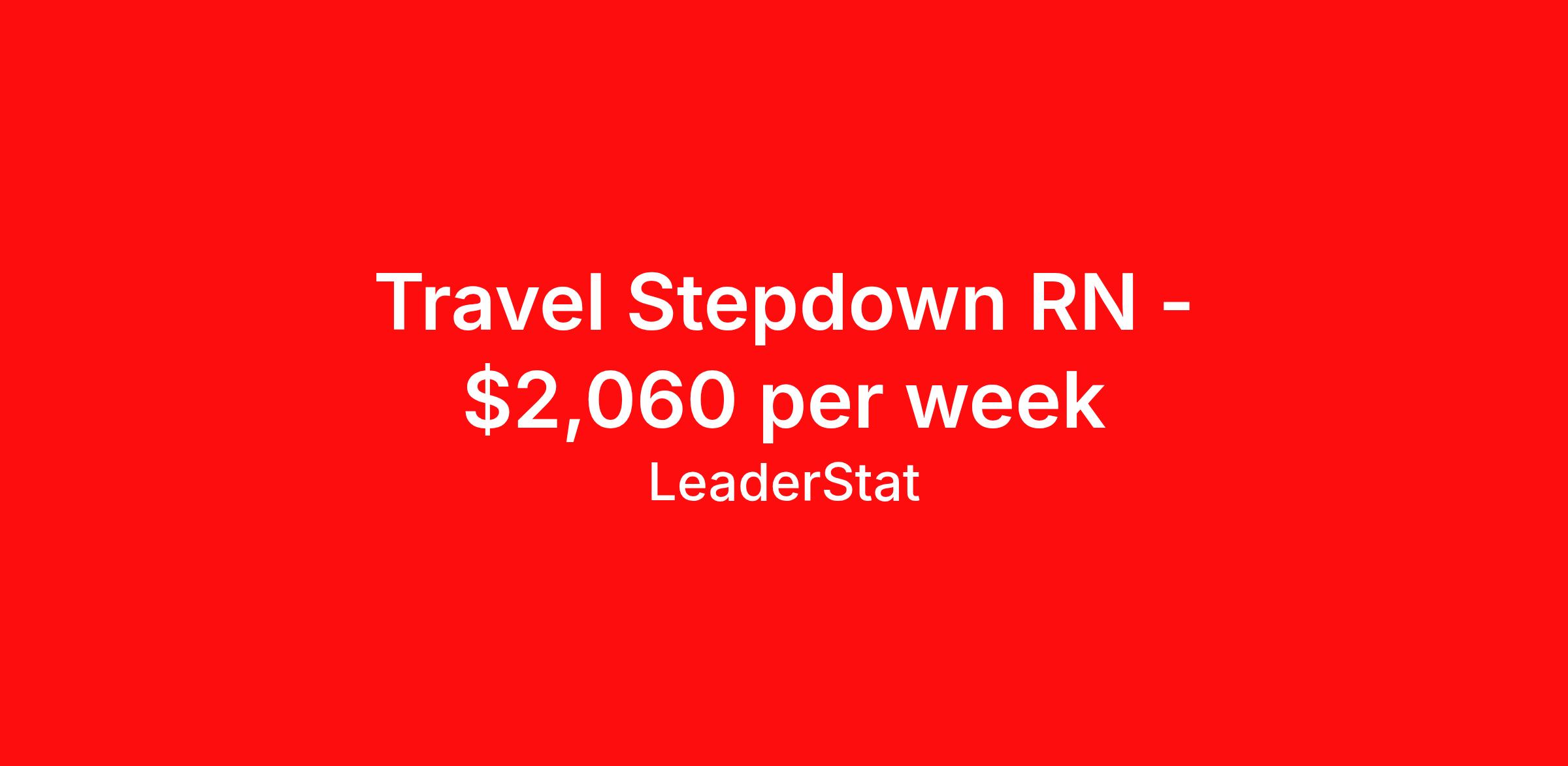 LeaderStat is seeking a travel nurse RN Stepdown for a travel nursing job in Mason City, Iowa. Job Description & Requirements Specialty: Stepdown Discipline: RN Start Date: ASAP Duration: 13 weeks 36 hours per week Shift: 12 hours Employment Type: Travel Estimated Pay Package : Up to $ 2060.32 per week *The above pay package is an estimate, please contact our team to put together your personalized pay package, as a variety of factors can influence your total pay.* Registered Nurse - RN Step Down | Registered Nurse - RN in Mason City, IA LeaderStat is currently seeking a Registered Nurse - RN with Step Down | Registered Nurse - RN experience for a(n) 13 week contract in IA. Start Date: 11/24/2024 End Date: 2/22/2025 1 year of experience working as a full-time Registered Nurse Clinical experience within the last 2 years Current State Licensure Current Relevant Certifications (BLS, ACLS, etc) The LeaderStat Difference Our LeaderStat recruiters are experts in Travel Nursing! We work hard to find the best travel nurse jobs for each candidate. However, our service doesn’t end at placement. We set you up for success by providing support throughout your contract… from start to finish! Our goal is to find the best travel nurse assignments to fit your individual needs. While you focus on providing top-notch care to your patients, we’ll handle the rest. LeaderStat Perks & Benefits As a Traveling Nurse with LeaderStat you receive excellent benefits: Weekly Pay & Direct Deposit W2 Employee Status 401(k) Retirement Plan Medical, Dental and Vision Insurance Referral Bonuses Dedicated Support Team To learn more about LeaderStat visit www.leaderstat.com/travel-nursing Equal Employment Opportunity: LeaderStat, Ltd. prohibits discrimination with respect to the hiring or promotion of individuals, conditions of employment, disciplinary and discharge practices or any other aspect of employment on the basis of sex, race, color, age, national origin, religion, disability, marital status, sexual orientation, gender identity, pregnancy or veteran status. AcuteTravelers Allied LeaderStat Job ID 225030. Pay package is based on 12 hour shifts and 36 hours per week (subject to confirmation) with tax-free stipend amount to be determined. Posted job title: Step Down Unit - Registered Nurse About LeaderStat LeaderStat is a National staffing, recruiting, and consulting firm dedicated to the healthcare industry. For 20 years, LeaderStat has been dedicated to partnering with exceptional healthcare providers to find them the very best assignments throughout the country. Specializing in Travel Nursing, Interim Leadership, Executive Search, and Consulting. When you work with the LeaderStat team, you work with a recruiter who is dedicated to finding you the perfect assignment. Why would you settle for less? Benefits Referral bonus License and certification reimbursement Medical benefits Holiday Pay Weekly pay 401k retirement plan