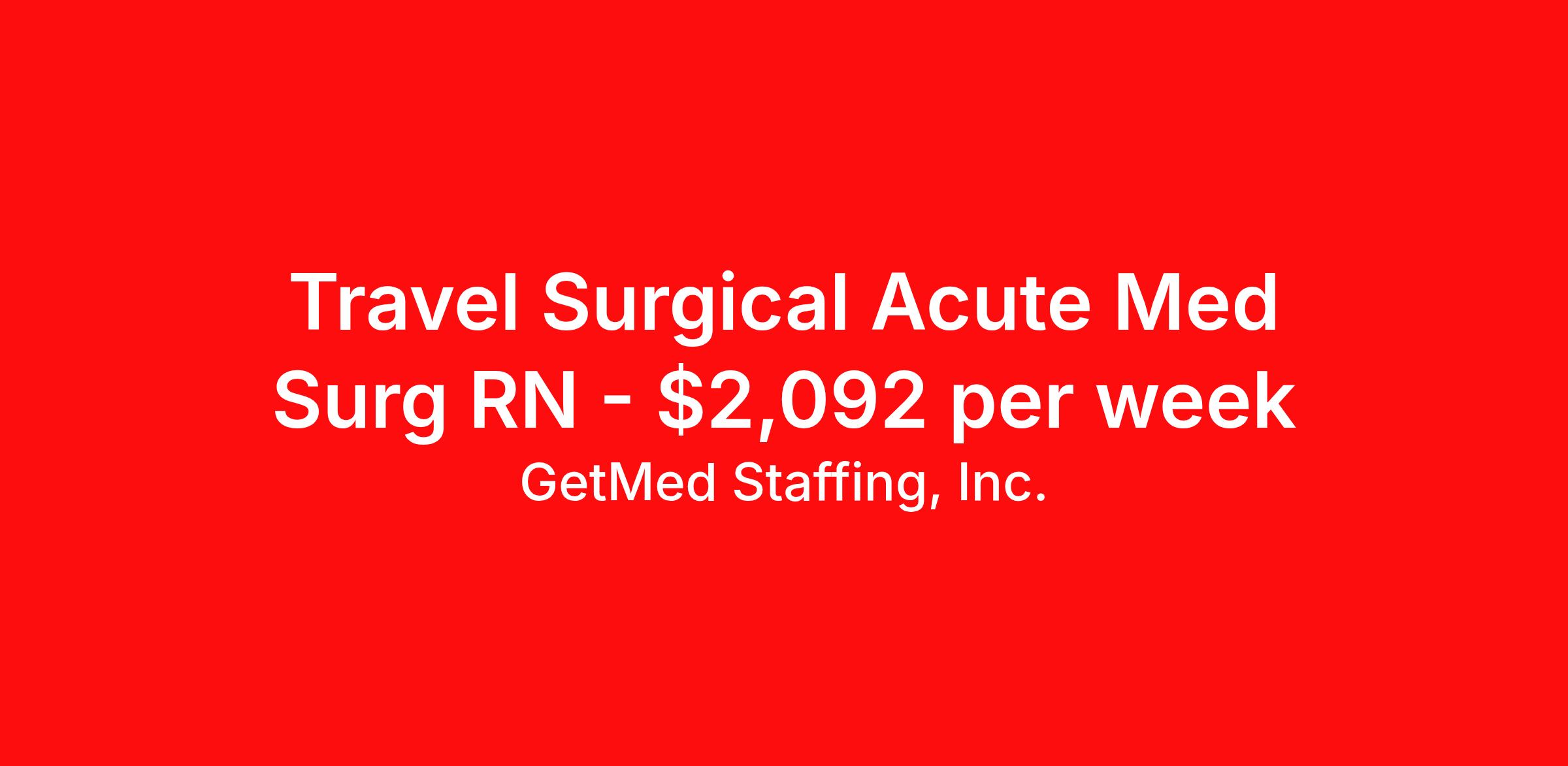 GetMed Staffing, Inc. is seeking a travel nurse RN Med Surg for a travel nursing job in Peoria, Illinois. Job Description & Requirements Specialty: Med Surg Discipline: RN Start Date: 03/30/2026 Duration: 13 weeks 36 hours per week Shift: 12 hours, nights Employment Type: Travel GetMed Staffing is searching for a strong MedSurg RN to assist our traveler-friendly client. A minimum of 1-2 years of experience is required. Traveling with GetMed Staffing offers the unique opportunity to gain diverse experiences, both personally and professionally. Gain experience that matters. GetMed Staffing, Inc. Job ID 36161634. Pay package is based on 12 hour shifts and 36.0 hours per week (subject to confirmation) with tax-free stipend amount to be determined. Posted job title: RN:MedSurg,19:00:00-07:00:00 About GetMed Staffing, Inc. We are a diversity owned company, specializing in healthcare recruiting services. We truly understand how important a healthcare travelers' relationship is with their recruiter, as well as our relationship is with our healthcare facilities. We recognize that the needs of our healthcare travelers can vary, and therefore we provide the personalized touch necessary to ensure a successful travel assignment each and every time. Our healthcare facilities and clients benefit from us putting our healthcare travelers first. GetMed Staffing is excited to be a leader within the industry by focusing on providing healthcare travelers with more choices and possibilities as they plan for their next healthcare travel assignment. Benefits Life insurance Medical benefits Dental benefits Vision benefits 401k retirement plan