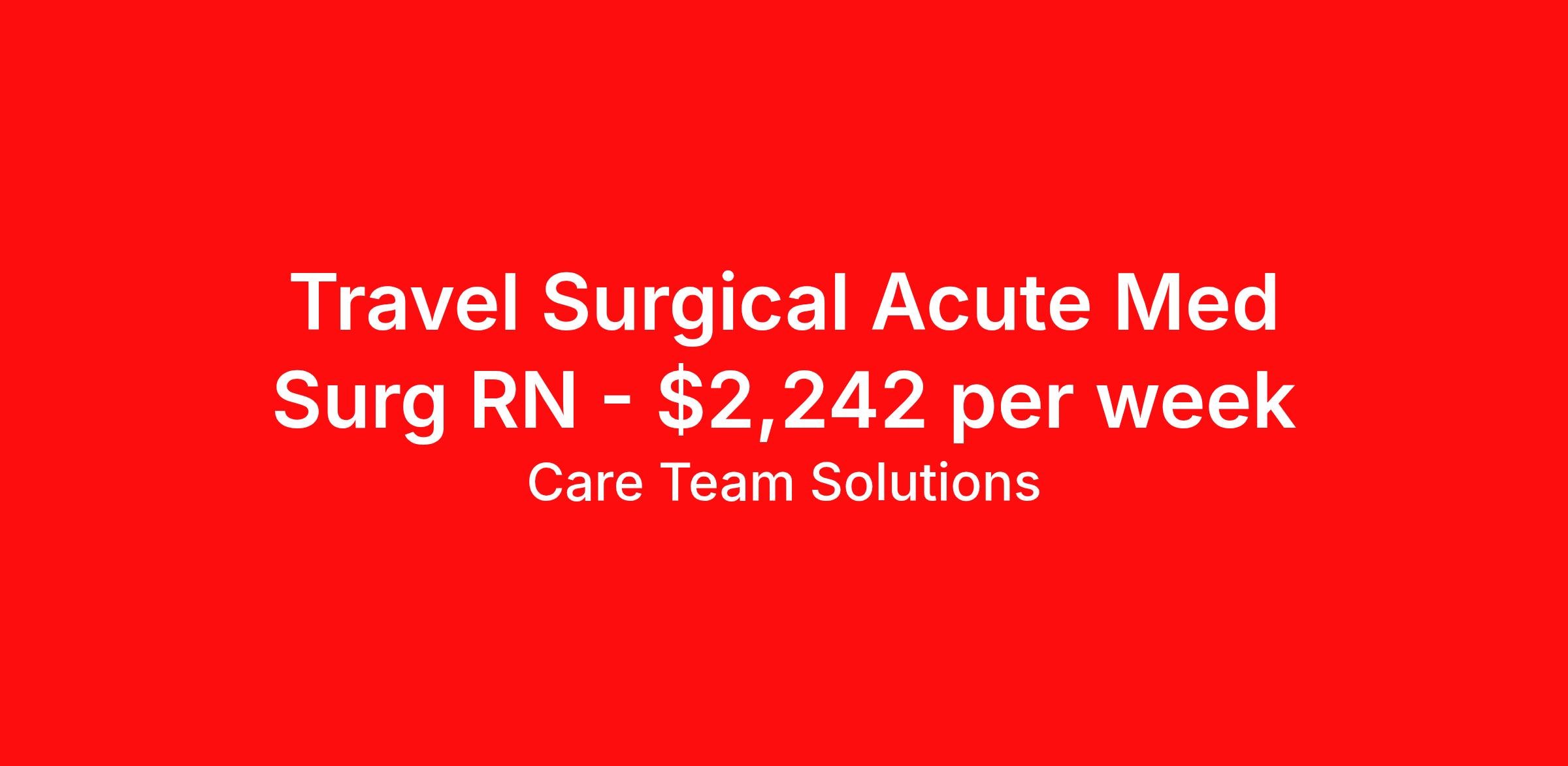 Care Team Solutions is seeking a travel nurse RN Med Surg for a travel nursing job in Peoria, Illinois. Job Description & Requirements Specialty: Med Surg Discipline: RN Start Date: 03/30/2026 Duration: 13 weeks 36 hours per week Shift: 12 hours Employment Type: Travel Registered Nurse must have 2 years of recent experience in particular specialty Details: Must Have 2 Years of recent Acute experience. Specialty: Acute Discipline: Registered Nurse Start Date: 2026-03-30 Duration: 13 Weeks Shift: 12 Hours Overnight shift. Hours Per Week: 36 Hours Employment Type: Contract Gross Weekly Pay: $2241.81 Six things that won’t happen if you apply to this job: You won’t have to guess what the downsides are. We’ll tell you up front. You won’t show up on day 1 and find out this is not what you signed up for. We won't leave your phone call ringing when it's inconvenient. Business hours for you are business hours for us. You won’t get shuffled to some customer service rep when a problem pops up. If we screw up something in securing your placement, we'll own it. That means it's on us to make it right. You won’t figure out your credentials alone. Our credentialing experts will walk you through it step by step. We've talked to thousands of travel nurses like you. We know you want good pay. You want to choose when you work. But the one thing nurse after nurse has said they want and don't have is someone in their corner. There's a lot in this business that’s messed up. We’re trying to be the people that fix it. You and every nurse with the guts to travel deserve it. We've worked hard for you to enjoy some one-of-a-kind benefits you'll not likely find anywhere else, because they benefit you more than they benefit us: Our early pay program Student loan reimbursement Free well-being tele-visits with a psychologist Care Team Solutions Job ID 586684. Pay package is based on 12 hour shifts and 36 hours per week (subject to confirmation) with tax-free stipend amount to be determined. Posted job title: Registered Nurse-Acute About Care Team Solutions Two brothers who give an enormous damn. We're Justin and Kyle. Neither of us are nurses. It doesn’t take a nurse to see that the way travel nurses are treated sucks. Nursing is already hard enough. Travel nursing takes serious guts. You get the toughest assignments in places you’ve never been. Which can be fun, but it’s also stressful. You’re in your element but outside of your hometown. You can be a stranger on the team. If anyone deserves someone in their corner, it’s you. But that’s not how most agencies operate. Which is why travel nurses hate working with them. We got into this business because we saw bucket-loads of nurses moving through the "churn and burn" travel machinery. We absolutely hate that. You'll do your best work when you have the placements you want and feel fully supported in your work. We pay our people well because we want them to treat you well. Our recruiters are amazing (we picked each of them ourselves), but if you've got a problem too big for them, they can come straight to us. We work like ten feet away. The "Churners and Burners" promise you the same benefits. They might as well copy/paste them from each other. We have them too: 401k, holiday pay, healthcare, dental, travel reimbursement, etc But we've worked hard for you to enjoy some one-of-a-kind benefits you'll not likely find anywhere else, because they benefit you more than they benefit us: Our early pay program Student loan reimbursement Free well-being tele-visits with a psychologist Benefits Weekly pay Holiday Pay Guaranteed Hours 401k retirement plan Wellness and fitness programs Referral bonus Medical benefits Dental benefits Vision benefits School loan reimbursement