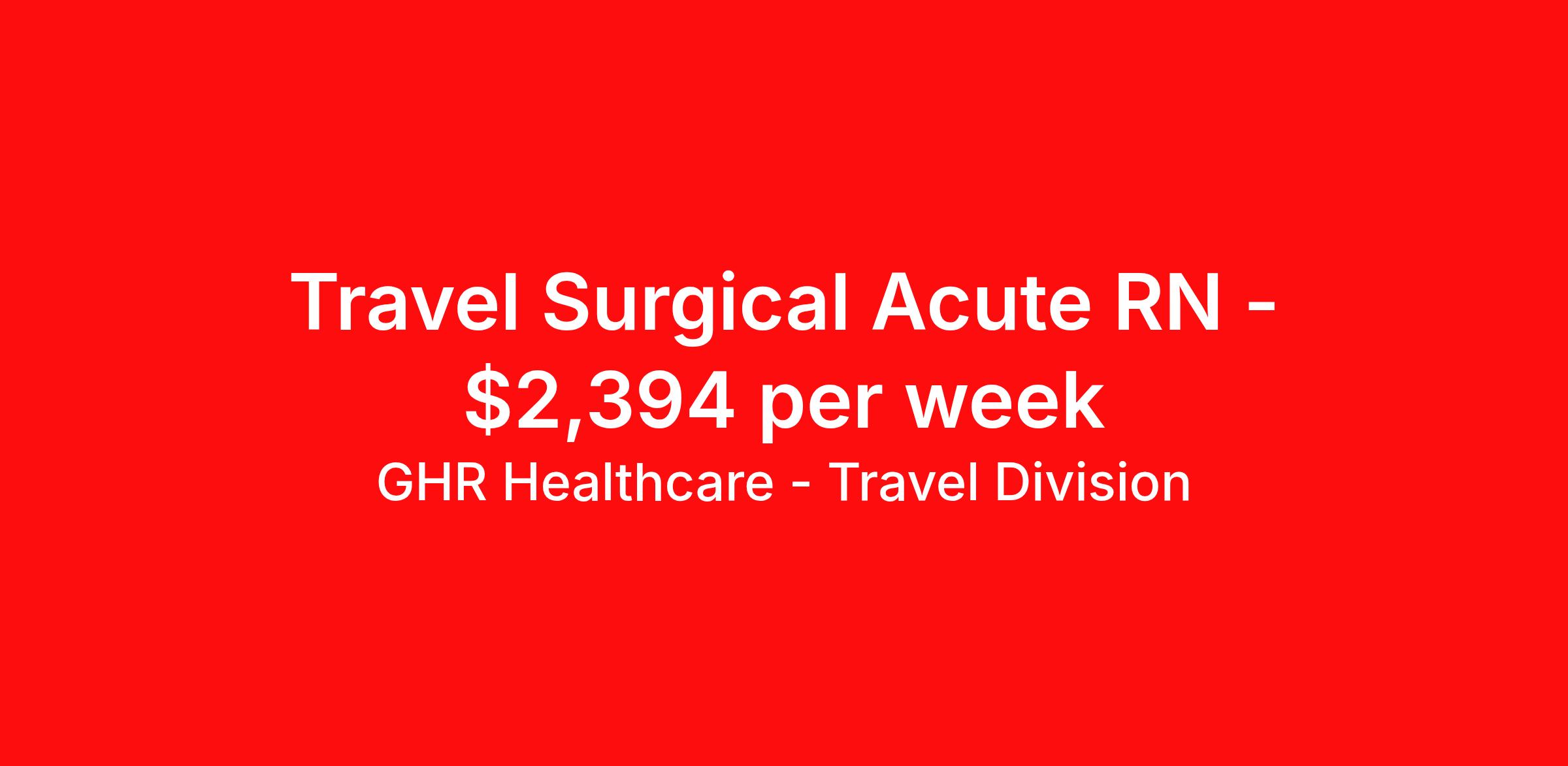 GHR Healthcare - Travel Division is seeking a travel nurse RN Med Surg for a travel nursing job in Peoria, Illinois. Job Description & Requirements Specialty: Med Surg Discipline: RN Start Date: 03/30/2026 Duration: 13 weeks 36 hours per week Shift: 12 hours Employment Type: Travel GHR Healthcare - Travel Division Job ID 76343723. Pay package is based on 12 hour shifts and 36 hours per week (subject to confirmation) with tax-free stipend amount to be determined. About GHR Healthcare - Travel Division For over 30 years, GHR Healthcare has been the bridge between healthcare professionals and the facilities that need them nationwide. We're committed to uncovering your ideal fit, supported by GHR's dedication to competitive compensation, transparent communication, and a devoted team that genuinely cares about your career journey. You can trust us to stand by your side as your advocate, confidante, and partner in advancing your career. At GHR, care and consideration are at the heart of everything we do. Visit ghrhealthcare.com to learn more.