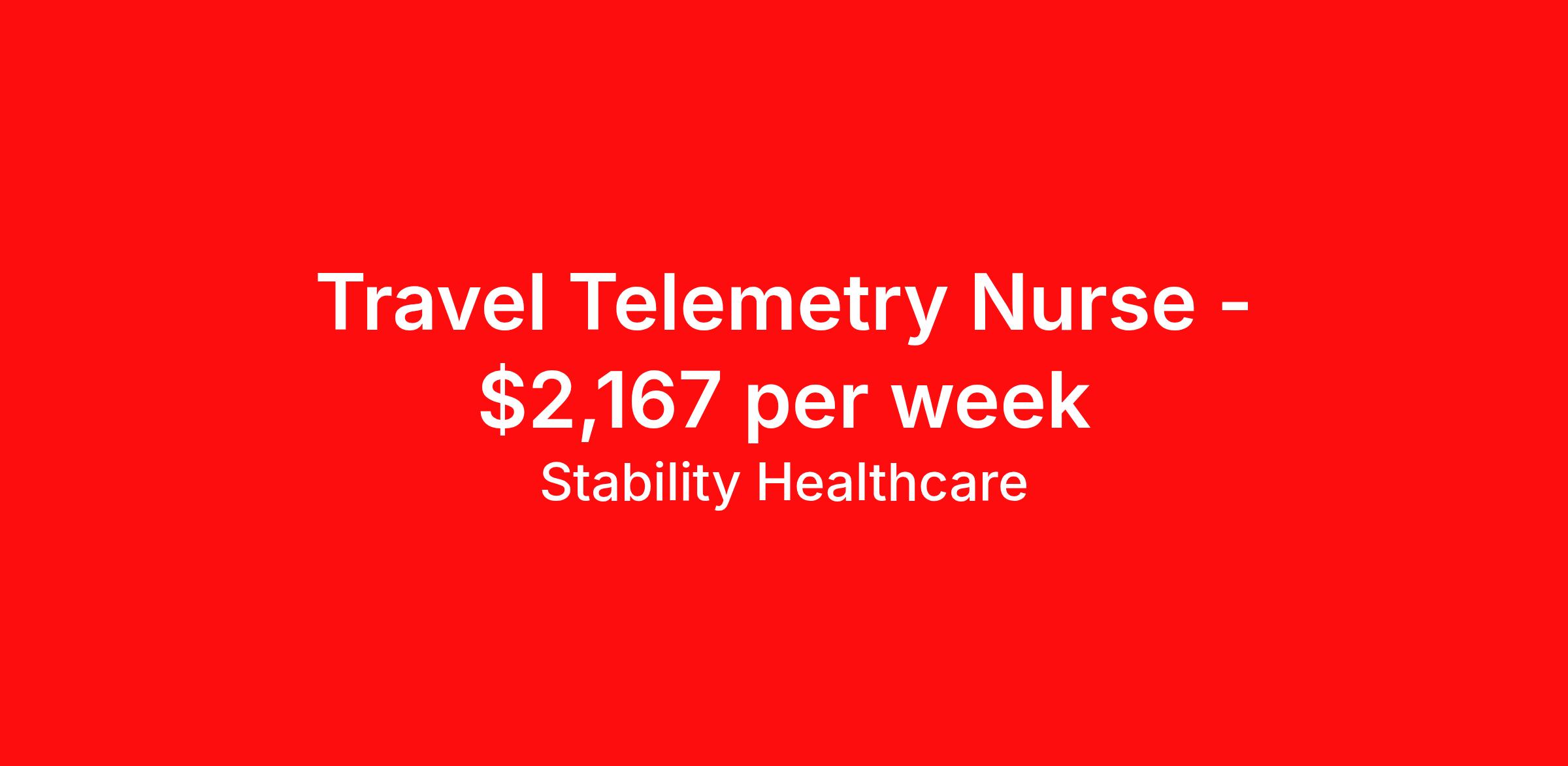 Stability Healthcare is seeking a travel nurse RN Telemetry Med Surg for a travel nursing job in Springfield, Illinois. Job Description & Requirements Specialty: Telemetry Discipline: RN Start Date: 04/13/2026 Duration: 13 weeks 36 hours per week Shift: 12 hours, nights Employment Type: Travel Stability Healthcare is looking for a Telemetry RN contract position in Springfield, IL. Telemetry nurses care for patients by using medical equipment to monitor blood pressure, heart rate, blood oxygen level, breathing rate, and other vital signs. Commonly, these patients have recently undergone surgery. *$600 travel bonus *Day 1 health insurance with United Healthcare *PTO plan start accruing on day 1, use during contract or cash out at the end! *Guaranteed stipend if facility calls you off *Extra hour bonus earn an additional hourly bonus for working over your weekly contracted hours Stability Job ID 786491. Pay package is based on 12 hour shifts and 36 hours per week (subject to confirmation) with tax-free stipend amount to be determined. Posted job title: Telemetry About Stability Healthcare Stability Healthcare was founded in 2009, with the mission of becoming the best Travel Nursing Agency in California. We have been rated one of the top travel nursing agencies and offer our nurses the highest paying travel nursing jobs available. We have access to the best travel assignments from 1000’s of facilities. You can start the year off in sunny California, spend the Spring in the Colorado Rockies, enjoy the Summer in the Mid-West, experience the change of seasons in Boston and New York, and hit the beaches of Florida in the winter. Our Nurses work in the best hospitals and health systems in the country. Benefits Guaranteed Hours Benefits start day 1