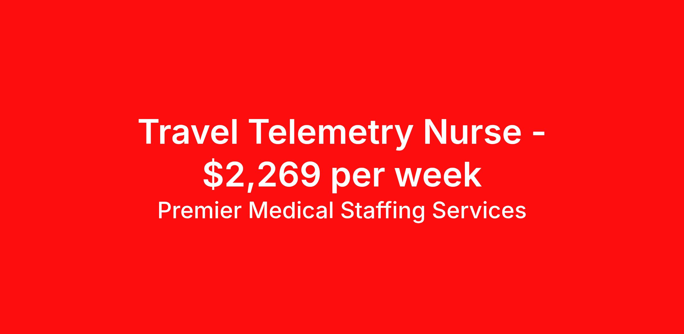 Premier Medical Staffing Services is seeking a travel nurse RN Med Surg / Telemetry for a travel nursing job in Springfield, Illinois. Job Description & Requirements Specialty: Med Surg / Telemetry Discipline: RN Start Date: 04/13/2026 Duration: 12 weeks 36 hours per week Shift: 12 hours Employment Type: Travel Premier Medical Staffing Job ID 596148. Pay package is based on 12 hour shifts and 36 hours per week (subject to confirmation) with tax-free stipend amount to be determined. Posted job title: RN Tele Med/Surg About Premier Medical Staffing Services Premier Medical Staffing Services, LLC is a nationally expanding healthcare staffing firm for healthcare professionals and companies. We understand our clients’ need for highly qualified, expertly trained medical professionals and are passionate about helping clinicians find employment opportunities that fit their personality and needs. Able to accommodate the ever-changing needs of the healthcare landscape, we offer per-diem, contract and direct hire placements to support the unique needs of each industry sector. Premier Medical Staffing Services is Joint Commission Certified, a Military Spouse Employment Partner and is certified as a Women’s Business Enterprise. We are proudly nurse owned.