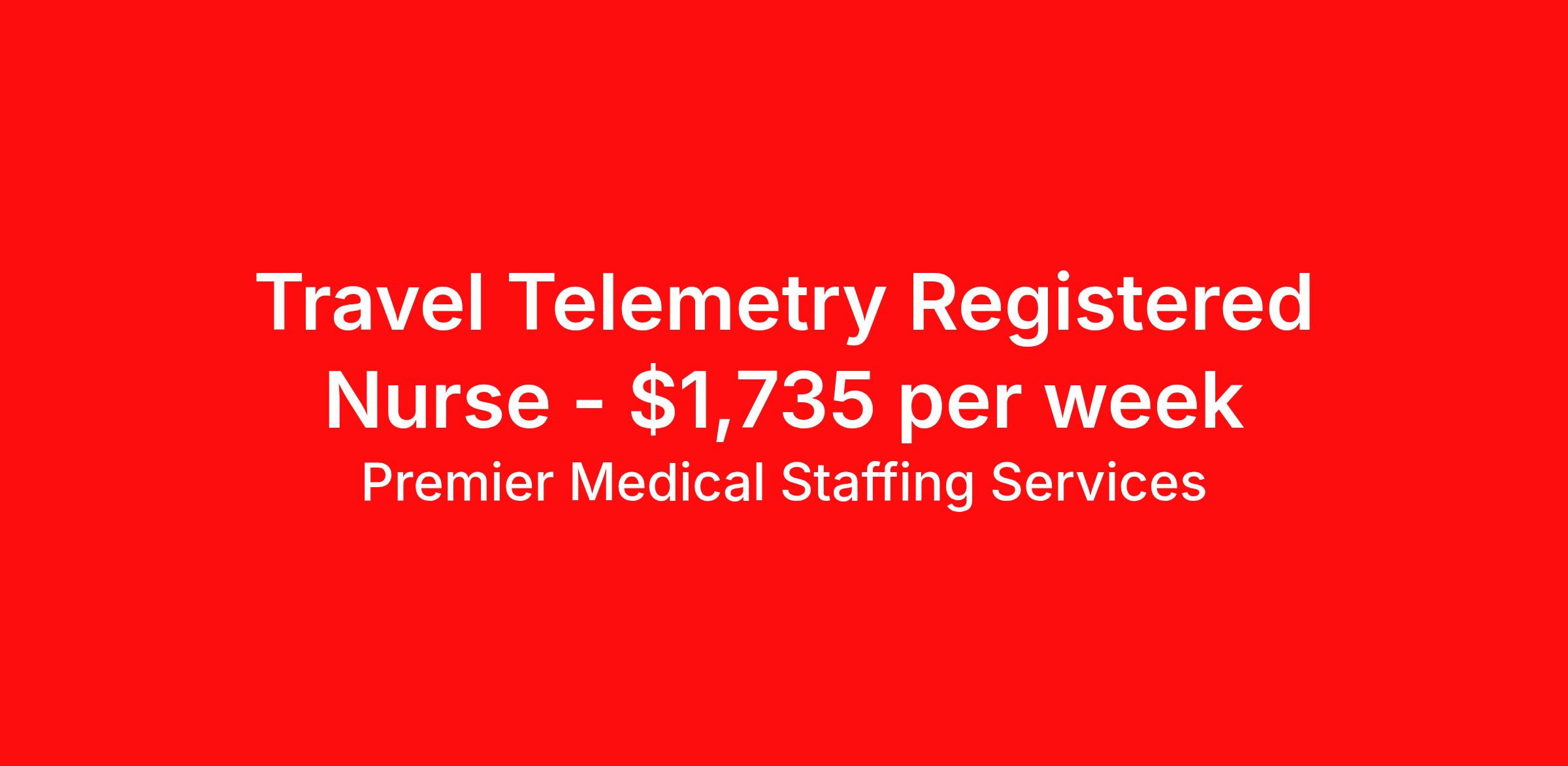 Premier Medical Staffing Services is seeking a travel nurse RN Med Surg / Telemetry for a travel nursing job in Columbia, South Carolina. Job Description & Requirements Specialty: Med Surg / Telemetry Discipline: RN Start Date: 04/13/2026 Duration: 13 weeks 36 hours per week Shift: 12 hours Employment Type: Travel Premier Medical Staffing Job ID 626422. Pay package is based on 12 hour shifts and 36 hours per week (subject to confirmation) with tax-free stipend amount to be determined. Posted job title: RN Tele Med/Surg About Premier Medical Staffing Services Premier Medical Staffing Services, LLC is a nationally expanding healthcare staffing firm for healthcare professionals and companies. We understand our clients’ need for highly qualified, expertly trained medical professionals and are passionate about helping clinicians find employment opportunities that fit their personality and needs. Able to accommodate the ever-changing needs of the healthcare landscape, we offer per-diem, contract and direct hire placements to support the unique needs of each industry sector. Premier Medical Staffing Services is Joint Commission Certified, a Military Spouse Employment Partner and is certified as a Women’s Business Enterprise. We are proudly nurse owned.