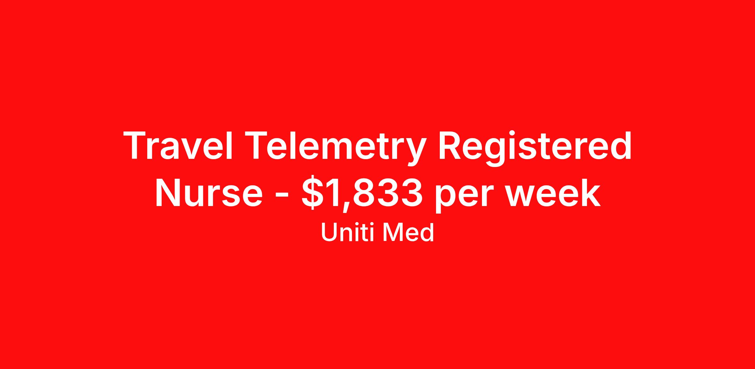 Uniti Med is seeking a travel nurse RN Telemetry for a travel nursing job in Jeffersonville, Indiana. Job Description & Requirements Specialty: Telemetry Discipline: RN Start Date: 04/05/2026 Duration: 13 weeks 36 hours per week Shift: 12 hours, days Employment Type: Travel Benefits: Day 1 Insurance Cigna medical, MetLife dental and vision insurance License reimbursement for new licenses needed for each assignment Discounts with hotels and rental cars A dedicated recruiter and support team that will help you every step of the way to sure you start on time and have an exceptional experience Referral bonus up to $700 About the Company: Finding the right role is about more than just matching skills to a job—it’s about aligning with your goals, values, and the way you want to work. As an award-winning talent partner, we support healthcare professionals through every step of that process, offering meaningful opportunities, clear guidance, and long-term partnership. From our first conversation to your first day on the job (and beyond!), we’re here to help you move forward with confidence. UnitiMed Job ID 785981. Pay package is based on 12 hour shifts and 36 hours per week (subject to confirmation) with tax-free stipend amount to be determined. Posted job title: Registered Nurse (RN) About Uniti Med Uniti Med meticulously matches your talents to our open needs to ensure the ultimate travel experience. Tell us where you want to go and let our experienced staff lead the way! Benefits Referral bonus Benefits start day 1 Employee assistance programs