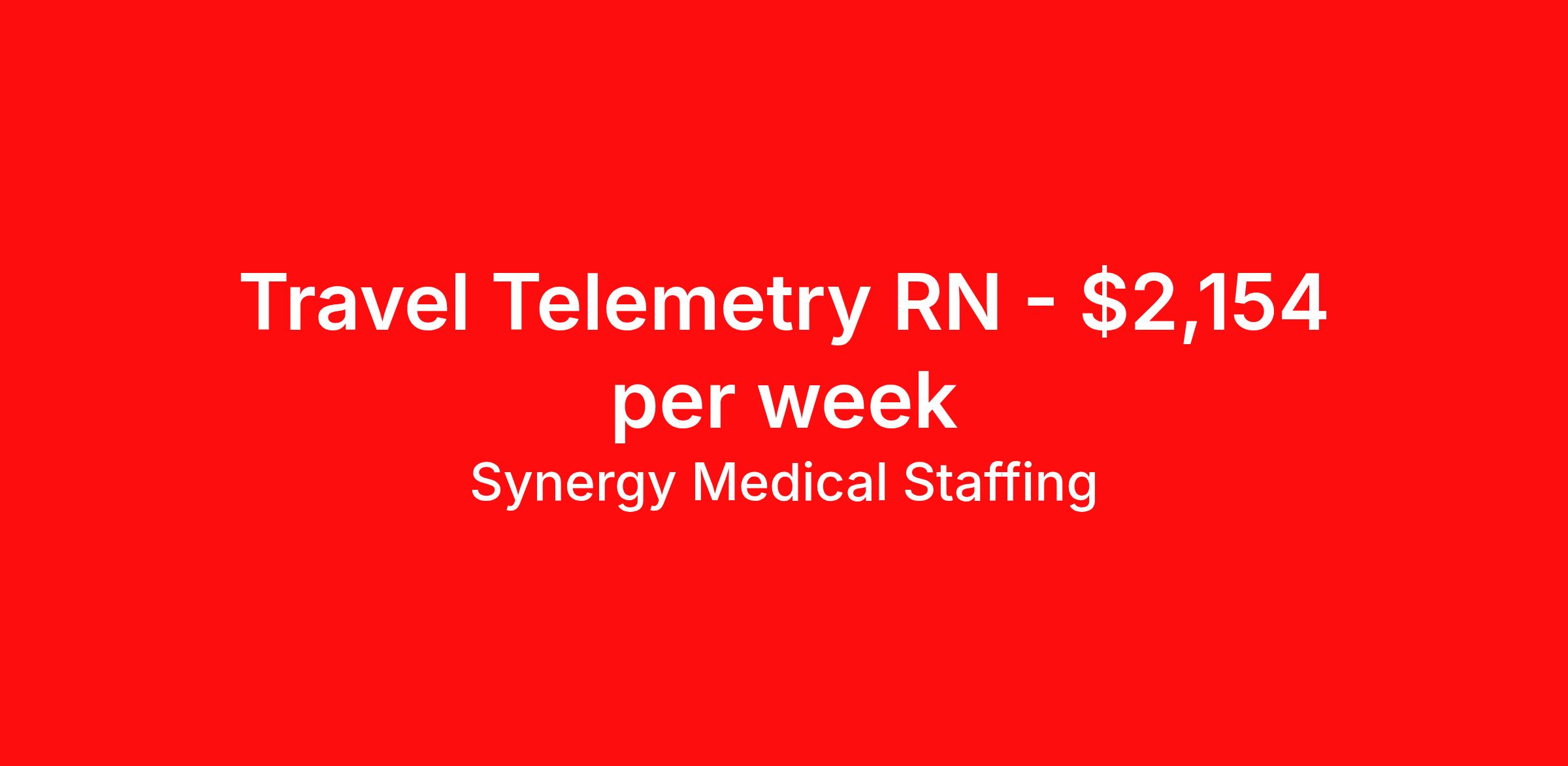 Synergy Medical Staffing is seeking a travel nurse RN Telemetry for a travel nursing job in Hartford, Connecticut. Job Description & Requirements Specialty: Telemetry Discipline: RN Start Date: 04/05/2026 Duration: 13 weeks 36 hours per week Shift: 12 hours, nights Employment Type: Travel Travel, RN - Tele Location: Hartford, Connecticut Shift: 3X12 Nights, 19:00:00-07:00:00, 12.00-3 Duration 13 Weeks When you join Synergy Medical Staffing, you’ll have a dedicated recruiter helping you at all times. Your recruiter is a cross between a career coach and a concierge. They will help you fine-tune your resume, find your next job, and locate an apartment (even one that takes pets!). Make one call and get help with everything from placement to housing to payroll, even travel directions! As a travel, contract and permanent placement medical staffing company with over 20 years of experience in the industry, we understand your needs. Synergy’s Benefits are best in class and include the following: 401K that matches up to 5% of your pay and you are 100% vested from Day 1. Medical, Dental, Vision, Life insurance, Long and short-term disability and others Loyality Program Weekly pay Holiday Pay (varies by Assignment) Guaranteed Hours (varies by Assignment) Referral bonus Continuing Education License and certification reimbursement Synergy Medical Staffing Job ID 36188749. Pay package is based on 12 hour shifts and 36.0 hours per week (subject to confirmation) with tax-free stipend amount to be determined. Posted job title: RN:Tele,19:00:00-07:00:00 About Synergy Medical Staffing When you join Synergy Medical Staffing, you’ll have a dedicated recruiter helping you at all times. Your recruiter is a cross between a career coach and a concierge. They will help you fine-tune your resume, find your next job, and locate an apartment (even one that takes pets!). Make one call and get help with everything from placement to housing to payroll, even travel directions! As a travel, contract and permanent placement medical staffing company with over 12 years of experience in the industry, we understand your needs. Are you interested in traveling, or just a job around the corner? Whatever your preference, you can be sure there are plenty of Nursing Jobs, Allied Jobs and Physical Therapy Jobs, Occupational Therapy Jobs, Speech Therapy Jobs and Rehab Therapy jobs anywhere you want to go. Synergy Medical Staffing professionals have been in the Medical staffing employment and staffing industry for over 12 years, and have developed solid relationships with numerous healthcare facilities nationwide. Contact us now and expand your medical career with new opportunities from Synergy Medical Staffing. Synergy’s Benefits are best in class and include the following 401K Day 1 Full Medical, Dental, Vision, Life insurance, Long and short term disability and others Student Loan Repayment and CEU reimbursement Loyalty bonus after 600 hours Benefits Discount program Weekly pay Holiday Pay Guaranteed Hours Referral bonus Medical benefits Dental benefits Continuing Education License and certification reimbursement Life insurance 401k retirement plan Cancelation protection Vision benefits